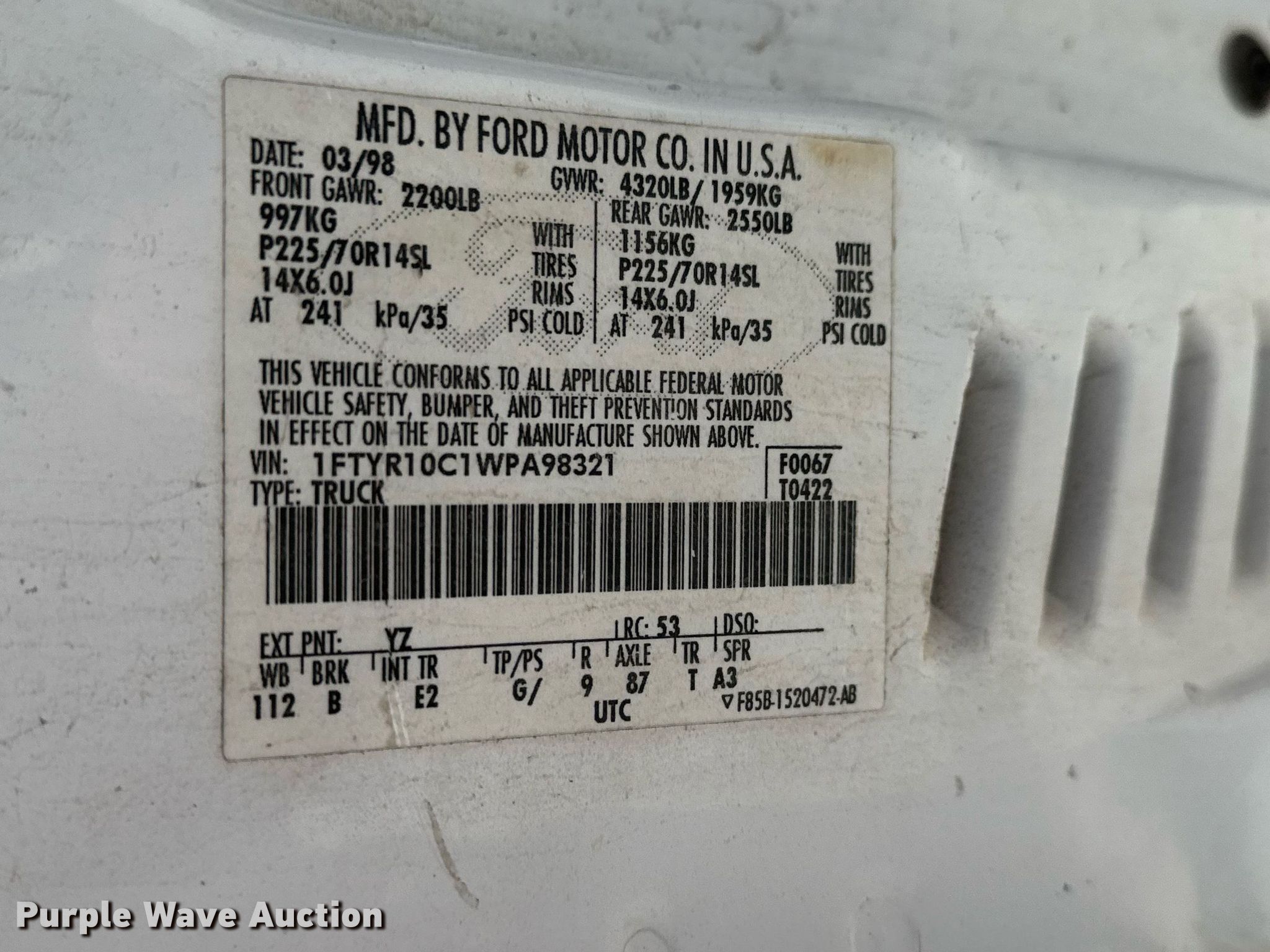 Purple Wave is selling a used Compact Pickup or Van in Kansas. This item is a 1998 Ford Ranger pickup truck with the following: Miles: 220,846 on odometer, VIN: 1FTYR10C1WPA98321