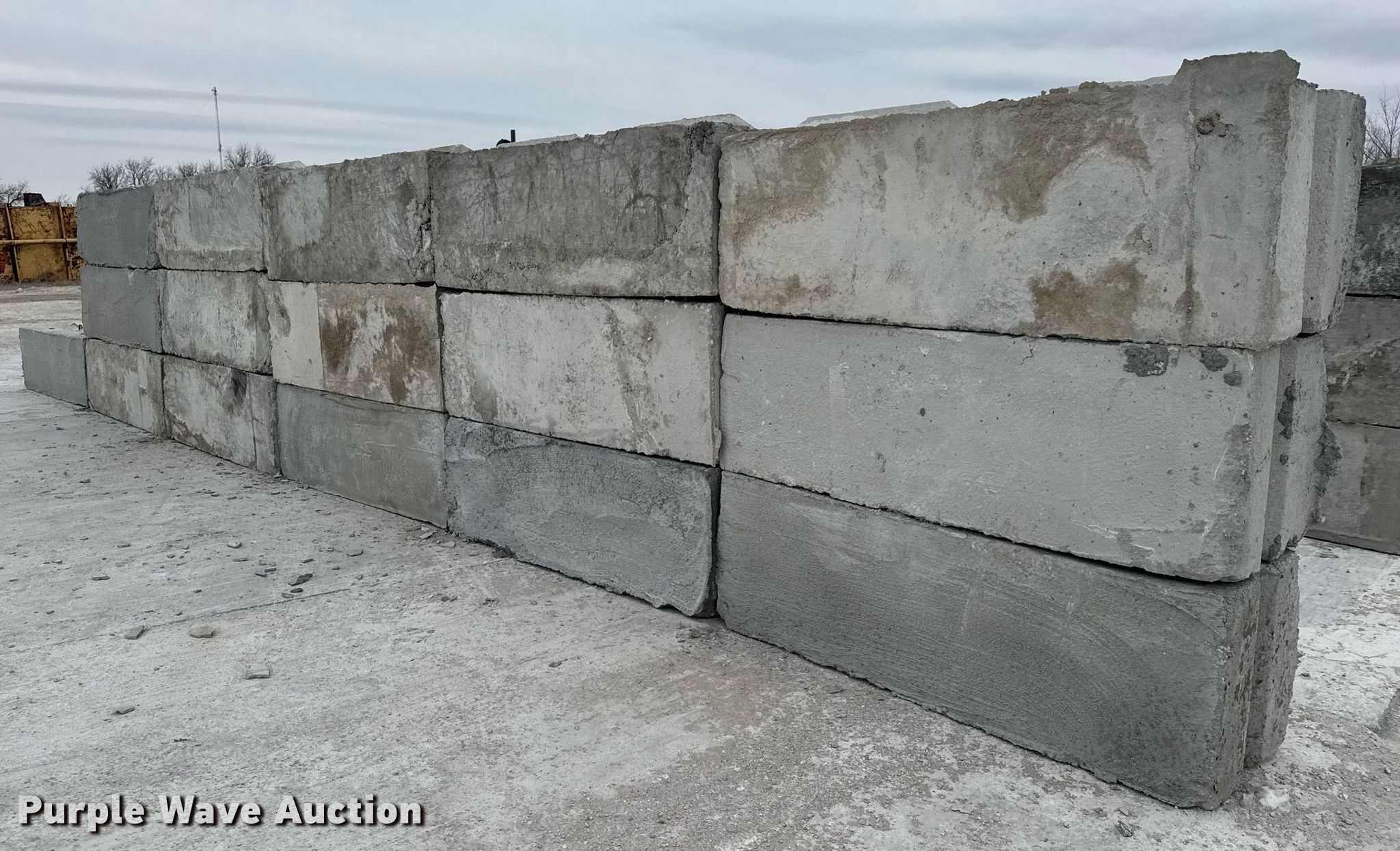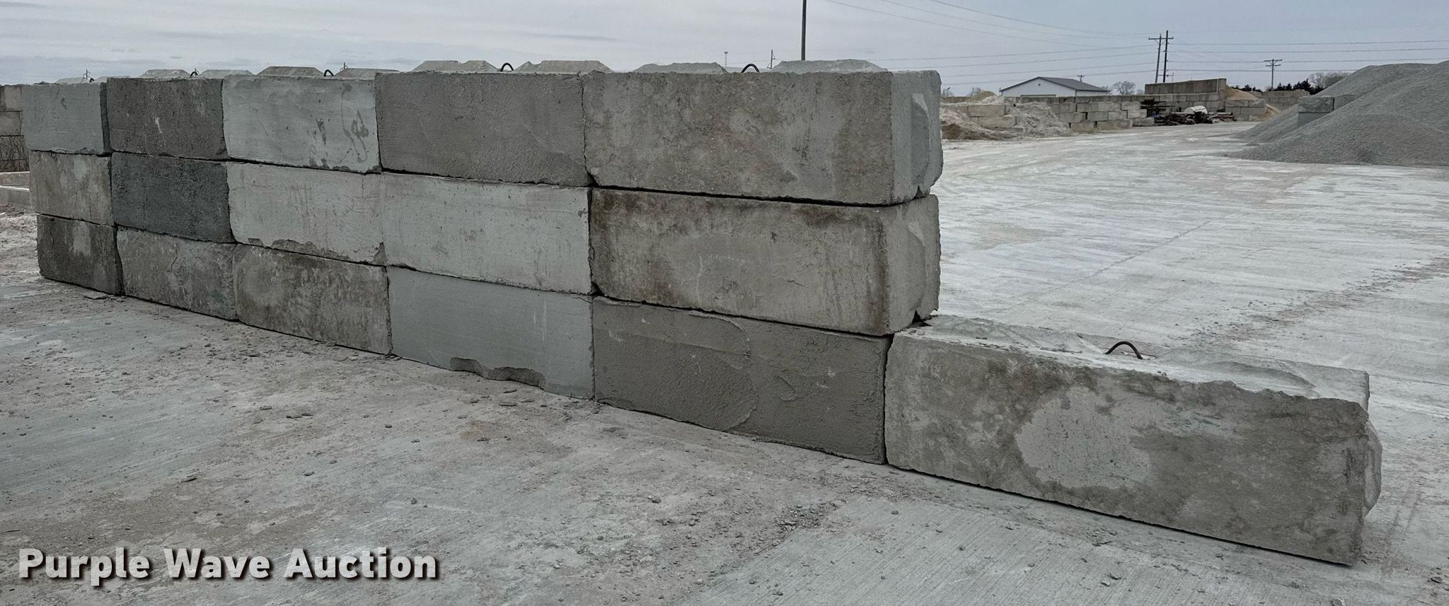 Purple Wave is selling a used Building Materials in Kansas. This item is a (16) concrete edge bunker blocks with the following: 2' x 2' x 6', Rebar lift eyelet, Keyed, Finish and condition may vary, Color: Grey, Approx. 3,200 lbs per block