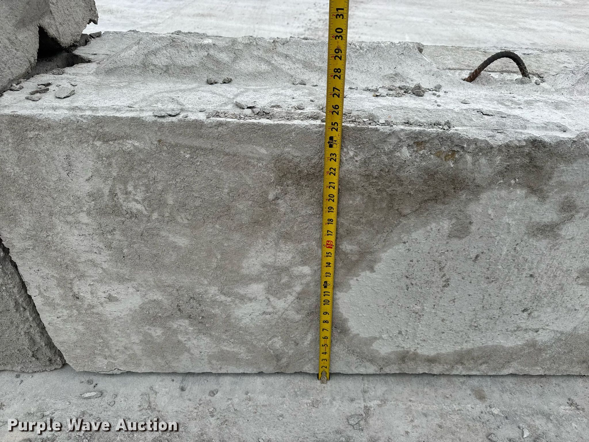 (16) concrete edge bunker blocks. 2' x 2' x 6', Rebar lift eyelet, Keyed, Finish and condition may vary, Color: Grey, Approx. 3,200 lbs per block. Representative photo. Builders Concrete & Supply. Hesston, KS 67062