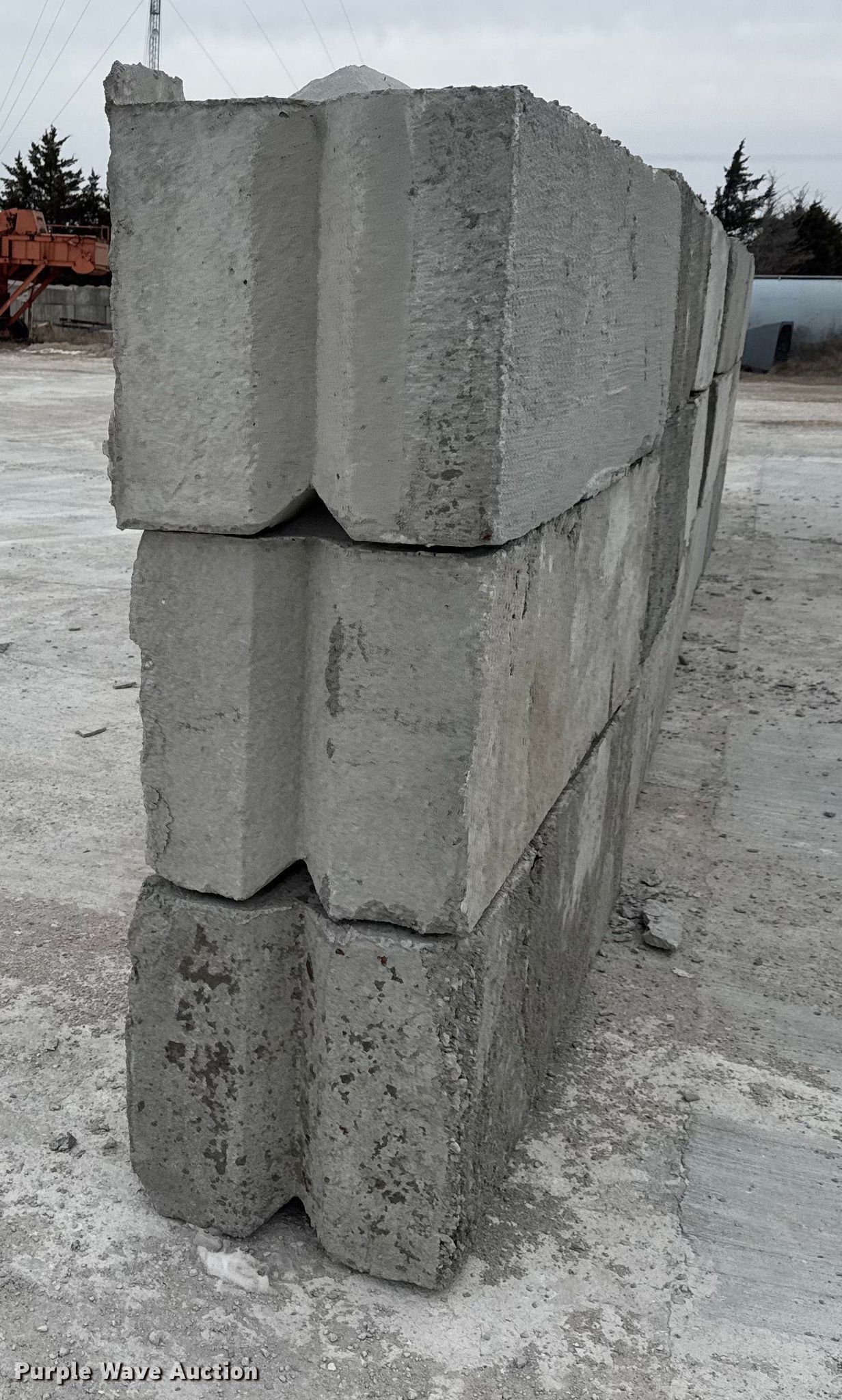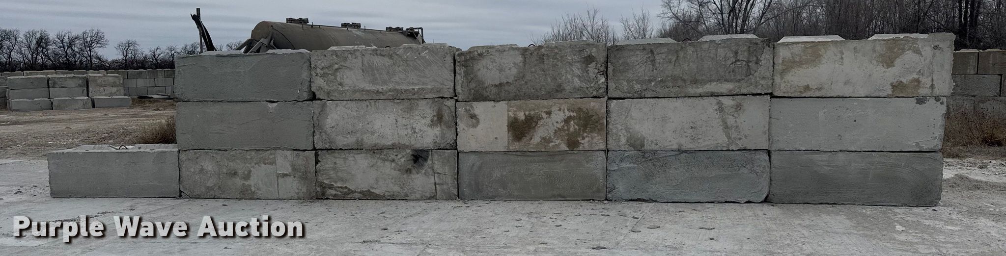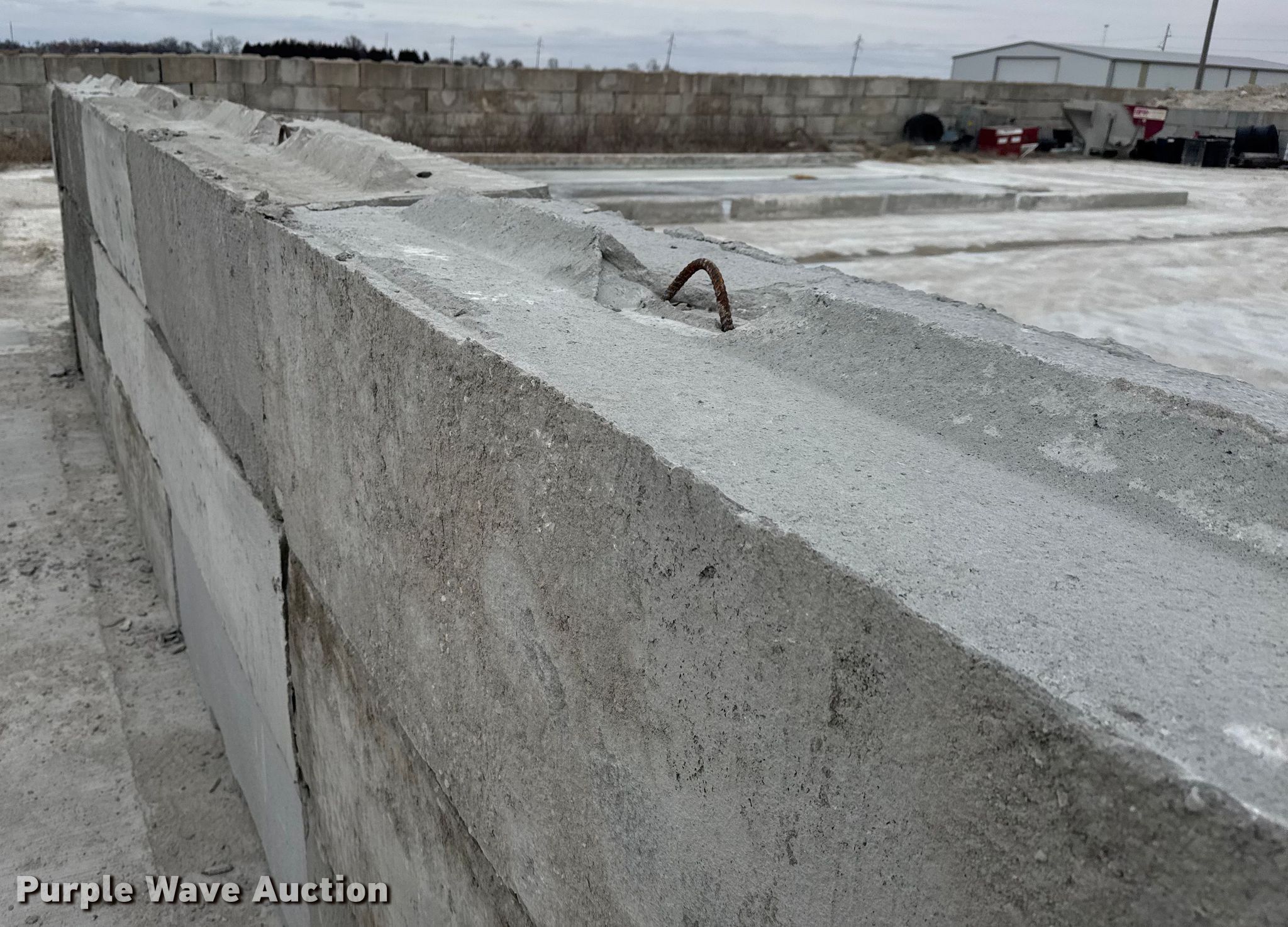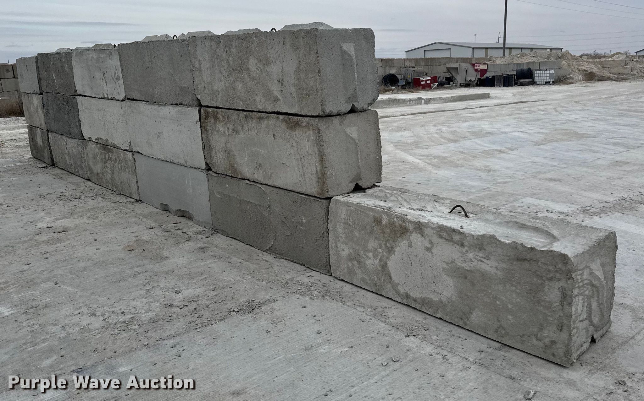 Purple Wave is selling a used Building Materials in Kansas. This item is a (16) concrete edge bunker blocks with the following: 2' x 2' x 6', Rebar lift eyelet, Keyed, Finish and condition may vary, Color: Grey, Approx. 3,200 lbs per block