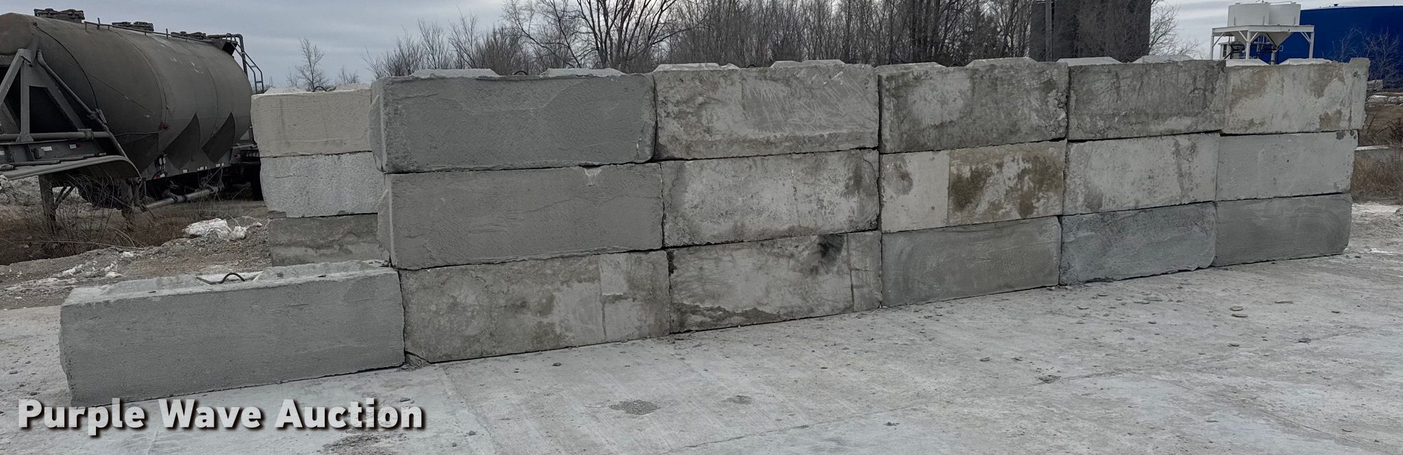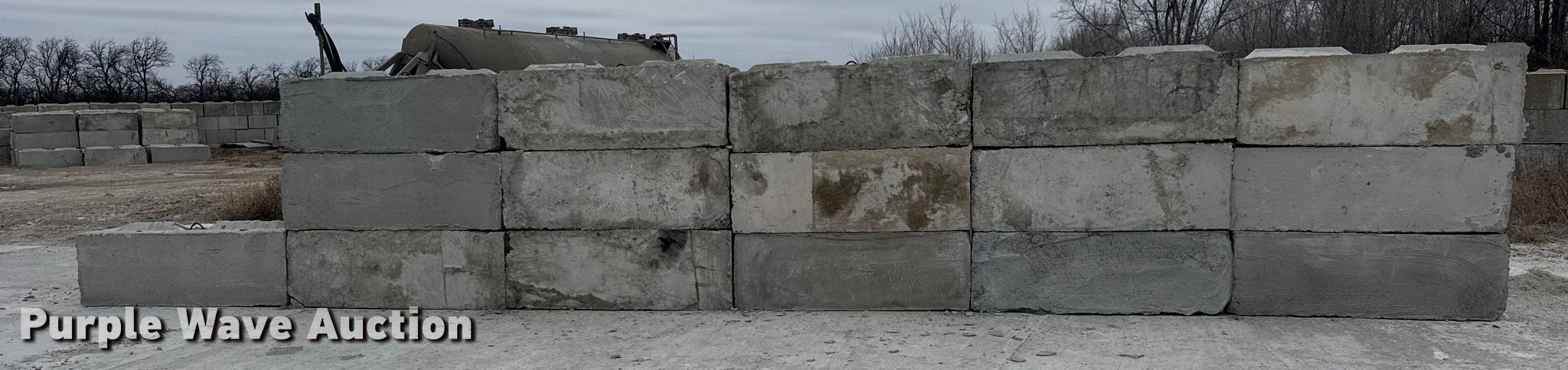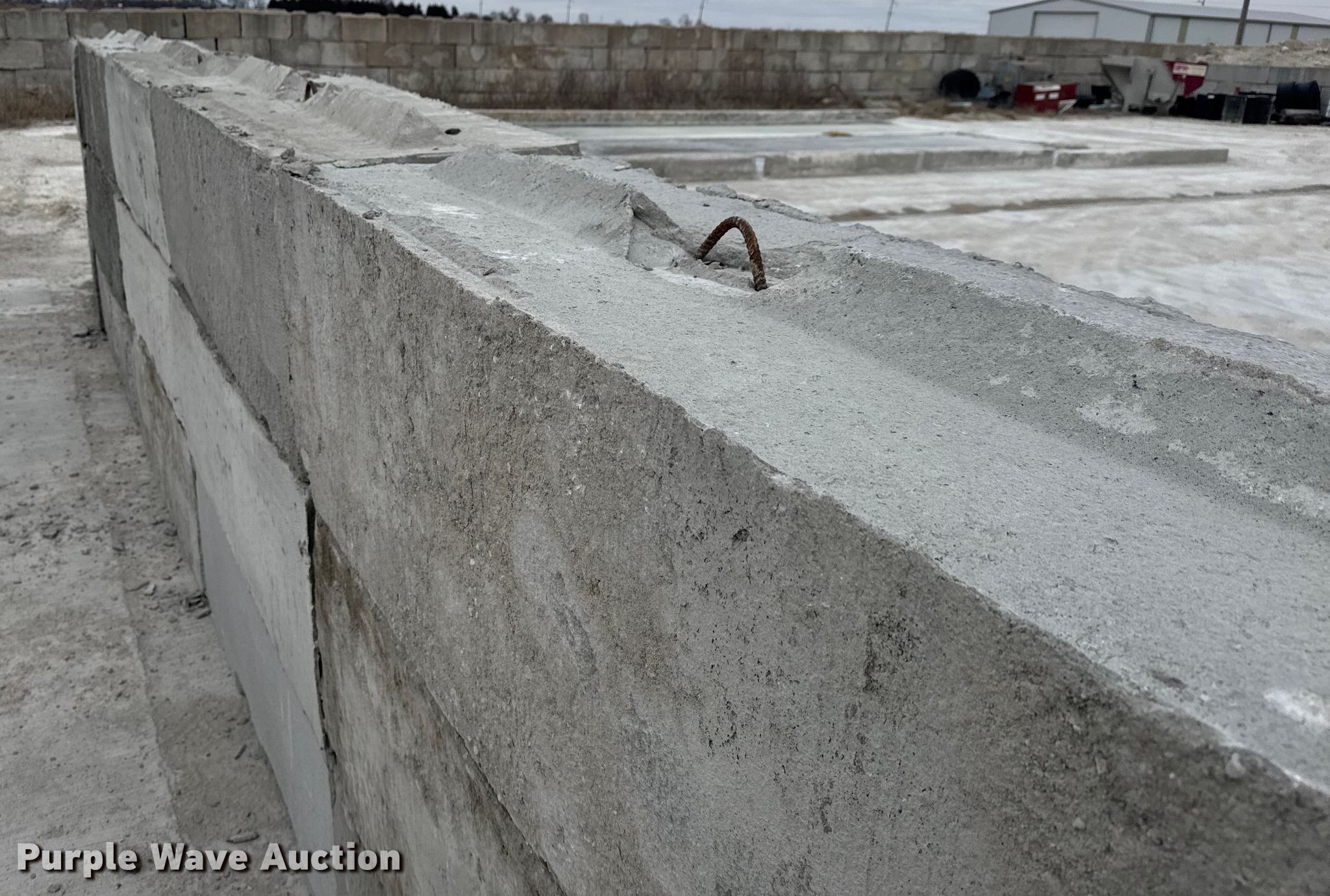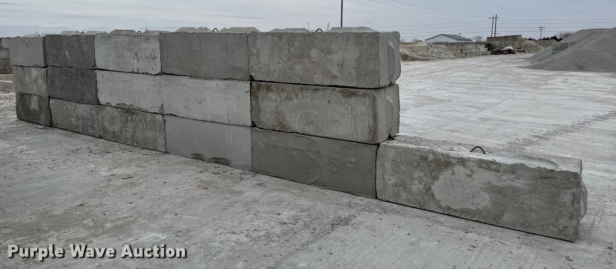 Purple Wave is selling a used Building Materials in Kansas. This item is a (16) concrete edge bunker blocks with the following: 2' x 2' x 6', Rebar lift eyelet, Keyed, Finish and condition may vary, Color: Grey, Approx. 3,200 lbs per block