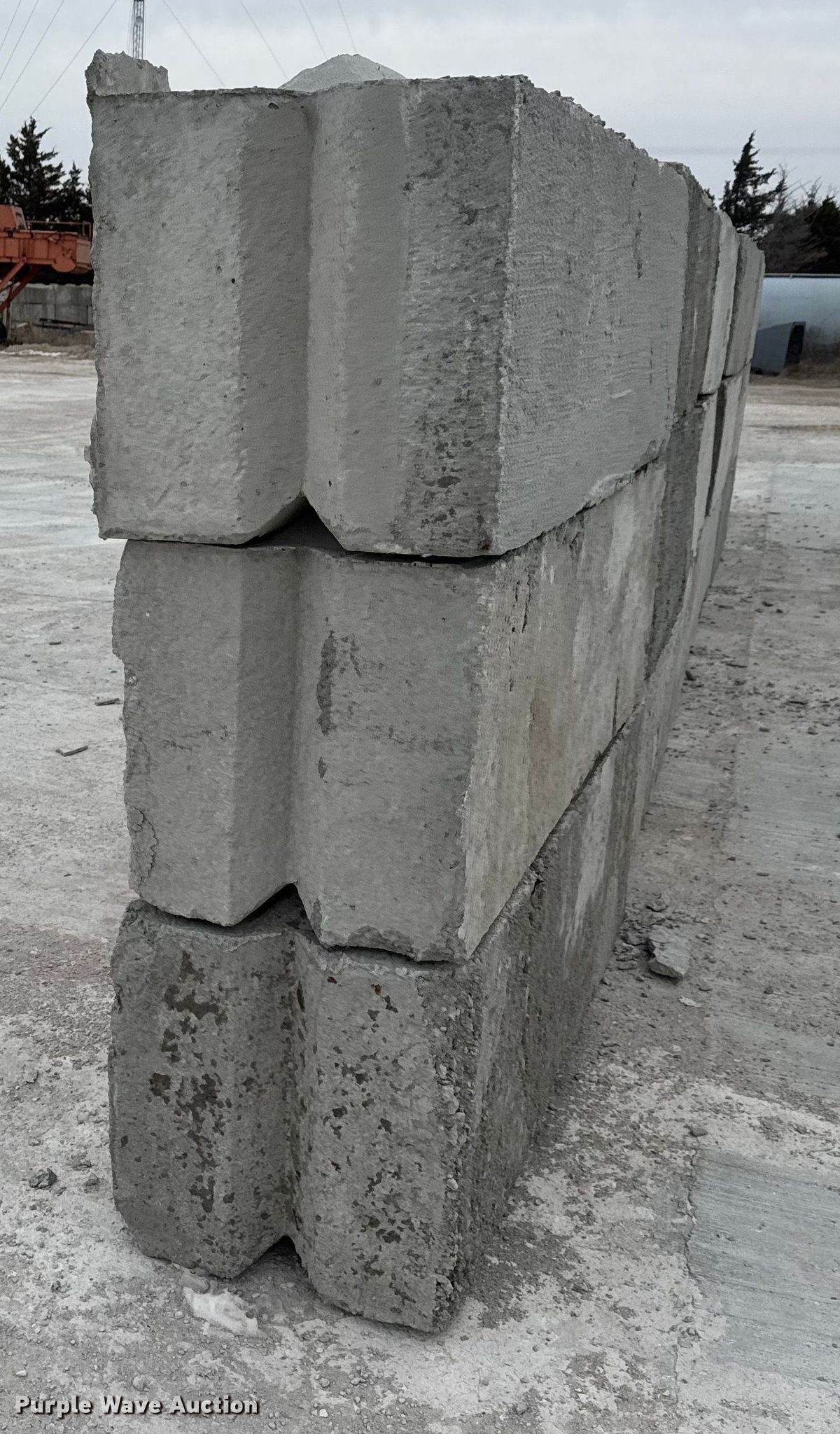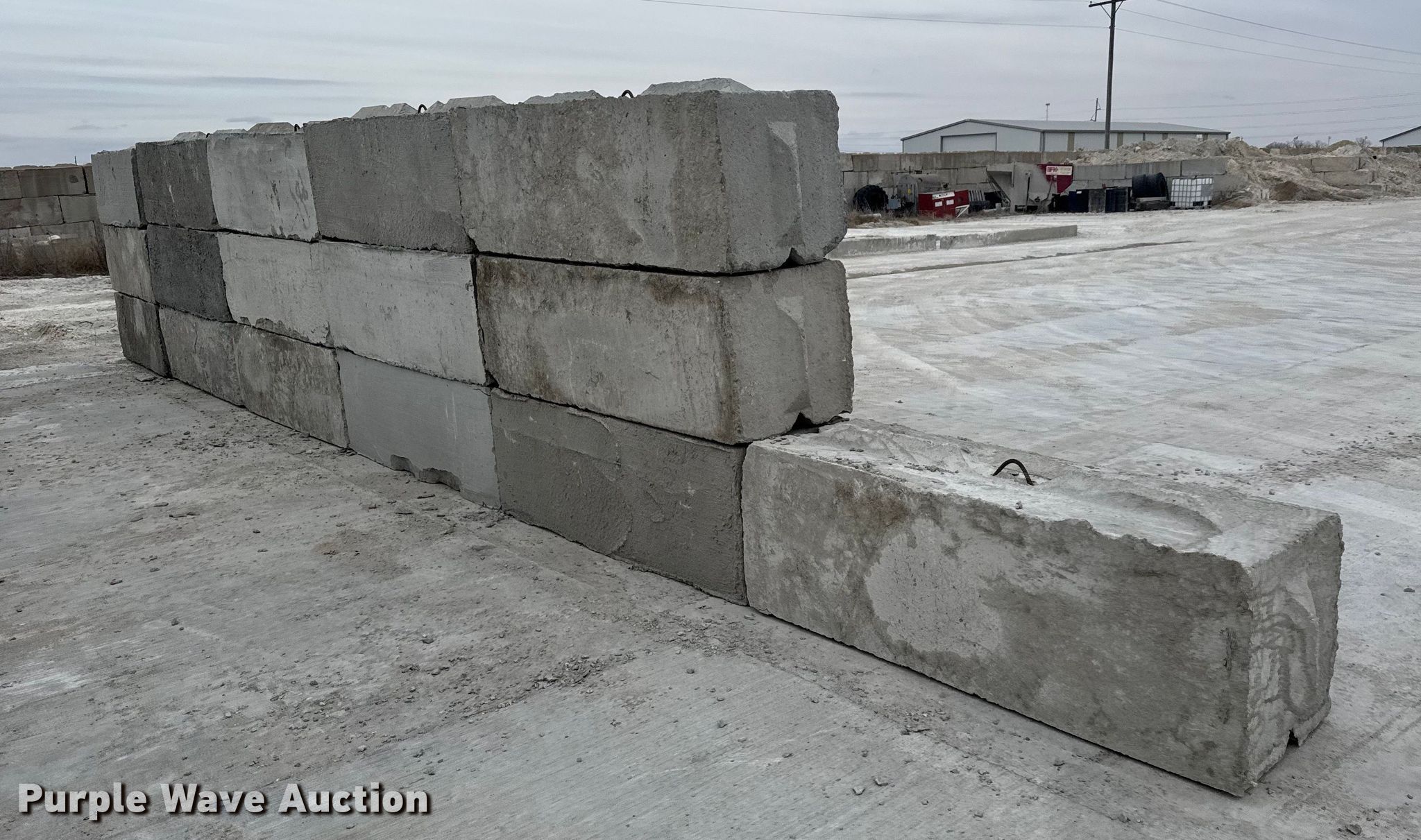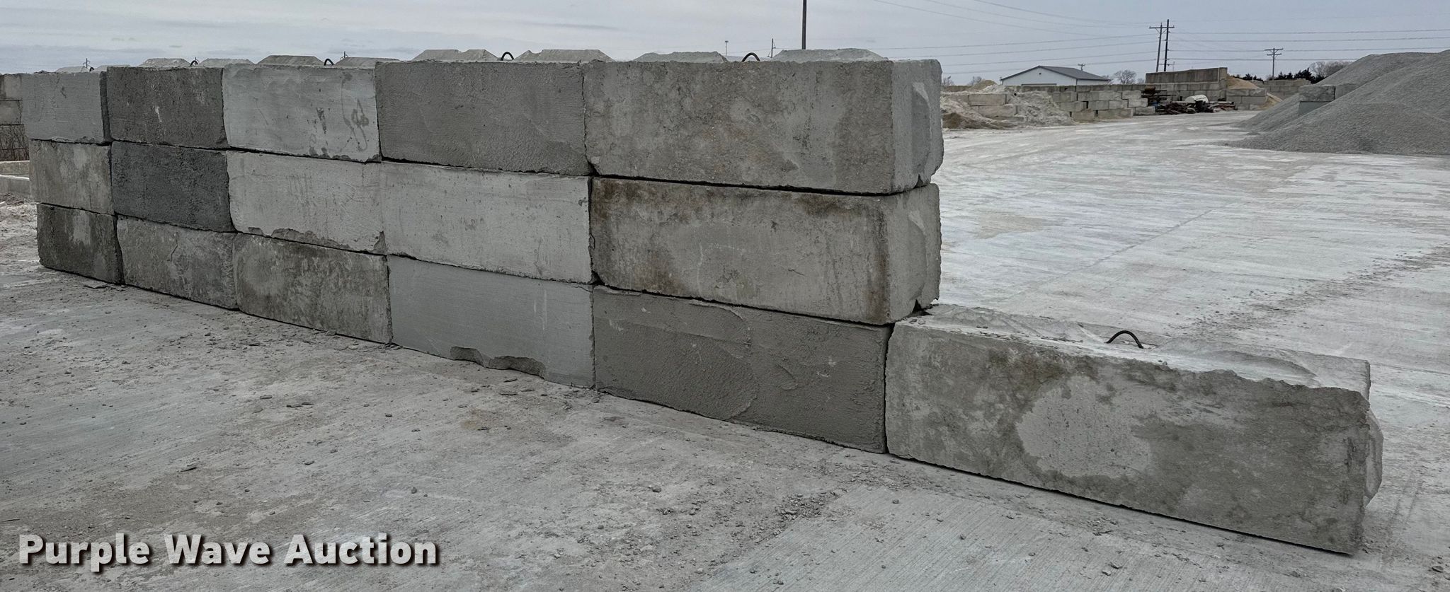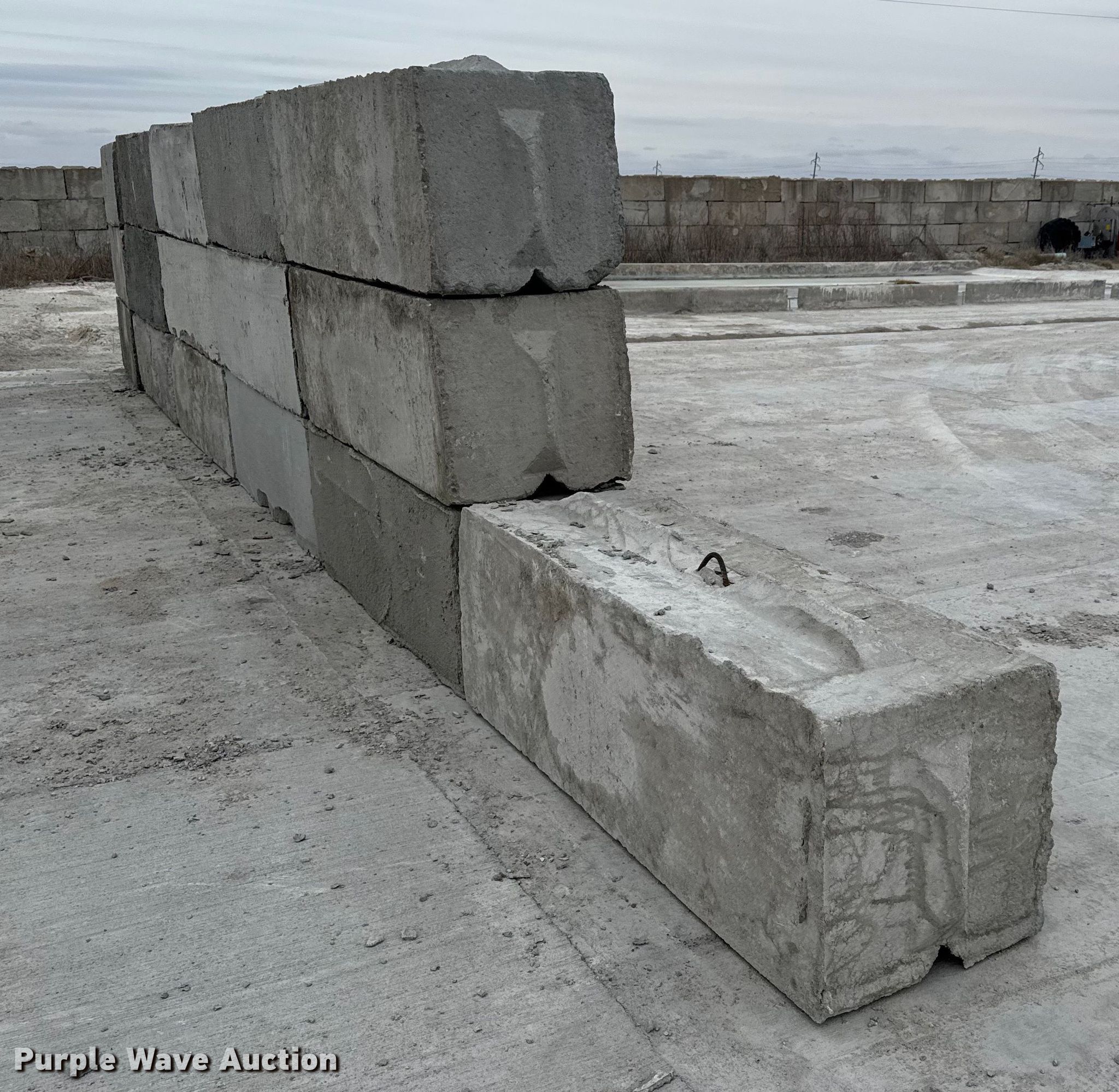 Purple Wave is selling a used Building Materials in Kansas. This item is a (16) concrete edge bunker blocks with the following: 2' x 2' x 6', Rebar lift eyelet, Keyed, Finish and condition may vary, Color: Grey, Approx. 3,200 lbs per block