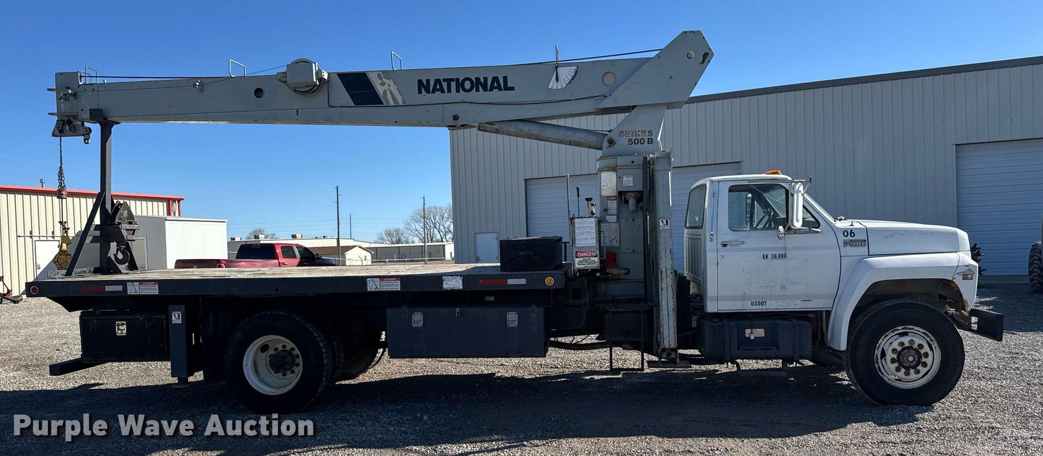 1990 Ford F800 crane truck. Miles: 51,358 on odometer, Hours: 1,880 on meter Actual hours unknown, VIN: 1FDPK84P7LVA23342, Unit #: 06. Engine Ford 170, Displacement: 6.6L, Cylinders: 6, Fuel type: Diesel. Transmission Manual, Speed: 5, plus 2. Chassis Axles: Single, Suspension: Spring, Brakes: Hydraulic, PTO, GVWR: 31,800 lbs, Wheelbase: 238". Interior Heat. Features Flatbed 18' L x 96" W, Crane National 556B Serial: 21558, Telescopic, Maximum boom length: 56' Sections: 3, Maximum lift capacity: 25,000 lbs, Boom controls Ground, Crane block, Manuals, Lift chart. Tires Front: 10.00R20, Rear: 11R22.5. Notes Hour meter replaced, Non-operational fuel gauge. Kansas title. Title distribution may be delayed up to 14 days from verification of funds. Sharp Construction, LLC Retirement. Valley Center, KS 67147