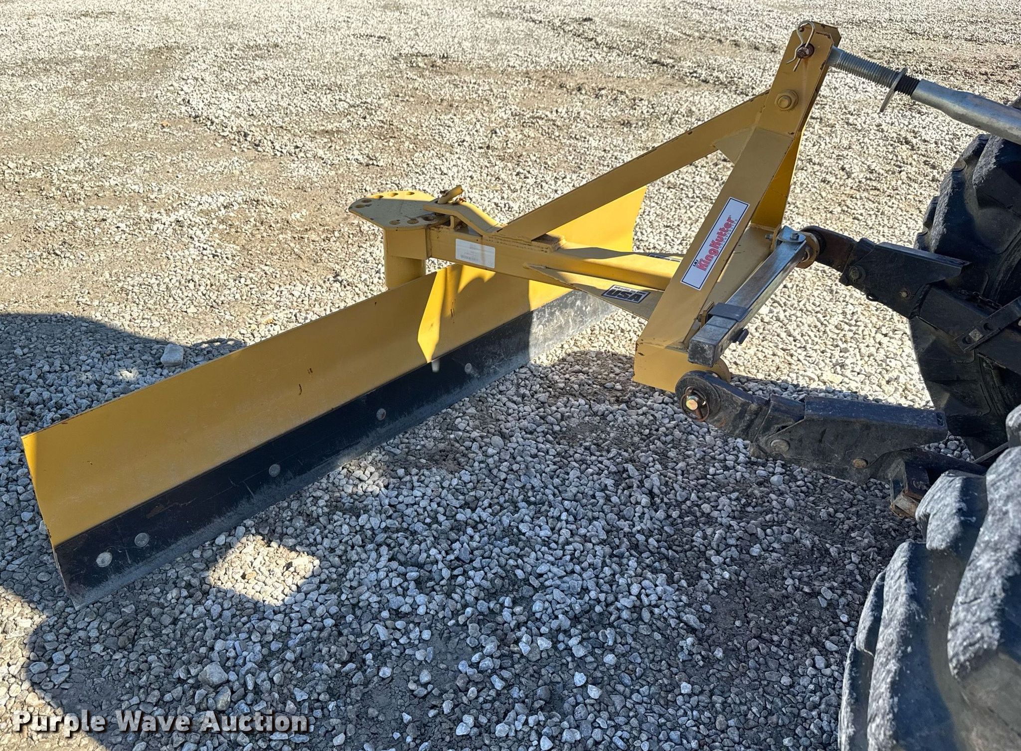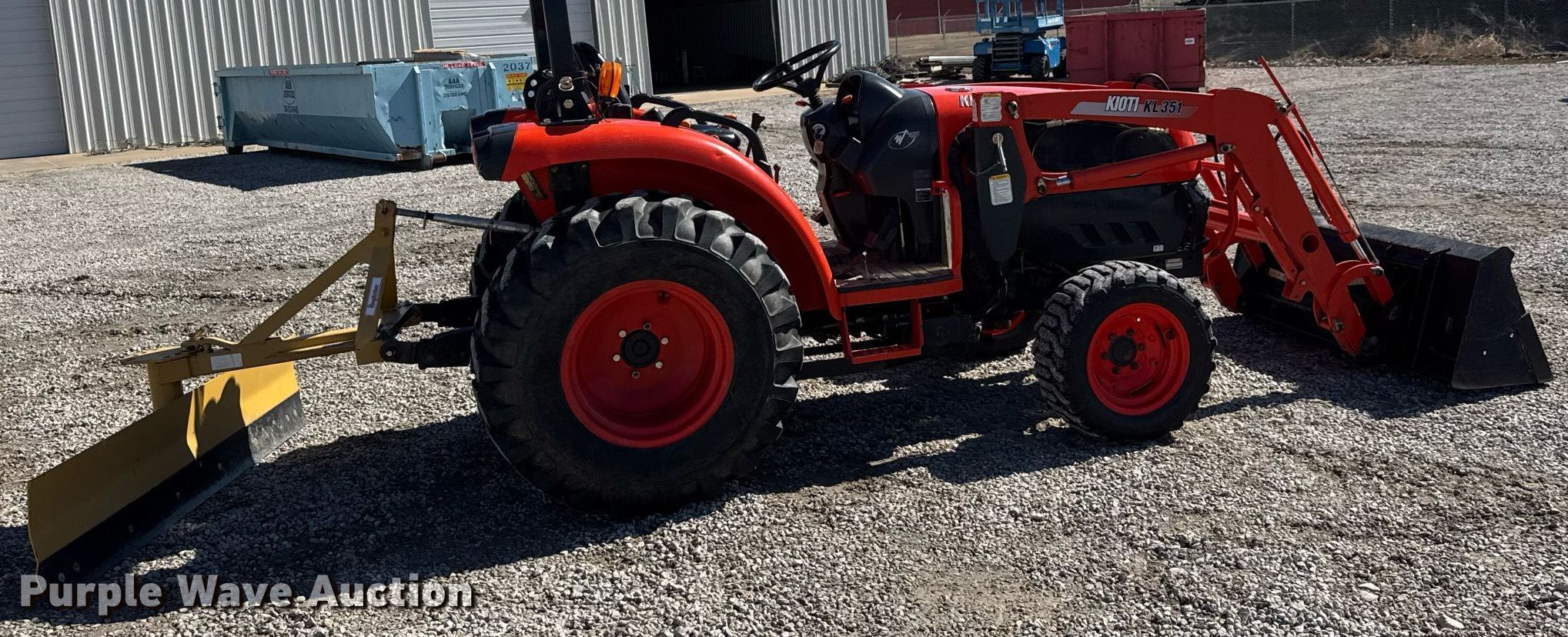 2009 Kioti DK35SE MFWD tractor. Hours: 813 on meter, Serial: JT6300037. Engine Daedong 3B183LWM, Displacement: 1.826L, Cylinders: 3, Fuel type: Diesel, HP: 38. Transmission Synchro, 12F - 12R, Left-hand reverser, Differential lock. Features PTO: 540, Three point Top link, Hydraulic remote sets Rear: 1, Loader Kioti KL351, Quick attach, Controls: Joystick, Bucket Width: 65", Rear blade King Kutter, Width: 72", Hitch: Three point. Tires Front: 27x10.00-15, Rear: 43x16.00-20. Sharp Construction, LLC Retirement. Valley Center, KS 67147