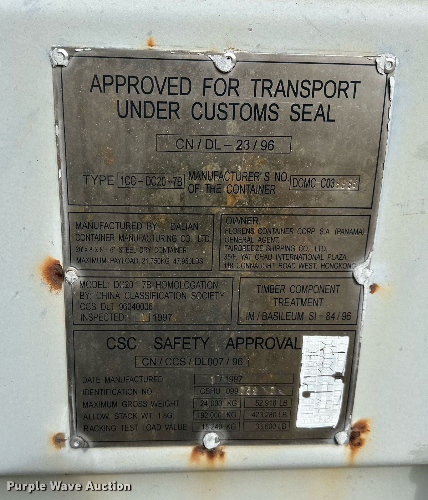 Purple Wave is selling a used Storage or Shipping Container in Missouri. This item is a 1997 shipping container with the following: Serial: CNDL2396, Length: 20'