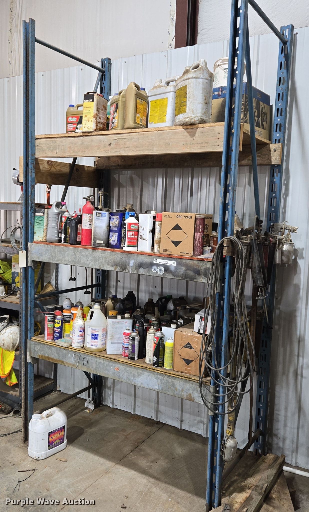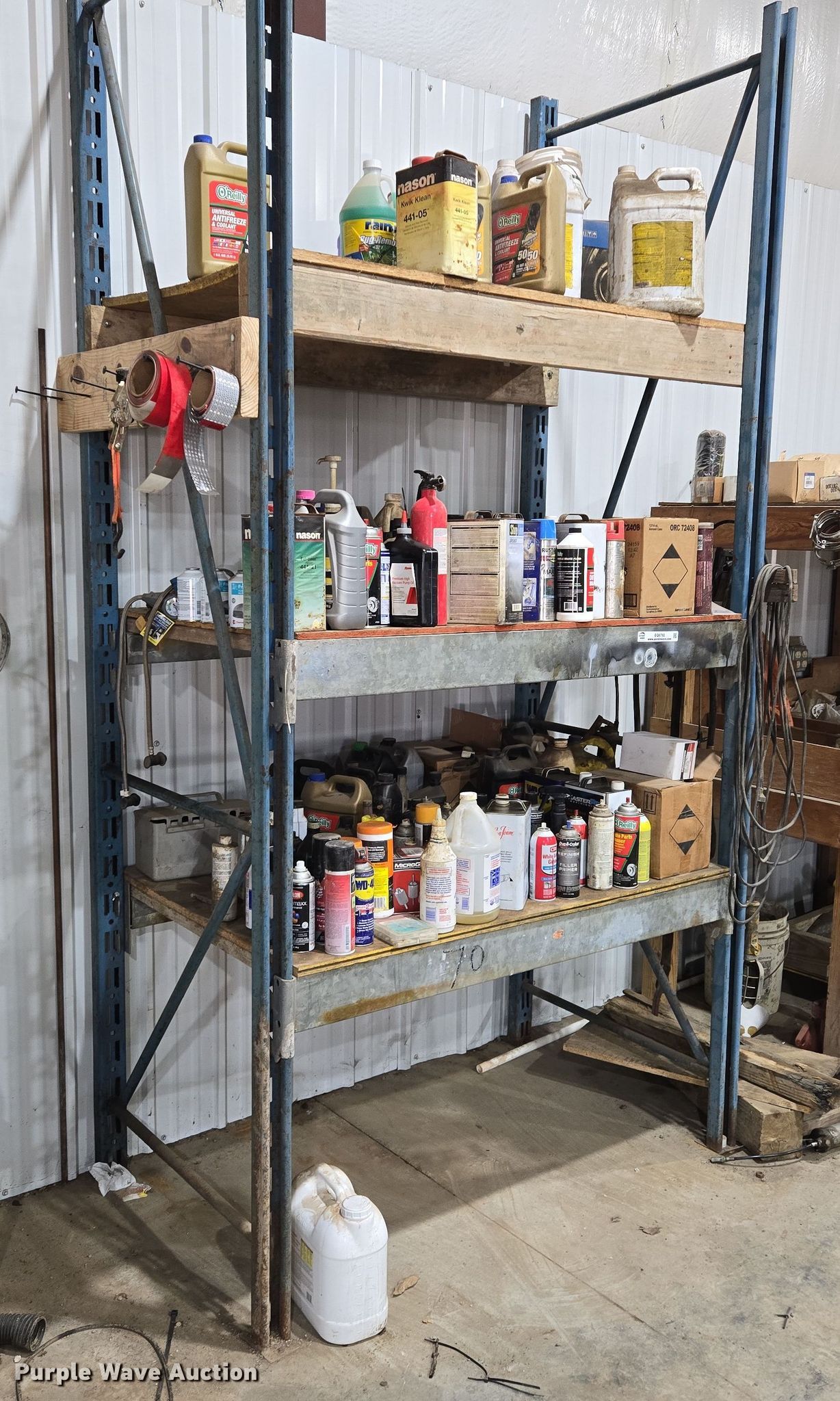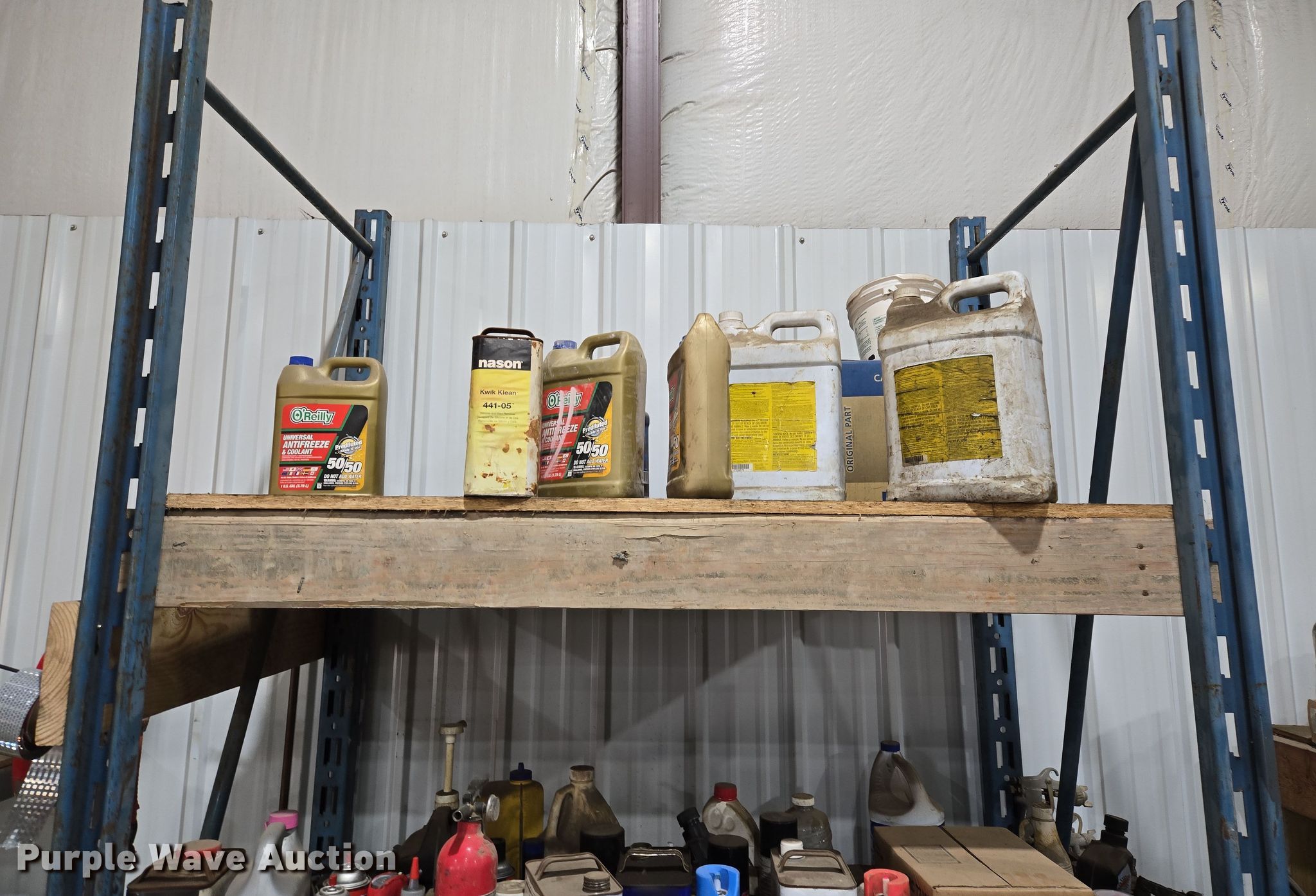 Storage rack. Width: 8', Cleaners included. J&N Utilities, Inc. Retirement Auction - Open Inspection March 21 and 26. 1455 Southeast County Road AA. Blue Springs, MO 64014