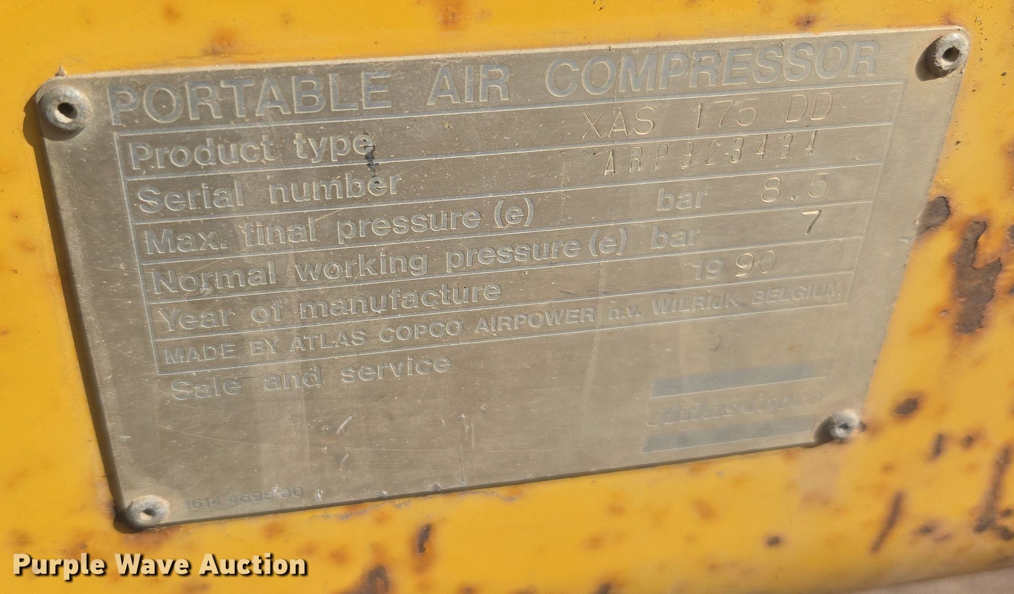 Purple Wave is selling a used Air Compressor in South Dakota. This item is a 1990 Atlas Copco XAS 175 DD air compressor with the following: Serial: ARP923434