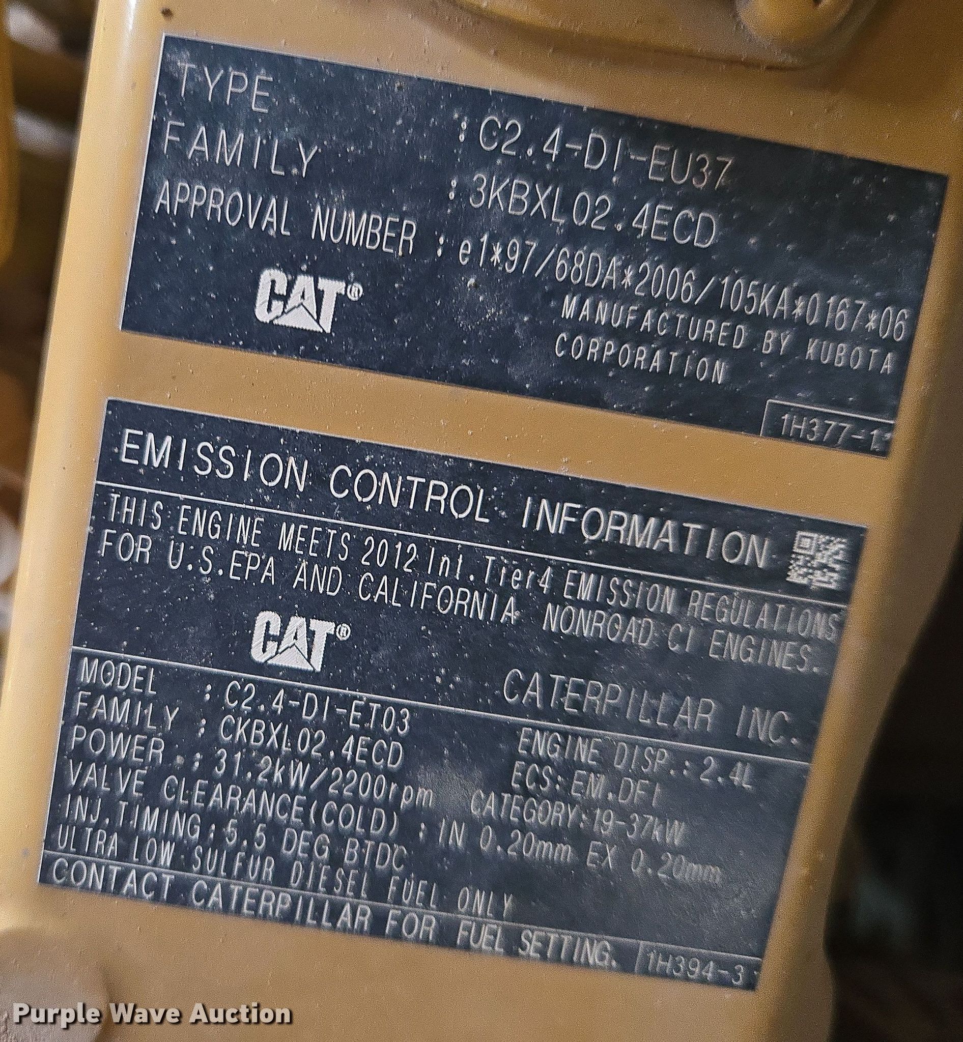 2012 Caterpillar 305E mini excavator. Hours: 6,156 on meter, Serial: CAT0305ELXFA00593. Engine Caterpillar C2.4-DI-ET03, Serial: CE6659, Displacement: 2.4L, Cylinders: 4, Fuel type: Diesel, kW: 31.2. Transmission Hydrostatic, Two speed travel. Operators station Enclosed cab, AC, Heat. Features Auxiliary hydraulics Standard, Counter weights, Backfill blade Width: 78", Boom Swing, Stick Stick length: 6' 1", Quick coupler: Hydraulic, Bucket Werk Brau, Width: 37", Cutting edge: Weld-on. Tracks Width: 16", Rubber. Mainline Contracting Inc.. Rapid City, SD 57702