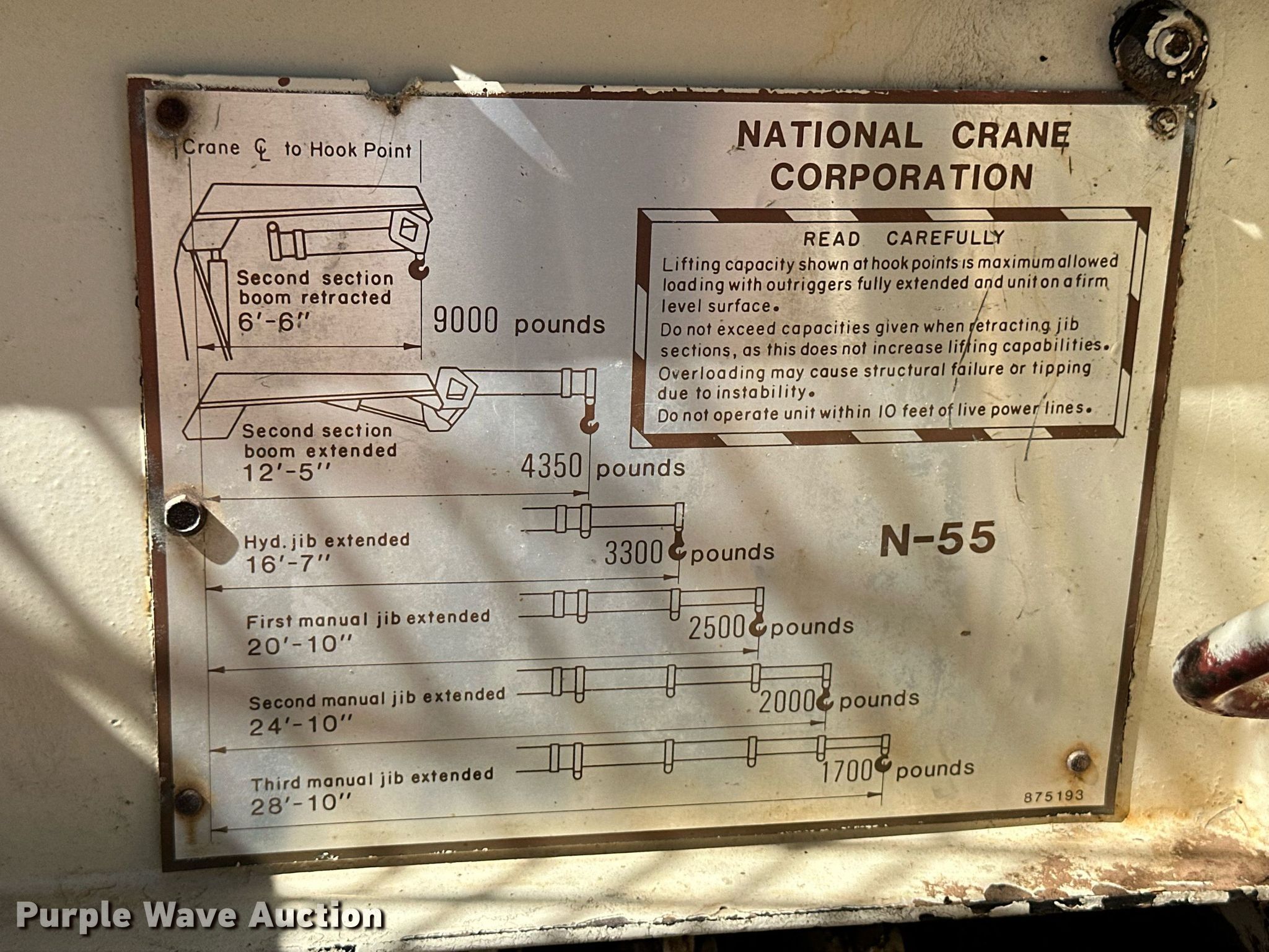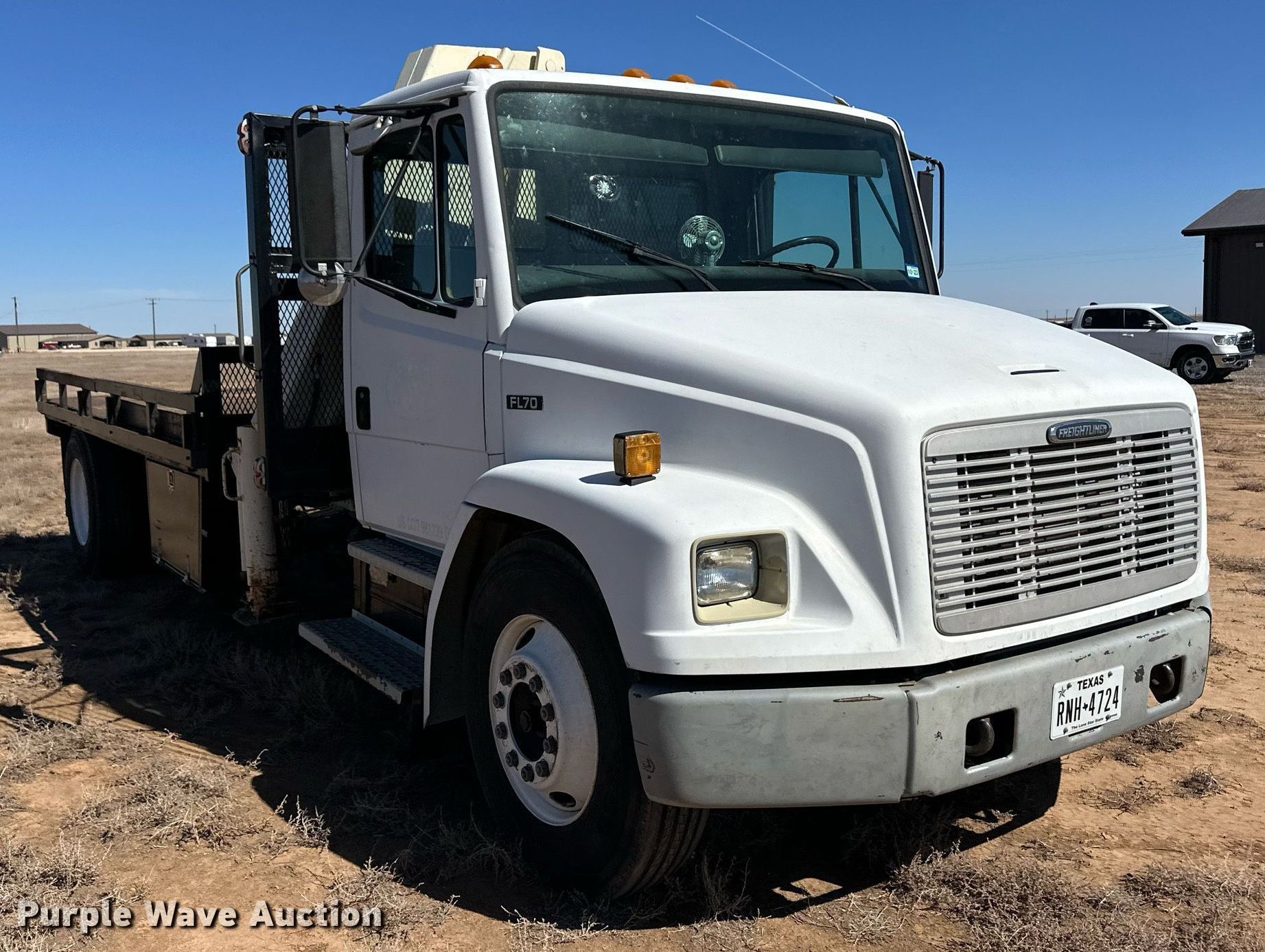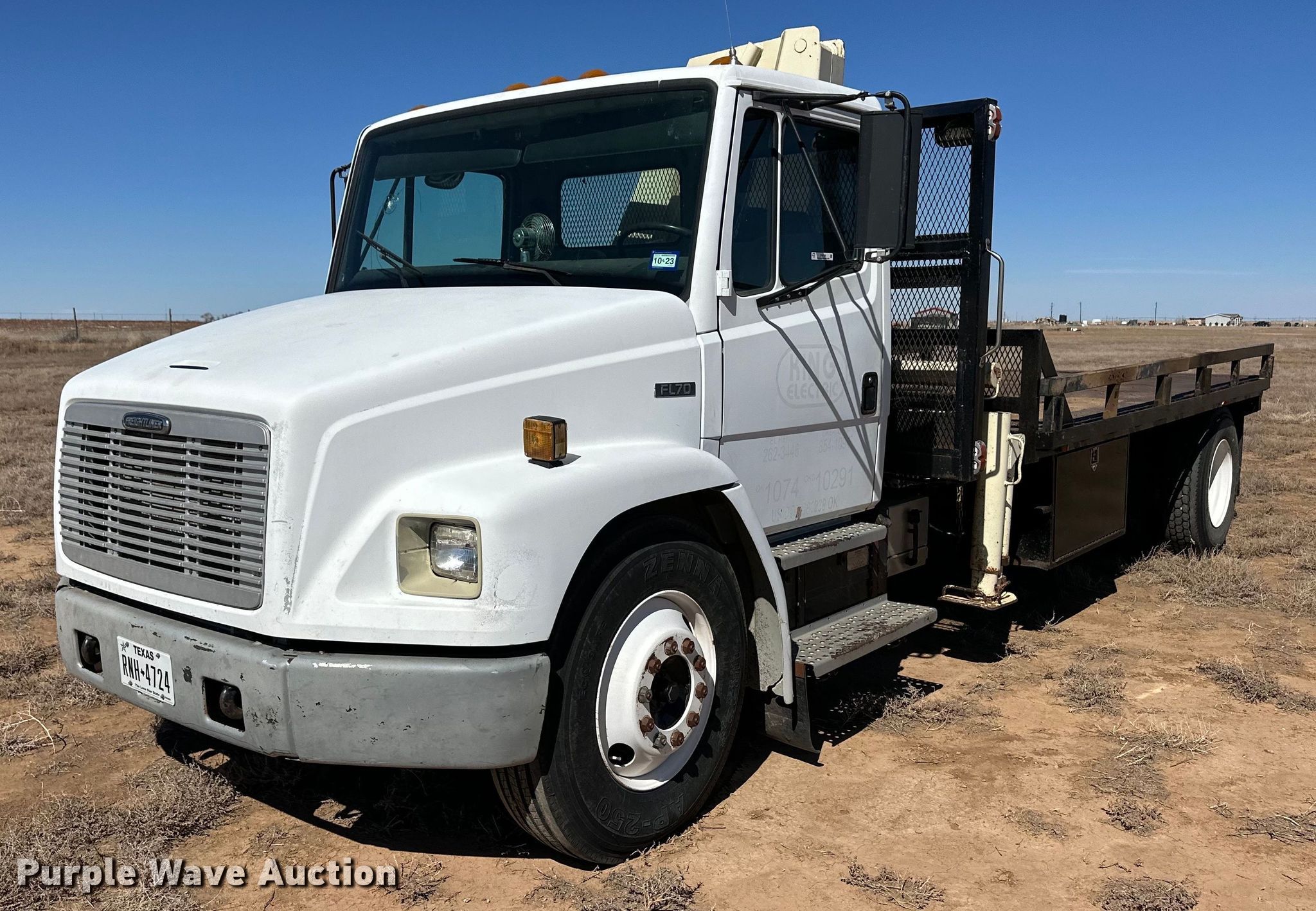 1995 Freightliner FL70 crane truck. Miles: 73,561 on odometer, VIN: 1FV6HLAC8SL638614. Engine Cummins, Displacement: 8.3L, Cylinders: 6, Fuel type: Diesel. Transmission Manual, Speed: 6. Chassis Axles: Single, Suspension: Spring, Brakes: Air, PTO. Interior Heat. Features Flatbed 14' L x 97" W, Crane National Crane Corporation N-55, Boom Telescopic, Knuckle, Maximum boom length: 6.5' Sections: 2, Maximum lift capacity: 9,000 lbs, Boom controls Ground, Crane ball & hook, Lift chart. Tires Size: 11R22.5. Texas title. Title distribution may be delayed up to 30 days from verification of funds. Dalhart, TX 79022