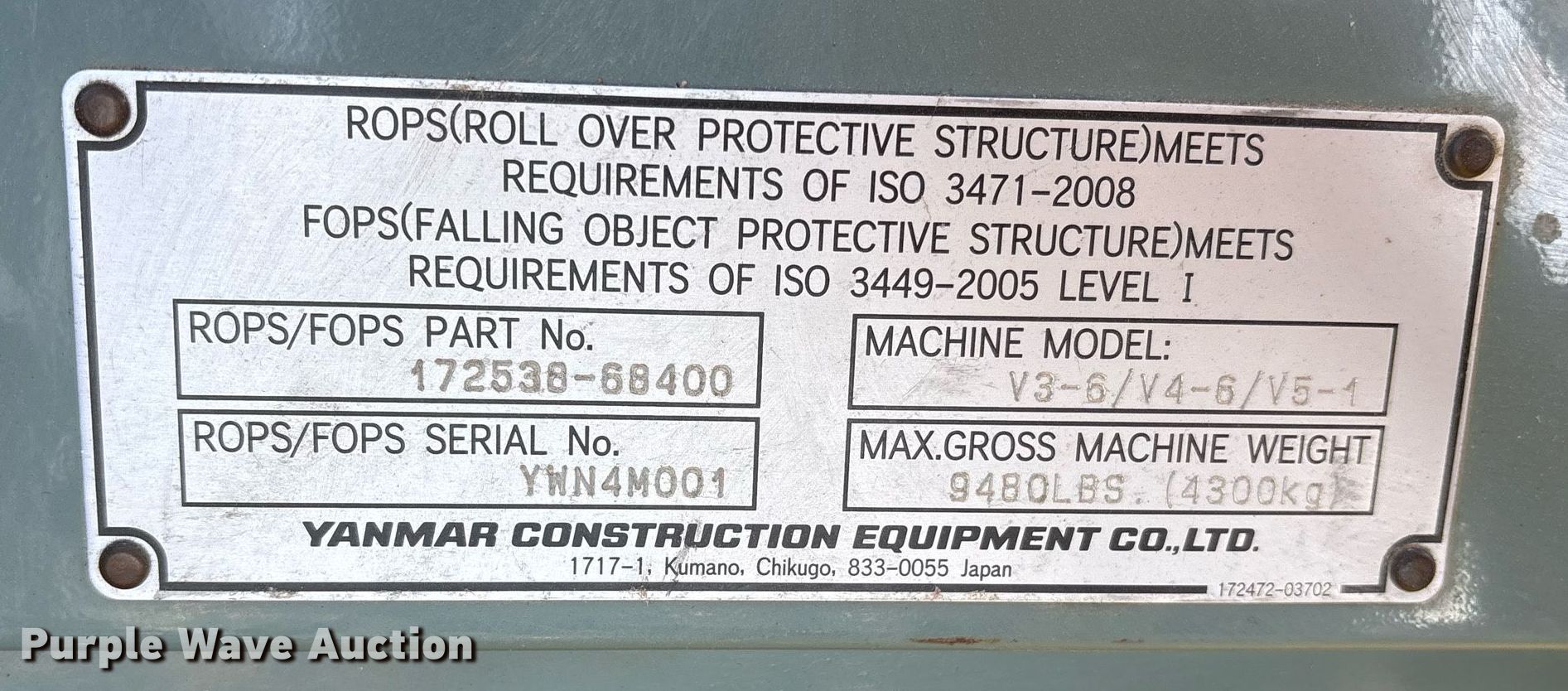 2014 Yanmar V4-6 wheel loader. Hours: 748 on meter, Serial: YMRV4Y6YLEYJ62461. Engine Yanmar 4TNV66, Serial: S7930, Displacement: 2.169L, Cylinders: 4, Fuel type: Diesel. Transmission Hydrostatic, Two speed travel. Chassis Four wheel drive. Operators station Enclosed cab, AC, Heat, Bucket controls: Joystick. Features Auxiliary hydraulics: Front, Quick coupler: Hydraulic, Bucket Width: 84". Tires Size: 15.5/60-18. Harrison Construction Co Inc. Stigler, OK 74462