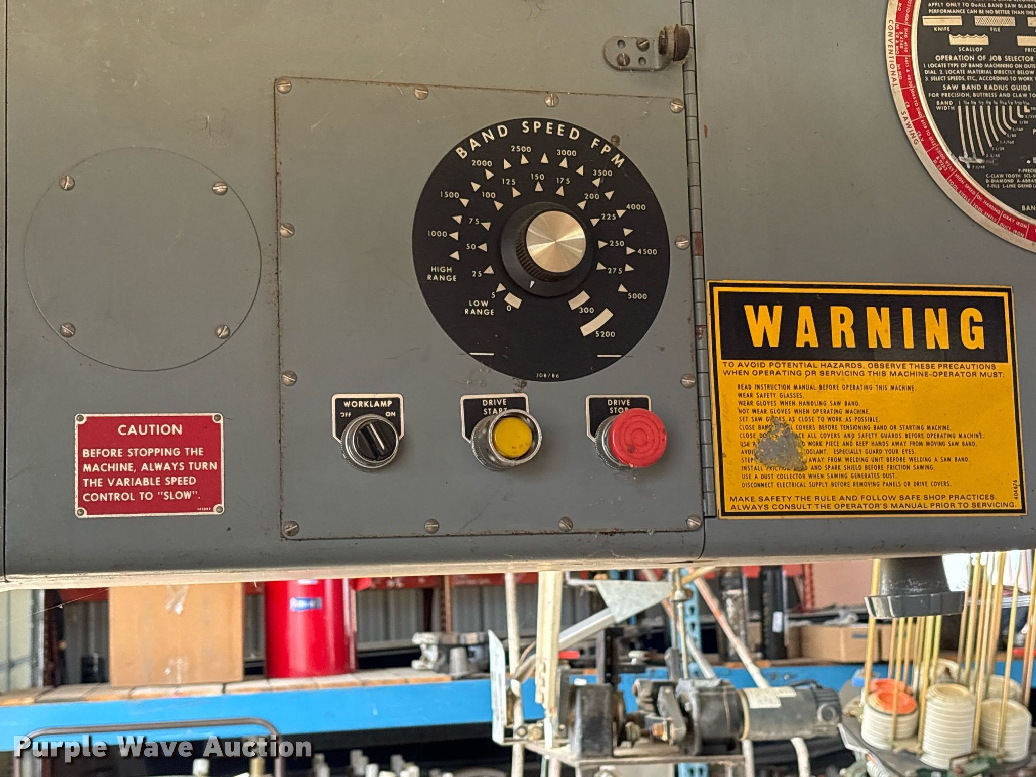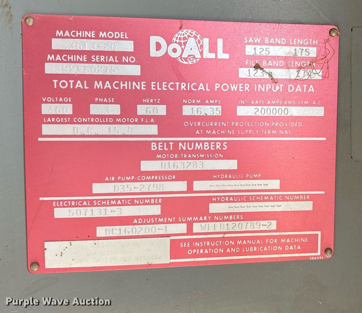 Purple Wave is selling a used Machine Shop Tools and Equip. in Oklahoma. This item is a DoAll 3613-20 band saw with the following: Serial: 399-80275