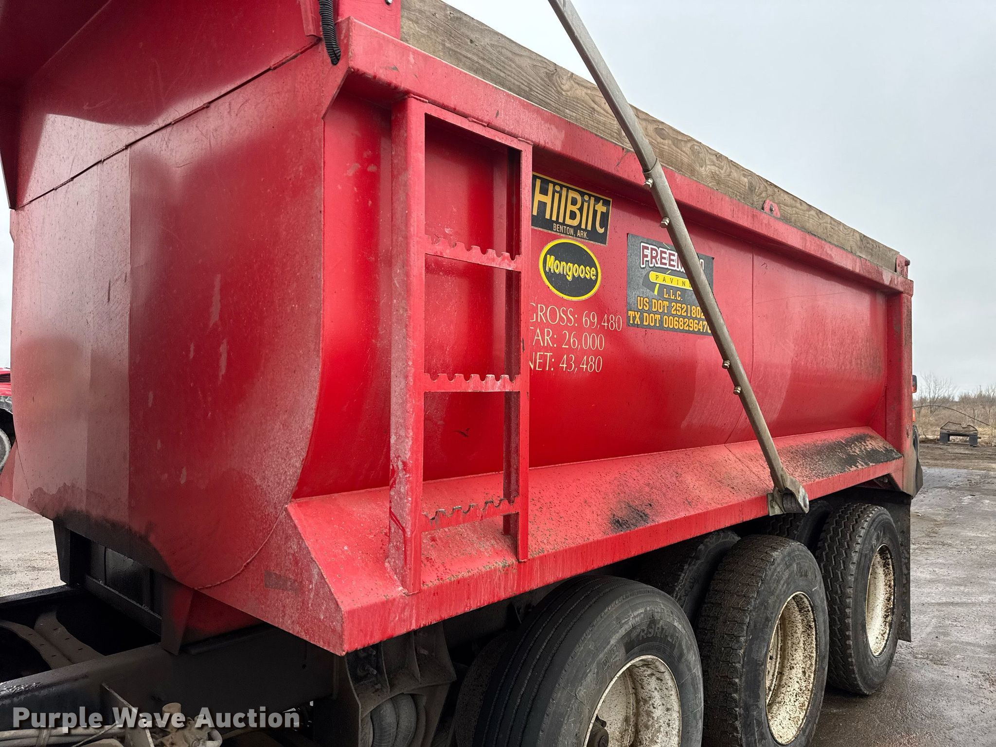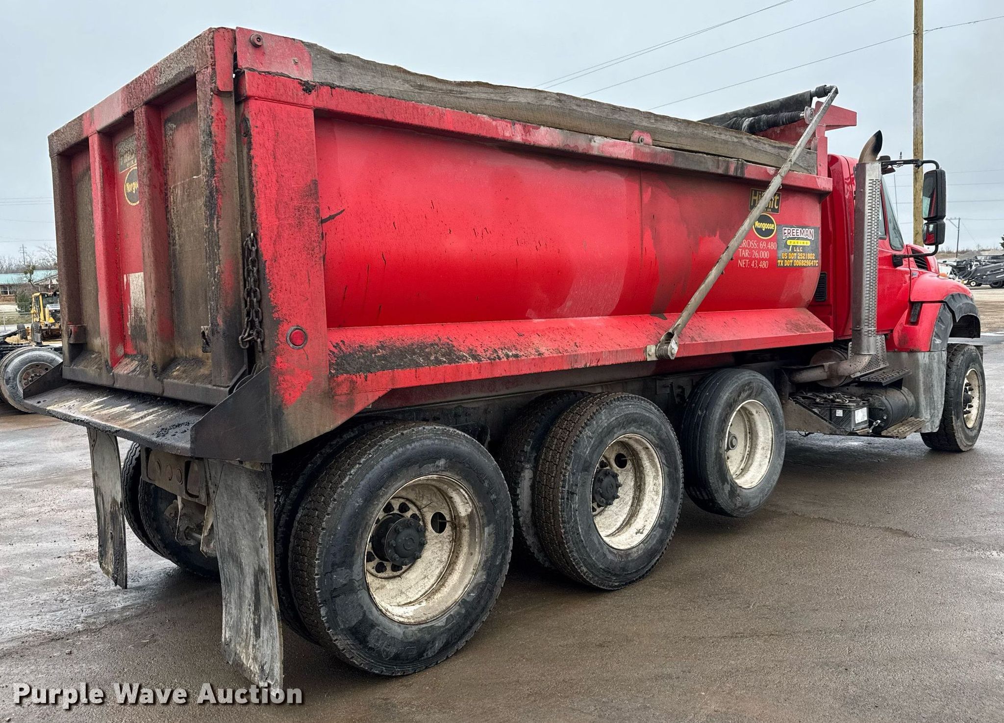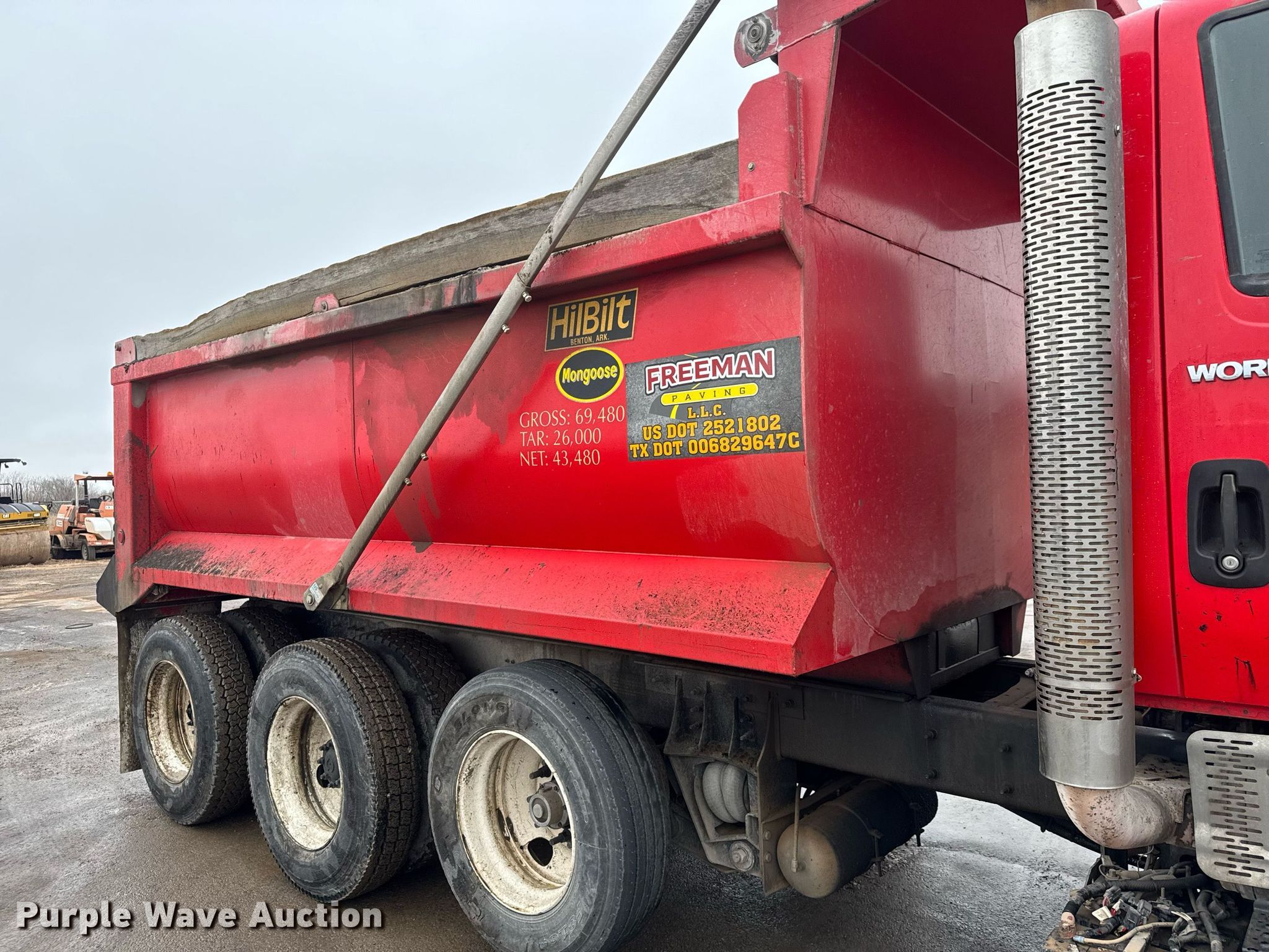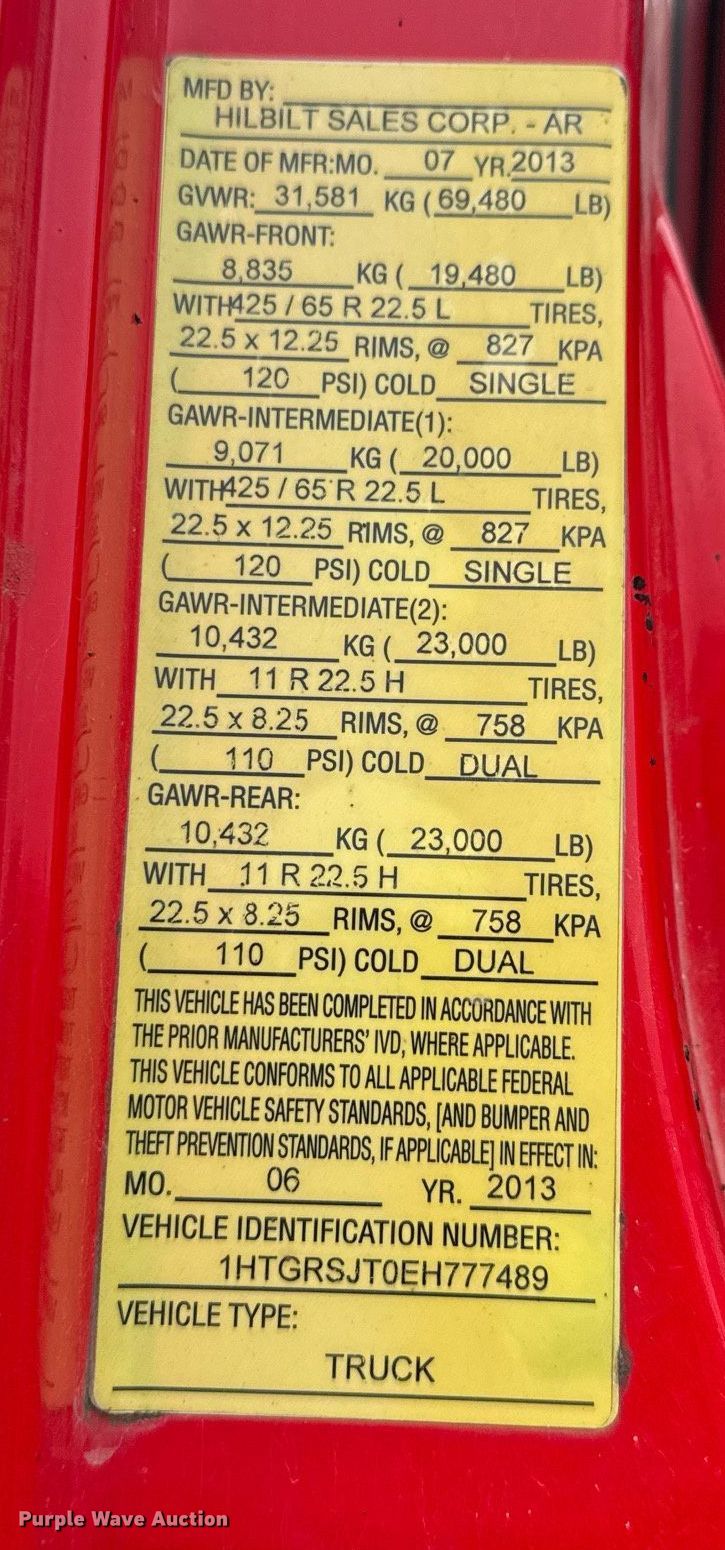 2014 International Work Star 7600 SFA dump truck. Miles: 216,191 on odometer, Hours: 11,017 on meter, Miles or hours may vary, unit still in use, VIN: 1HTGRSJT0EH777489, Unit #: 105. Engine Model: Maxxforce 13 A4 10, Displacement: 12.4L, Cylinders: 6, Fuel type: Diesel. Transmission Eaton Fuller 8 LL, Manual, Speed: 10. Chassis Double frame, Axles: Triple, Pusher axle, Differential lock: Inter-axle, Suspension: Spring over walking beam, Brakes: Air, PTO, GVWR: 65,480 lbs. Interior AC, Heat, Heated mirrors, Power windows, Cruise control. Features Dump bed HilBilt 15/3/16, 15' L x 96" W, Side height: 48", Side board height: 8", Bed type: Steel, Bed vibrator, Roll tarp, Ram: Single, End gate: Air operated. Tires Front: 385/65R22.5, Rear: 11R24.5, Lift axle: 295/75R22.5. Notes EGR deleted, DEF deleted, Dash warning indicator: Check engine, Unknown operating condition of bed vibrator. Texas title. Title distribution may be delayed up to 30 days from verification of funds. Freeman Paving LLC. Wichita Falls, TX 76305