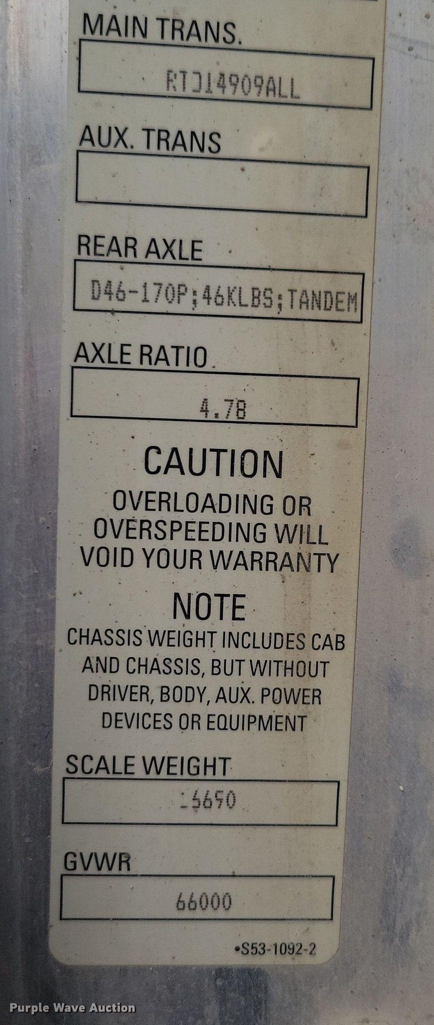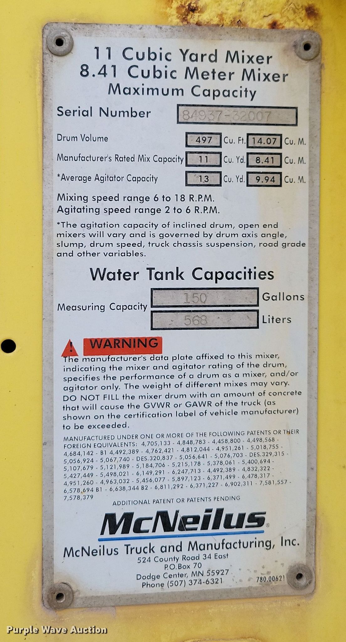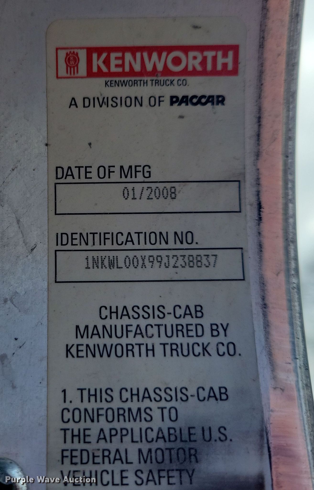 2009 Kenworth W900 ready mix truck. Miles: 203,277 on odometer, Hours: 21,738 on meter, VIN: 1NKWL00X99J238837. Engine Cummins ISM, Displacement: 10.8L, Cylinders: 6, Fuel type: Diesel. Transmission Eaton Fuller, Manual, Speed: 10. Chassis Axles: 4, Pusher axle Steerable, Tag axle Steerable, Gear ratio: 4.78, Differential lock: Full, Suspension: Spring over walking beam, Brakes: Air, PTO, GVWR: 66,000 lbs FAWR: 20,000 lbs, IAWR: 23,000 lbs, RAWR: 23,000 lbs. Interior AC, Heat, Heated mirrors, Power windows, Power locks, Cruise control, Backup camera, Auxiliary controls. Features Mixer McNeilus, Serial: 84937-32007, Capacity: 11 cu.yd., Discharge: Rear, In-cab controls, Rear drum controls, Water tank capacity: 150 gallons, Chute Extensions: 3, Chute type: Steel.. Tires Front: 425/65R22.5, Rear: 11R22.5, Lift axle: 255/70R22.5. South Dakota title. Title distribution may be delayed up to 14 days from verification of funds. Knife River - Sweetman Construction. Sioux Falls, SD 57107