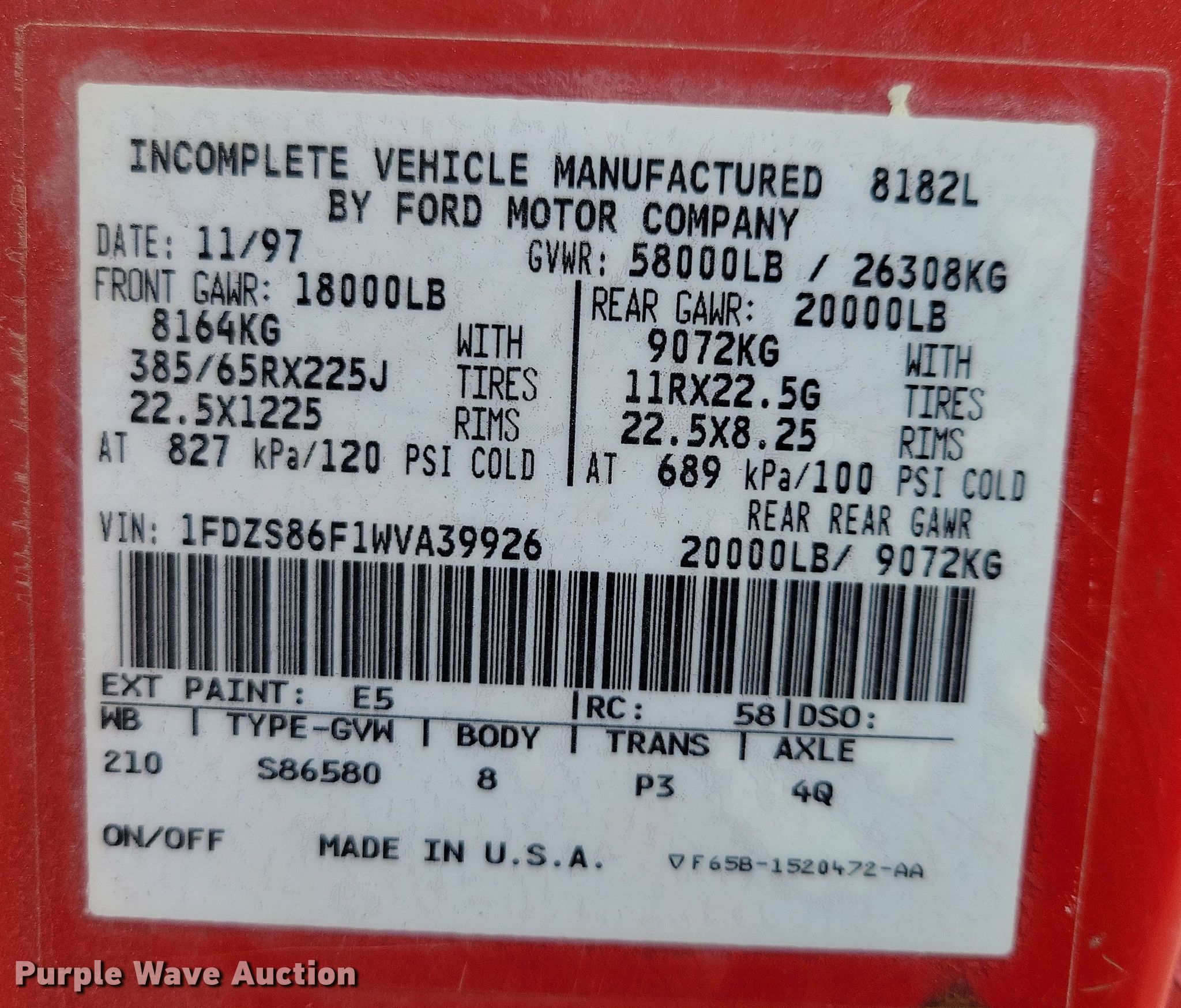 1998 Ford LT8513 dump truck. Miles: 362,643 on odometer, VIN: 1FDZS86F1WVA39926. Engine Caterpillar 3126, Serial: 6RWQ1246, Displacement: 7.2L, Cylinders: 6, Fuel type: Diesel, HP: 300. Transmission Eaton Fuller Roadranger RT/RTO-8LL, Manual, Speed: 10. Chassis Axles: Tandem, Differential lock: Full, Suspension: Spring over walking beam, Brakes: Air, PTO, GVWR: 58,000 lbs FAWR: 18,000 lbs, IAWR: 20,000 lbs, RAWR: 20,000 lbs, Wheelbase: 210". Interior AC, Heat, Heated mirrors, Cruise control. Features Dump bed Beau-Roc LTT-16.6-42-48, 16' L x 96" W, Side height: 42", Bed type: Steel, Bed vibrator, Ram: Single, End gate: Air operated. Tires Front: 385/65R22.5, Rear: 11R22.5. South Dakota title. Title distribution may be delayed up to 14 days from verification of funds. Knife River - Sweetman Construction. Sioux Falls, SD 57107