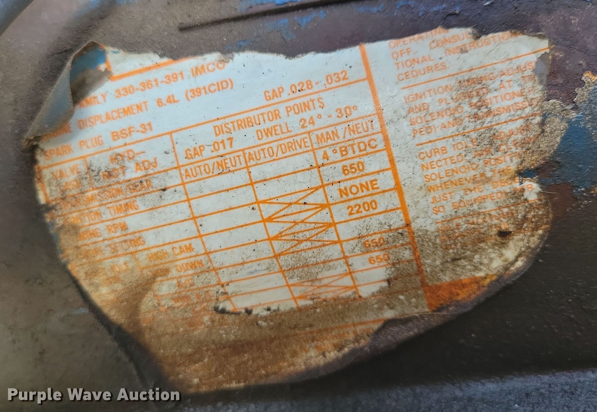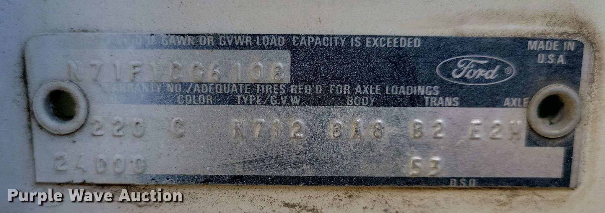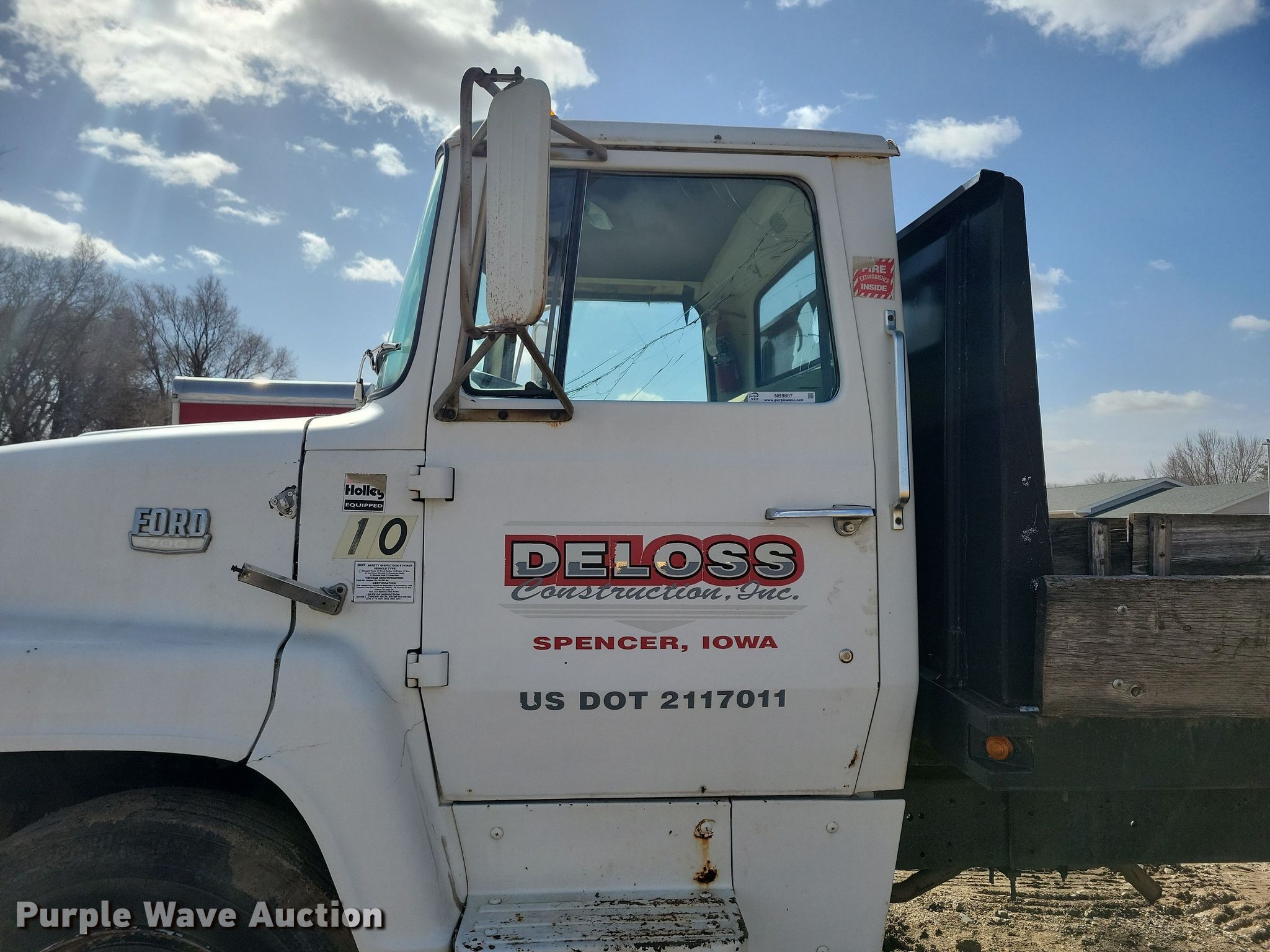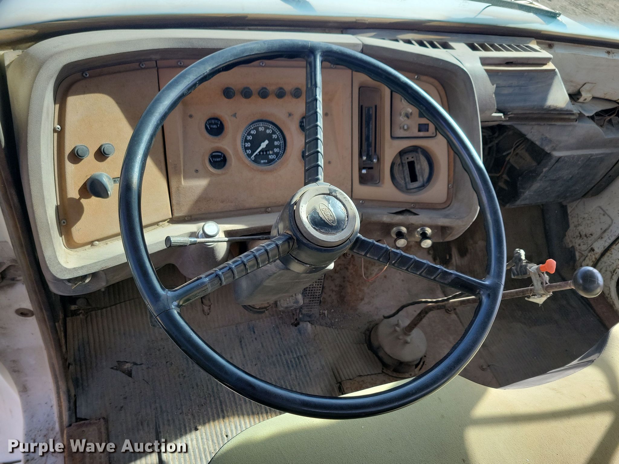 1978 Ford 700 flatbed truck. Miles: 46,968 on odometer, VIN: N71FVCG6108. Engine Displacement: 6.4L, Cylinders: 8, Fuel type: Gas. Transmission Manual, Speed: 5, plus 2. Chassis Axles: Single, Suspension: Spring, Brakes: Hydraulic. Interior Heat. Features Flatbed Midwest, 20' L x 96" W, Removable sides. Tires Size: 10R22.5. Notes Driver side window cracked. Iowa title. Title distribution may be delayed up to 14 days from verification of funds. DeLoss Construction. Spencer, IA 51301