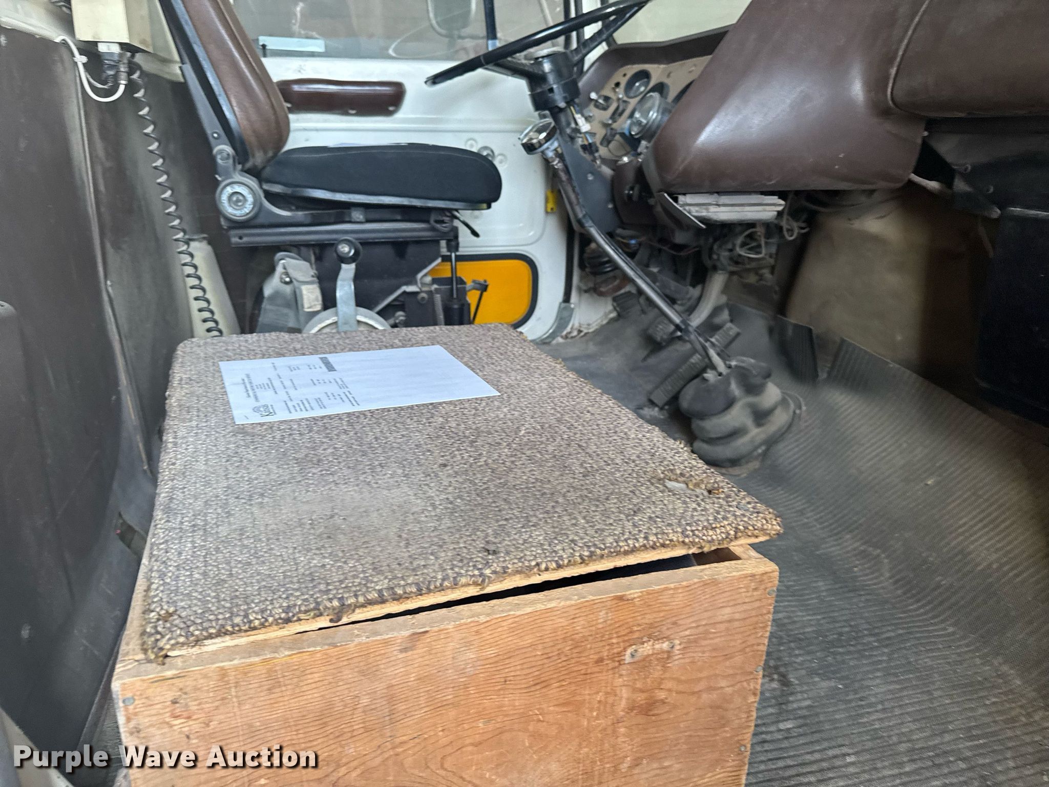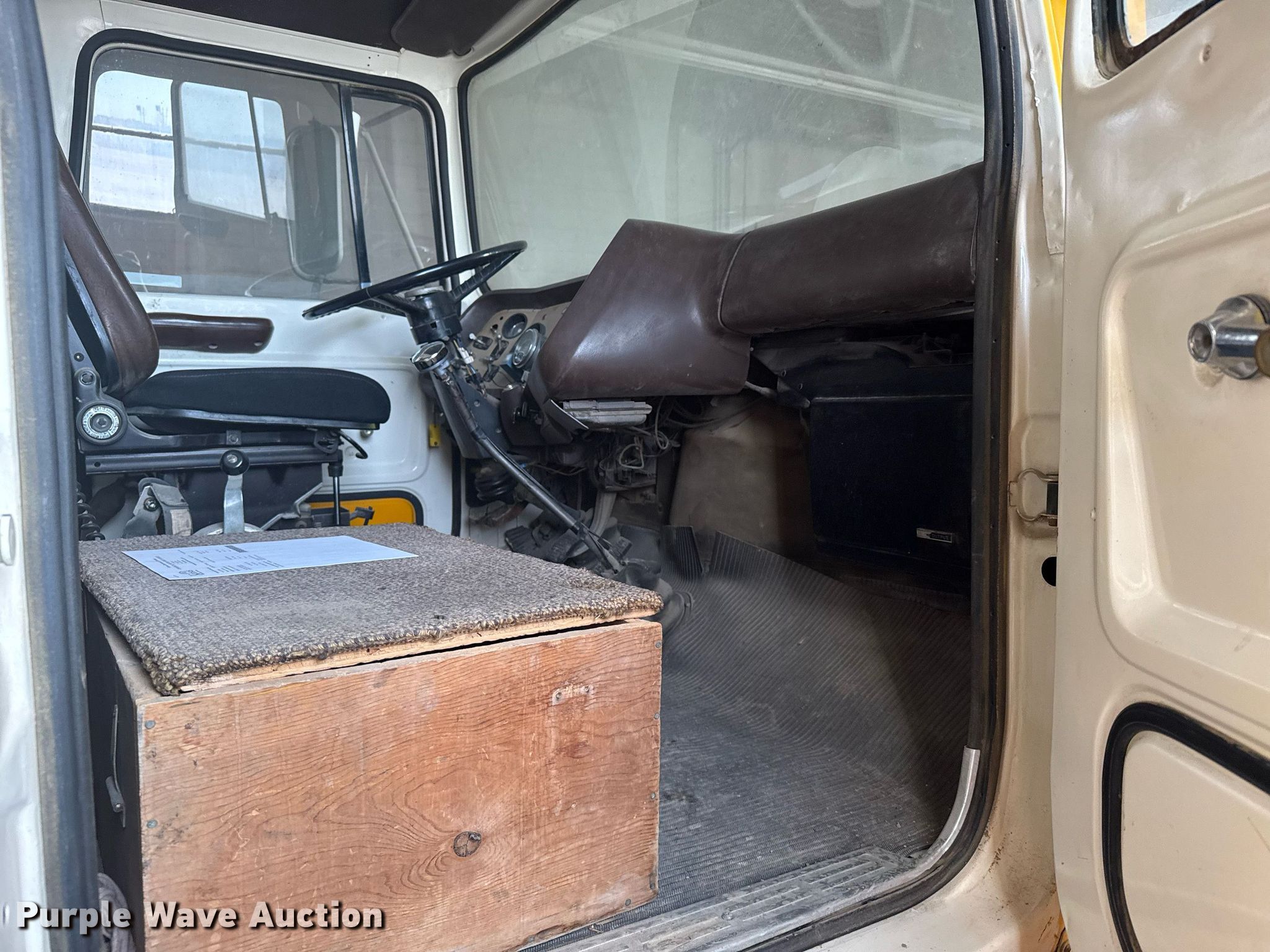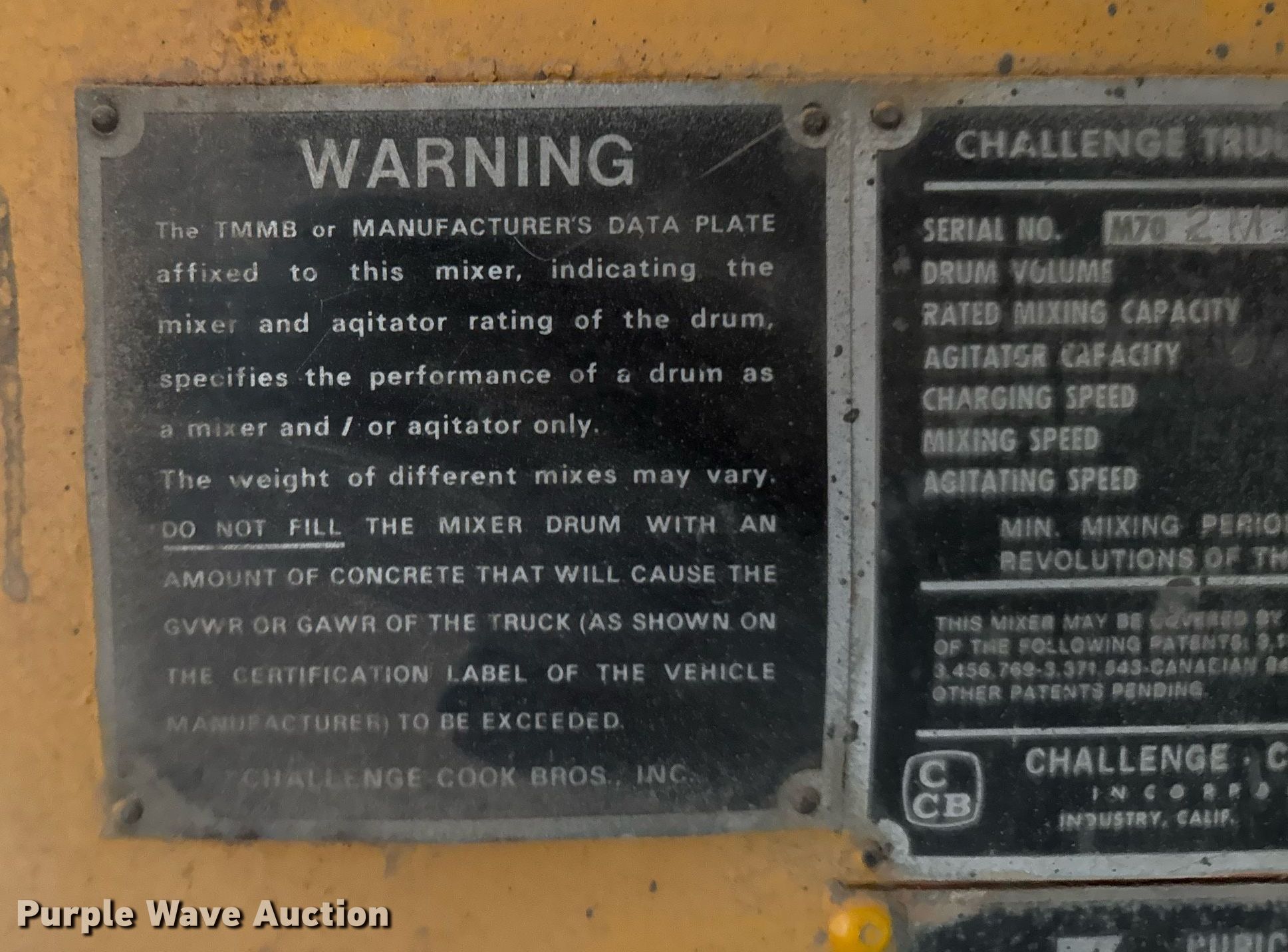 1980 Ford 8000 ready mix truck. Miles: 7,075 on odometer Actual mileage unknown, VIN: Y80UVJH1260. Engine Caterpillar 3208, Cylinders: 8, Fuel type: Diesel. Transmission Spicer 1107, Manual, Speed: 13. Chassis Axles: Tandem, Differential lock: Inter-axle, Suspension: Spring over walking beam, Brakes: Air, Front mount PTO, GVWR: 46,000 lbs, Wheelbase: 203". Interior Heat. Features Mixer Challenge - Cook Bros, Serial: M702MD3421, Capacity: 7 cu.yd., Discharge: Rear, In-cab controls, Rear drum controls, Chute Extensions: 3, Chute type: Steel.. Tires Size: 10.00R20. Notes Dead battery, Unknown operating condition. Kansas title. Mileage has not been verified. Exempt will be written in the odometer disclosure on the title. Title distribution may be delayed up to 14 days from verification of funds. The Monarch Cement Company (Dodge City Concrete) - Open Inspection March 26 1:00-4:00pm. 111 J C St. Garden City, KS 67846