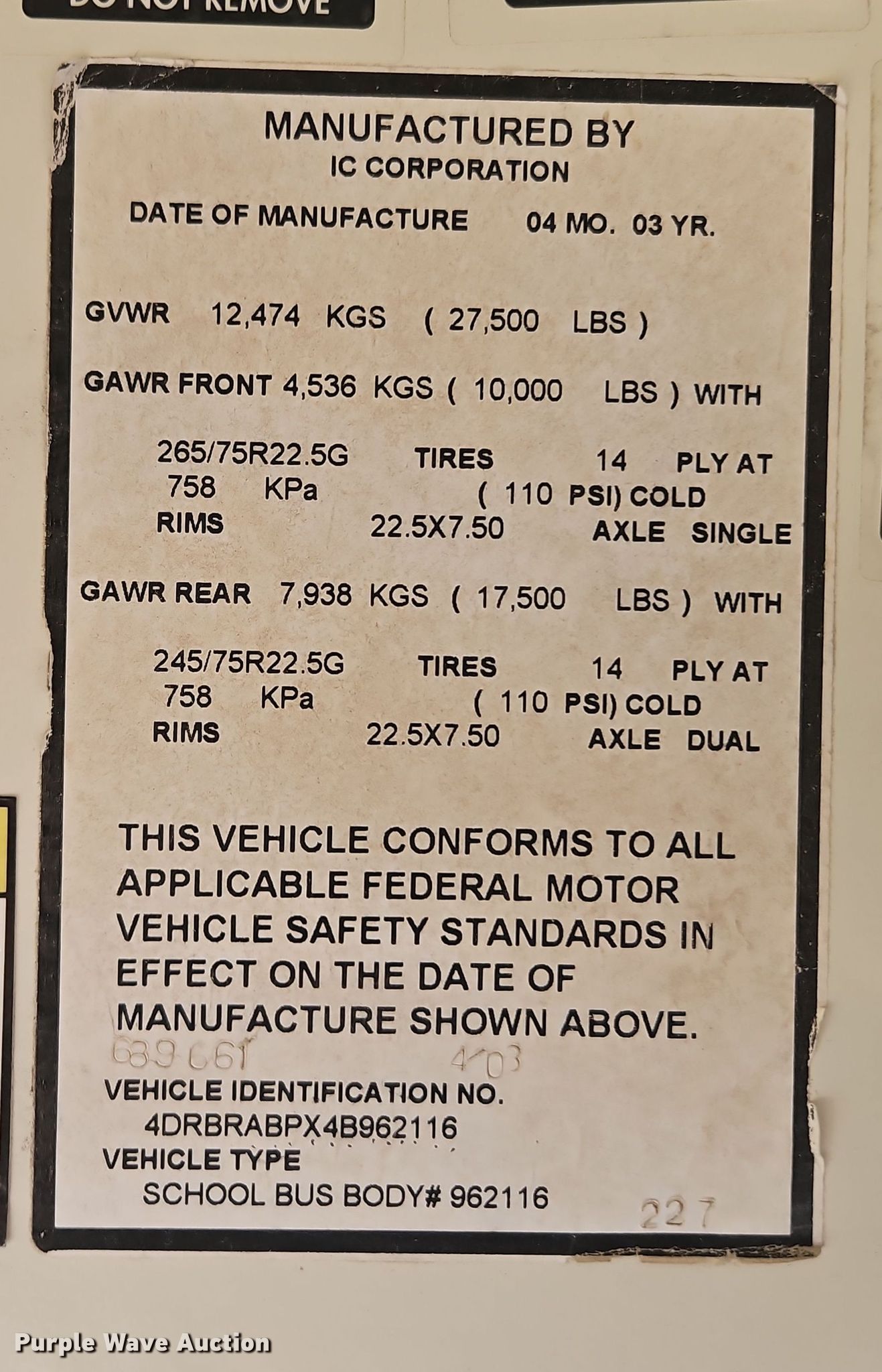 2004 International CE school bus. Miles: 104,525 on odometer, Hours: 4,531 on meter, VIN: 4DRBRABPX4B962116. Engine International C195, Cylinders: 6, Fuel type: Diesel, HP: 195. Transmission Automatic. Chassis Axles: Single, Suspension: Spring, Brakes: Hydraulic, GVWR: 27,500 lbs. Interior Heat, Heated mirrors, Cruise control, Auxiliary controls, Passengers: 53. Tires Size: 11R22.5. Notes Dead battery. Kansas title. Title distribution may be delayed up to 30 days from verification of funds. Central Heights Unified School District #288. Richmond, KS 66080