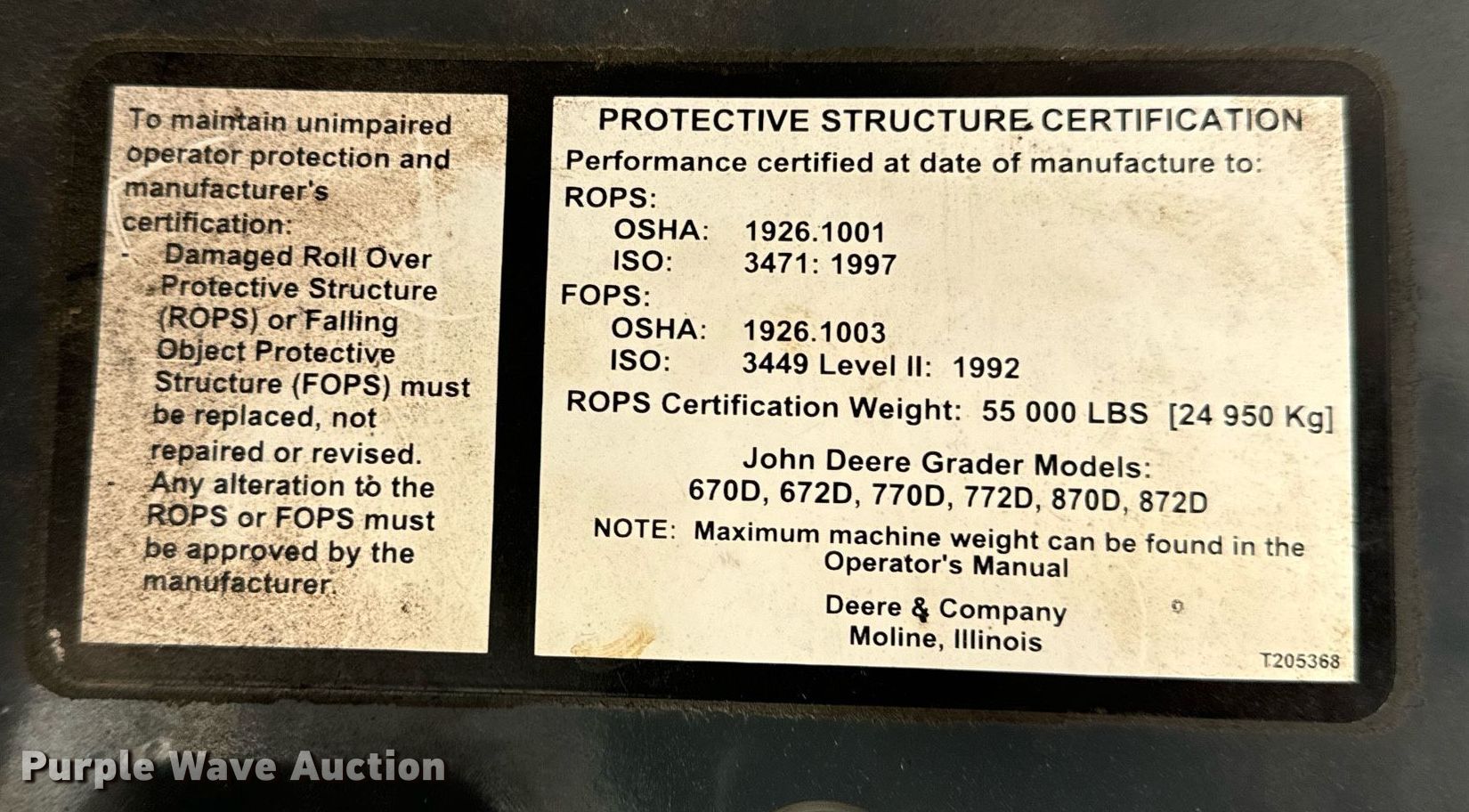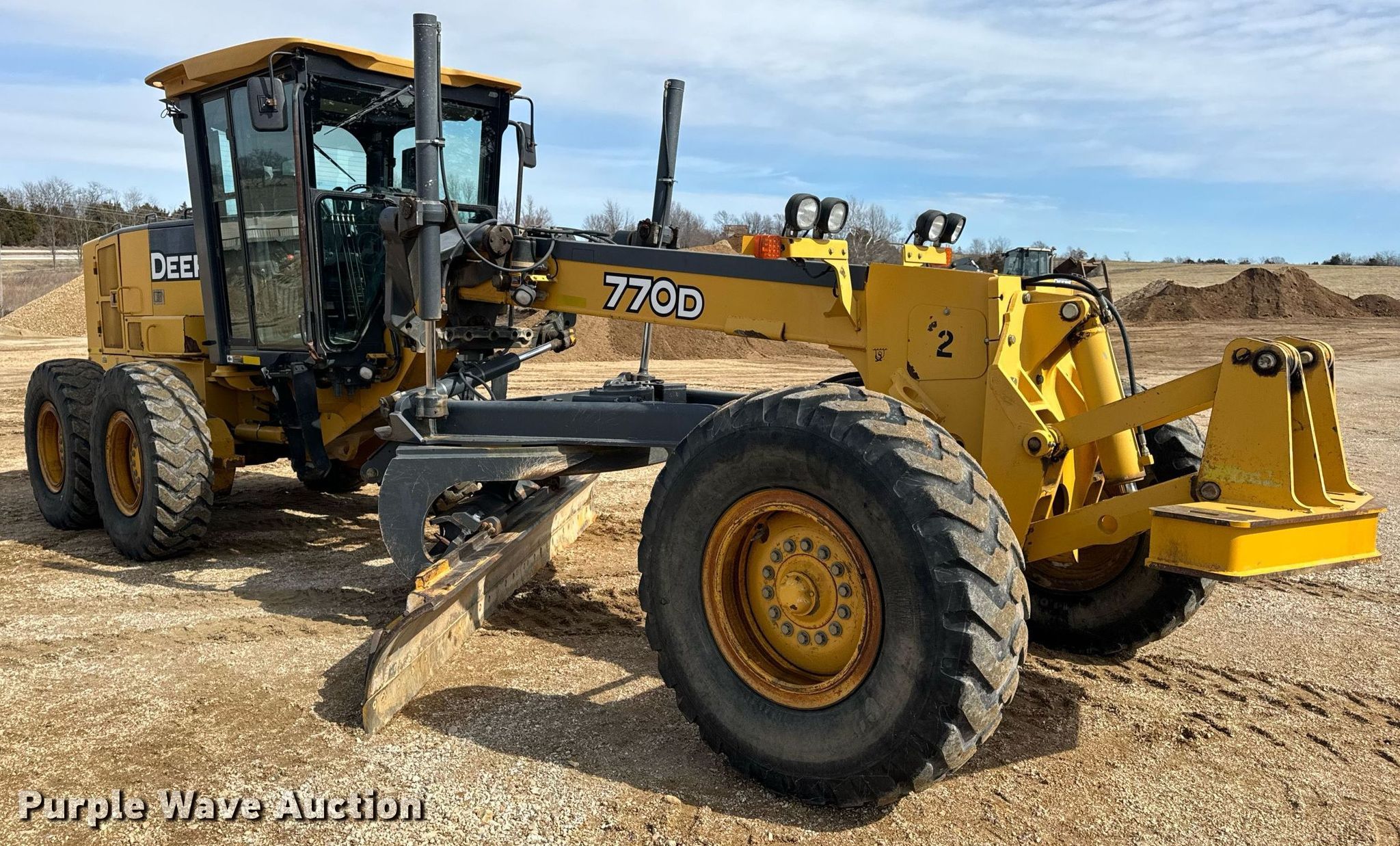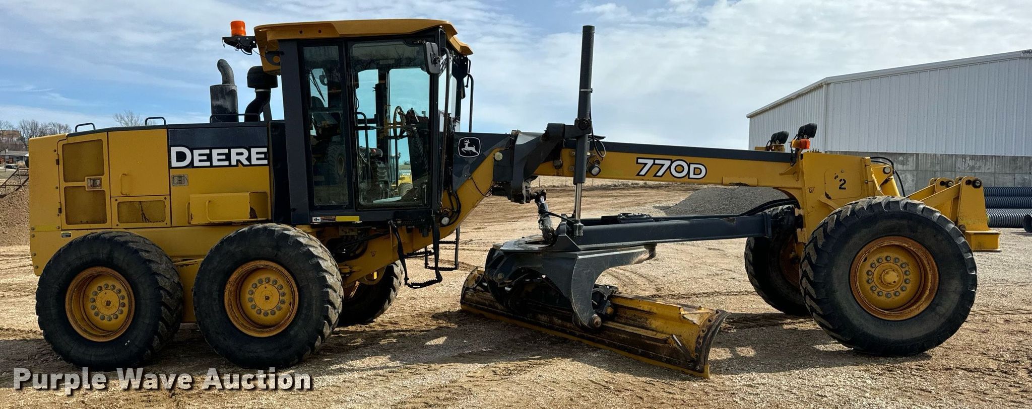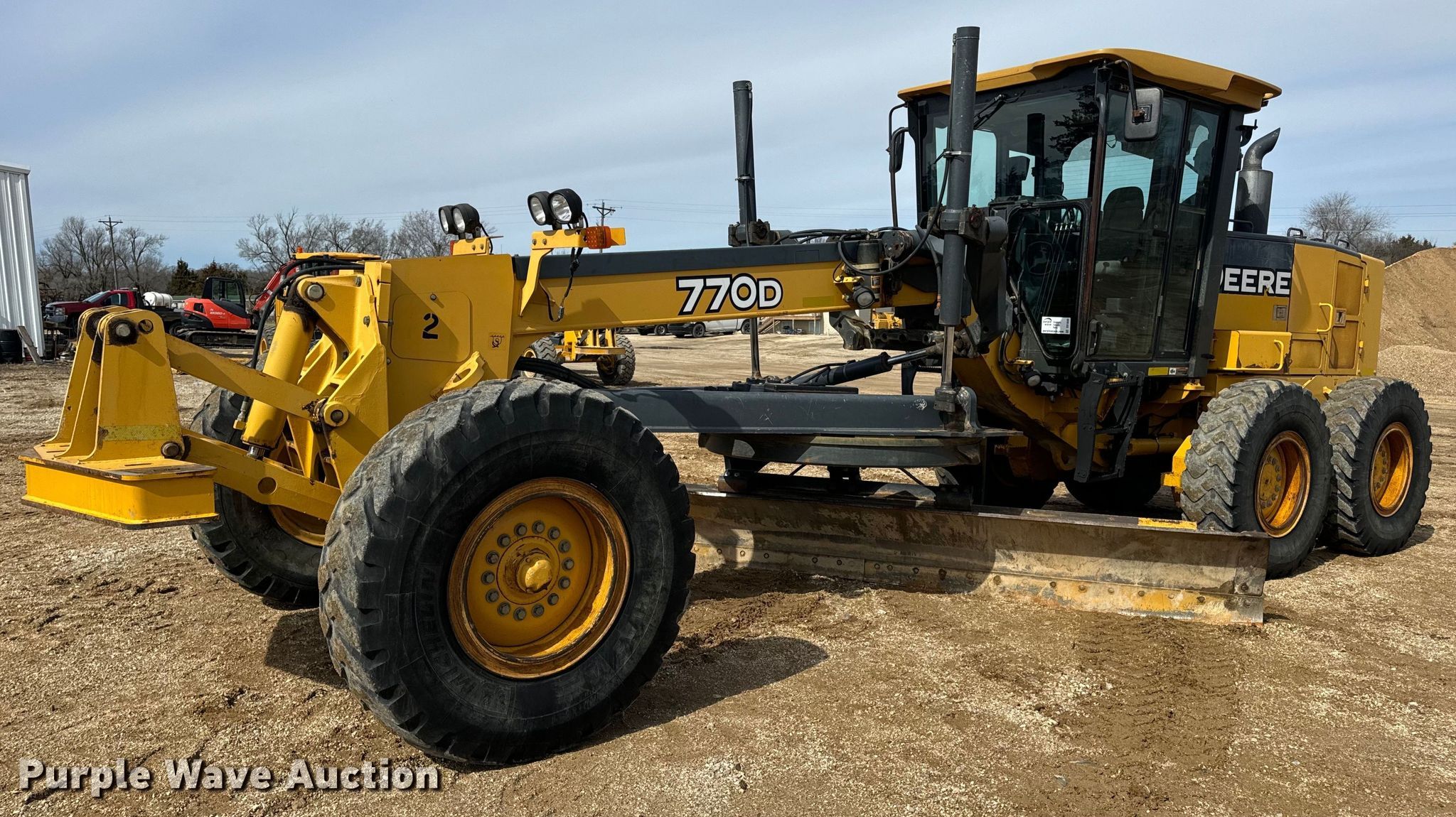 Purple Wave is selling a used Motor Grader in Missouri. This item is a 2008 John Deere 770D motor grader with the following: Hours: 11,462 on meter, Serial: DW770DX621791, Unit #: 2