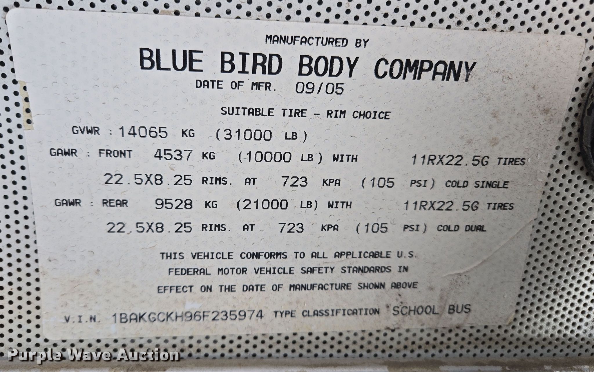 Purple Wave is selling a used Bus in Oklahoma. This item is a 2006 Blue Bird school bus with the following: Miles: Unknown, VIN: 1BAKGCKH96F235974, Unit #: 15