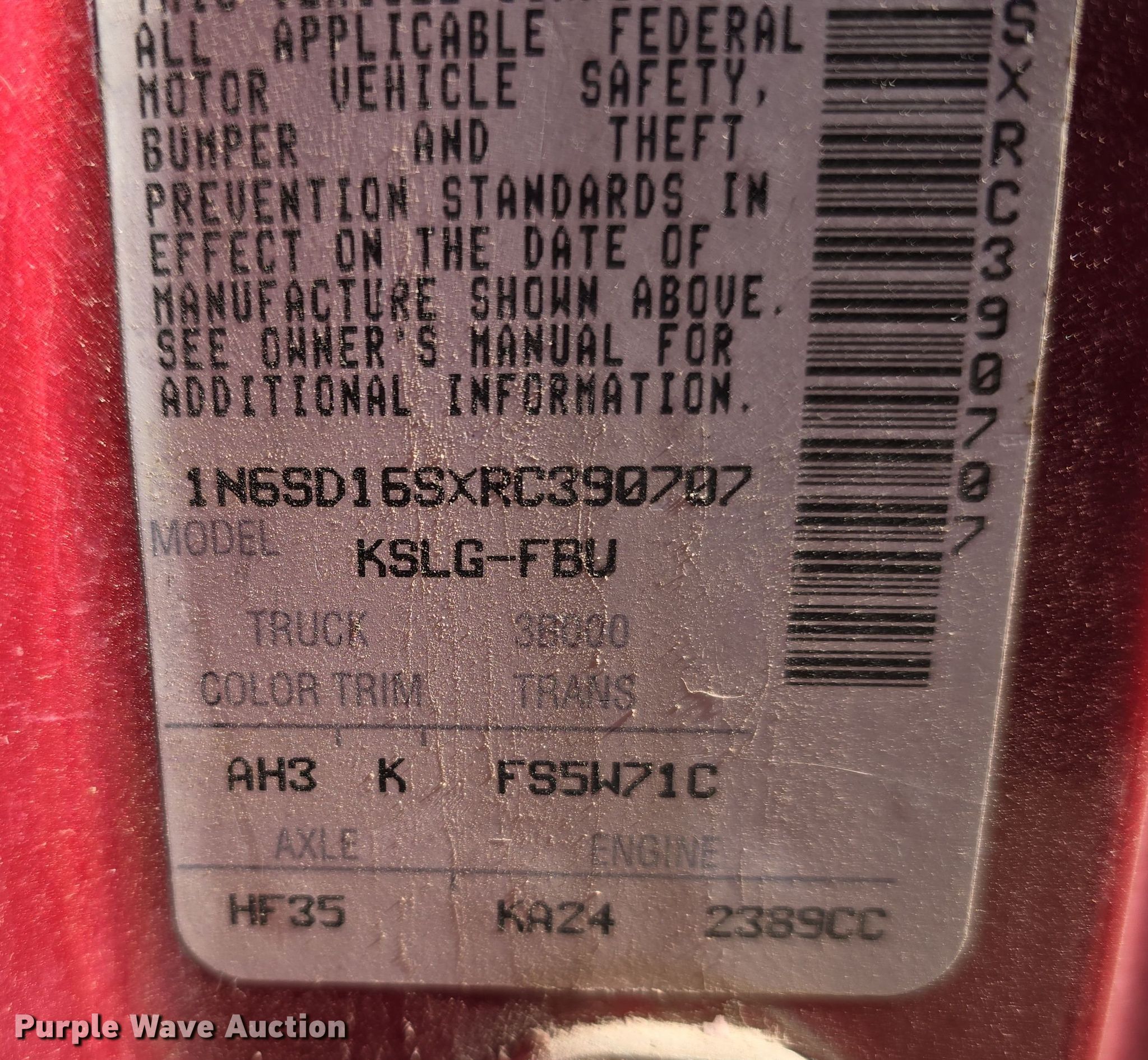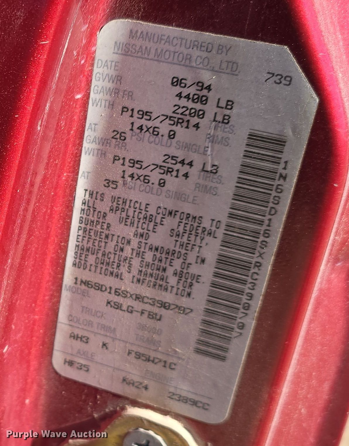 1994 Nissan XE King Cab pickup truck. Miles: 167,499 on odometer, VIN: 1N6SD16SXRC390707. Engine Displacement: 2.4L L4 SOHC, Cylinders: 4, Fuel type: Gas. Transmission Manual, Speed: 5. Interior AC, Heat. Tires Size: P195/75R14. Notes Spare tire included, Windshield chipped or cracked, Dead battery, Non-operational tailgate latch. Nebraska title. Title distribution may be delayed up to 14 days from verification of funds. Custer County Road Dept.. Broken Bow, NE 68822
