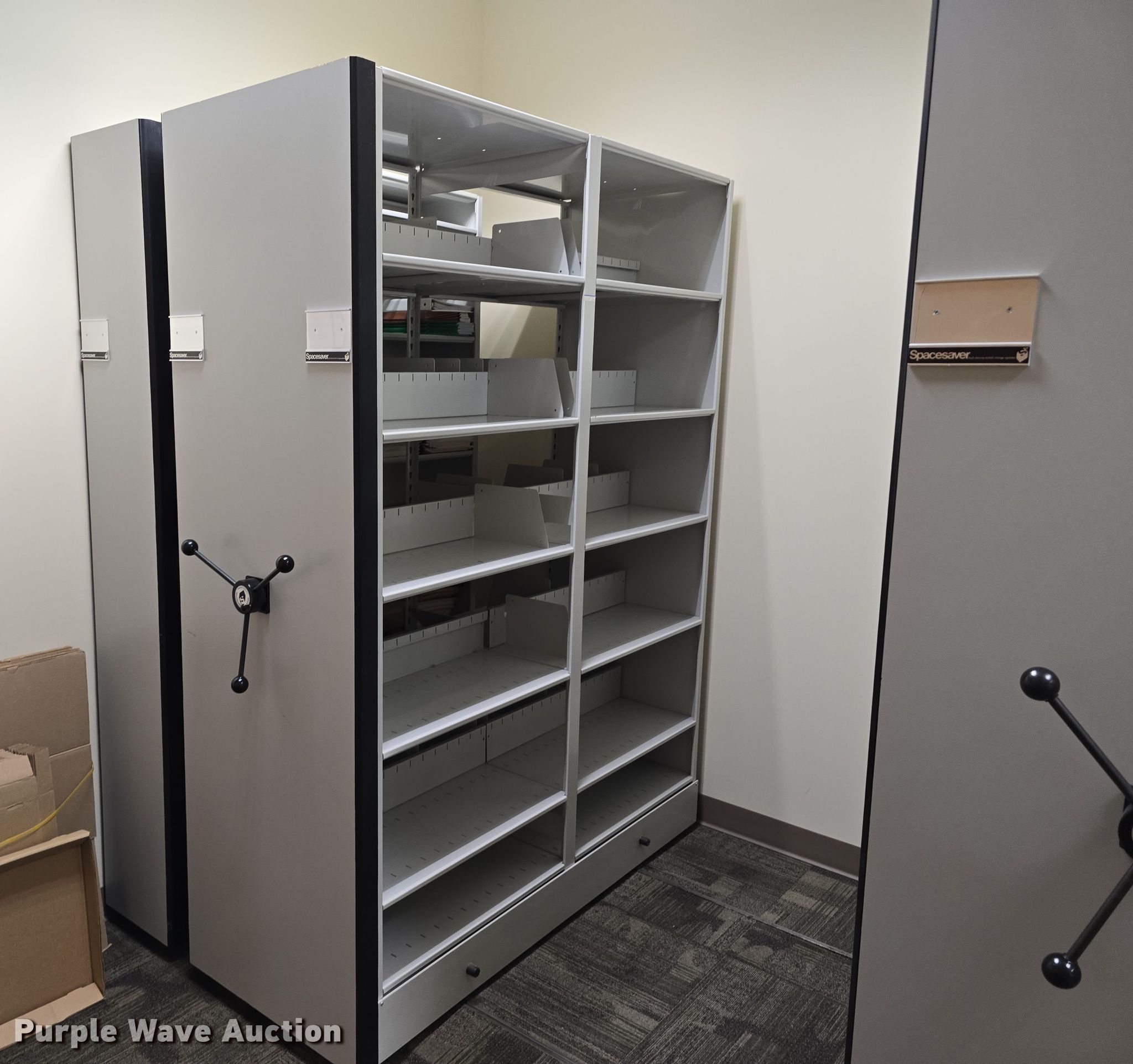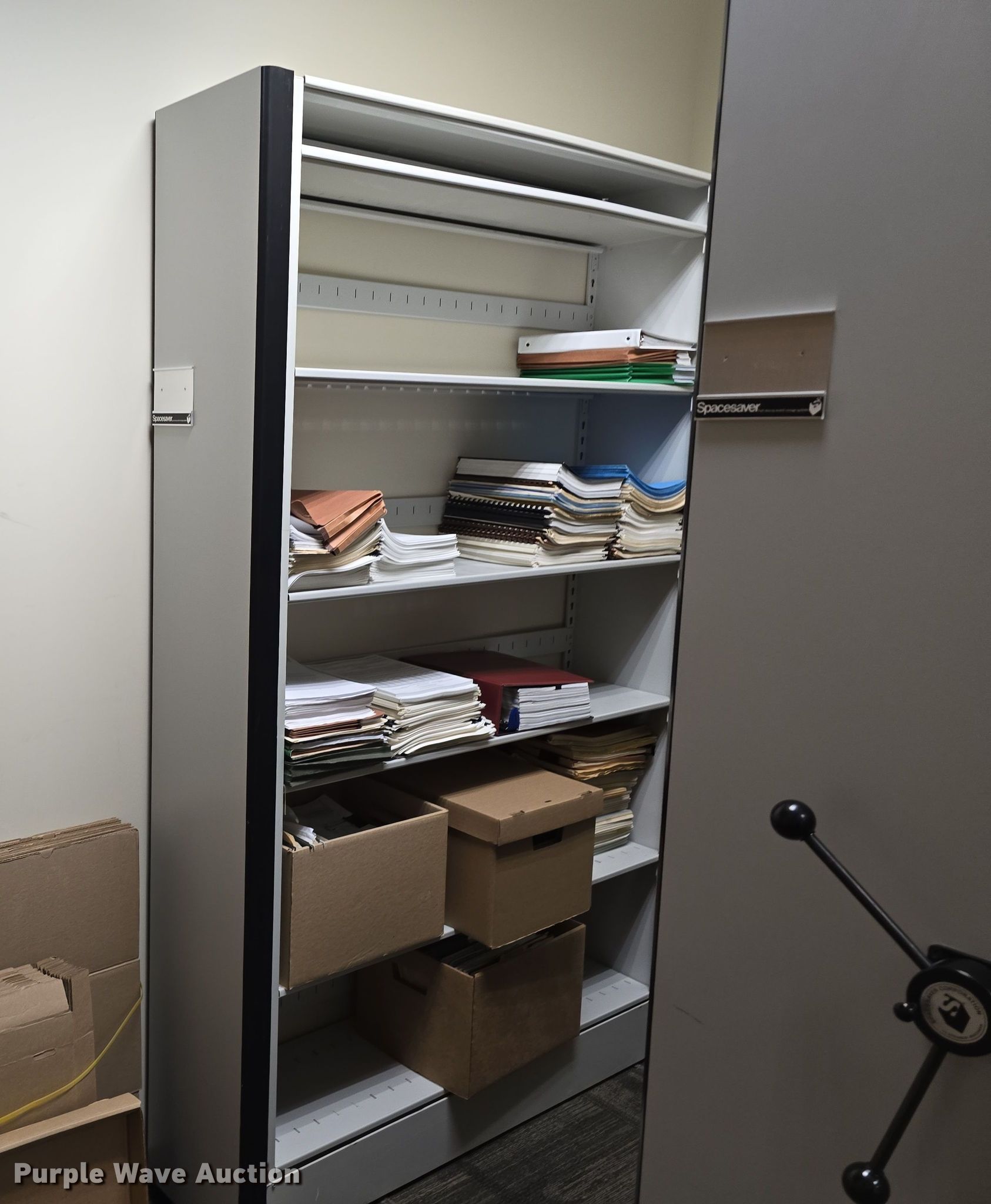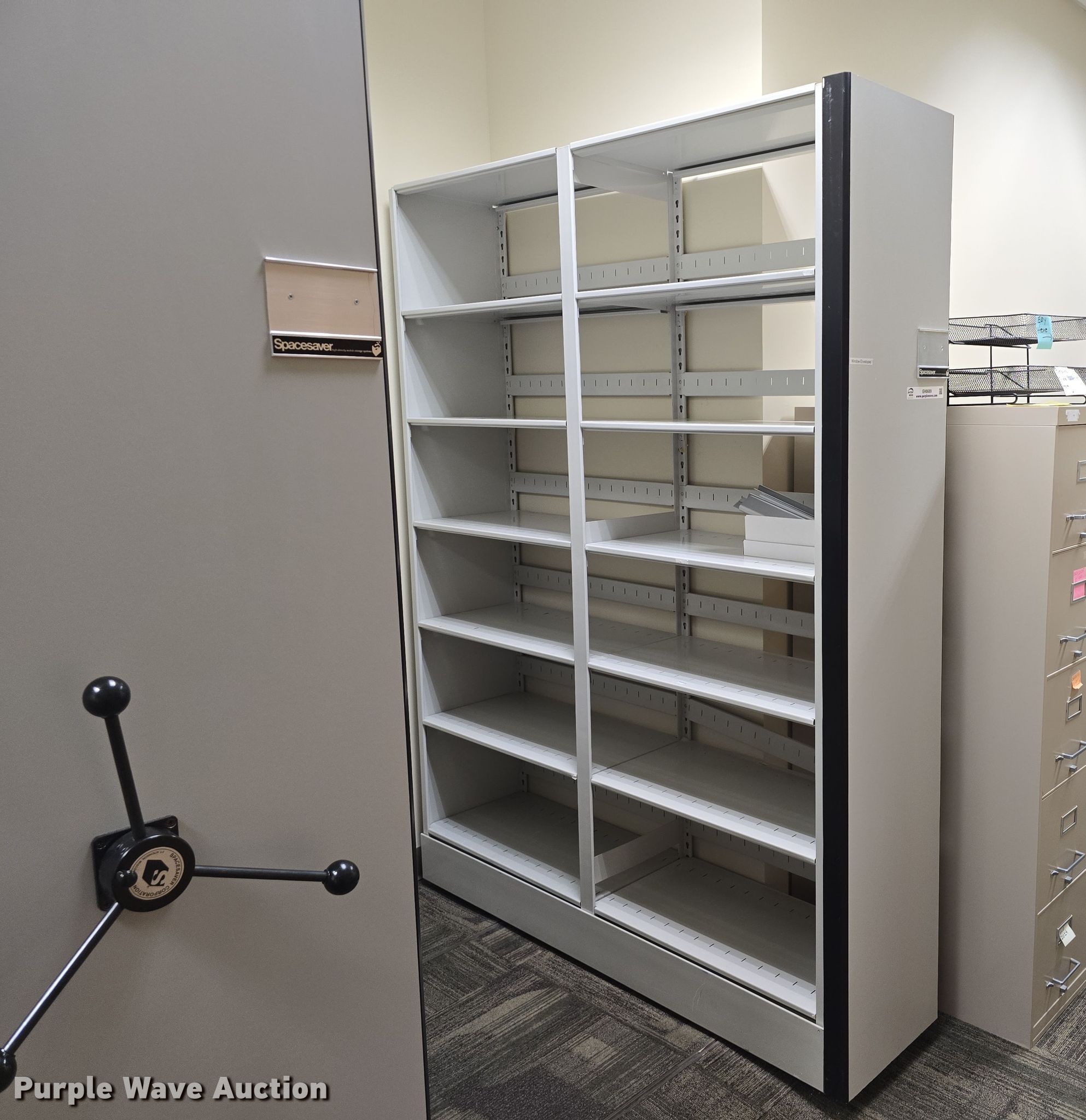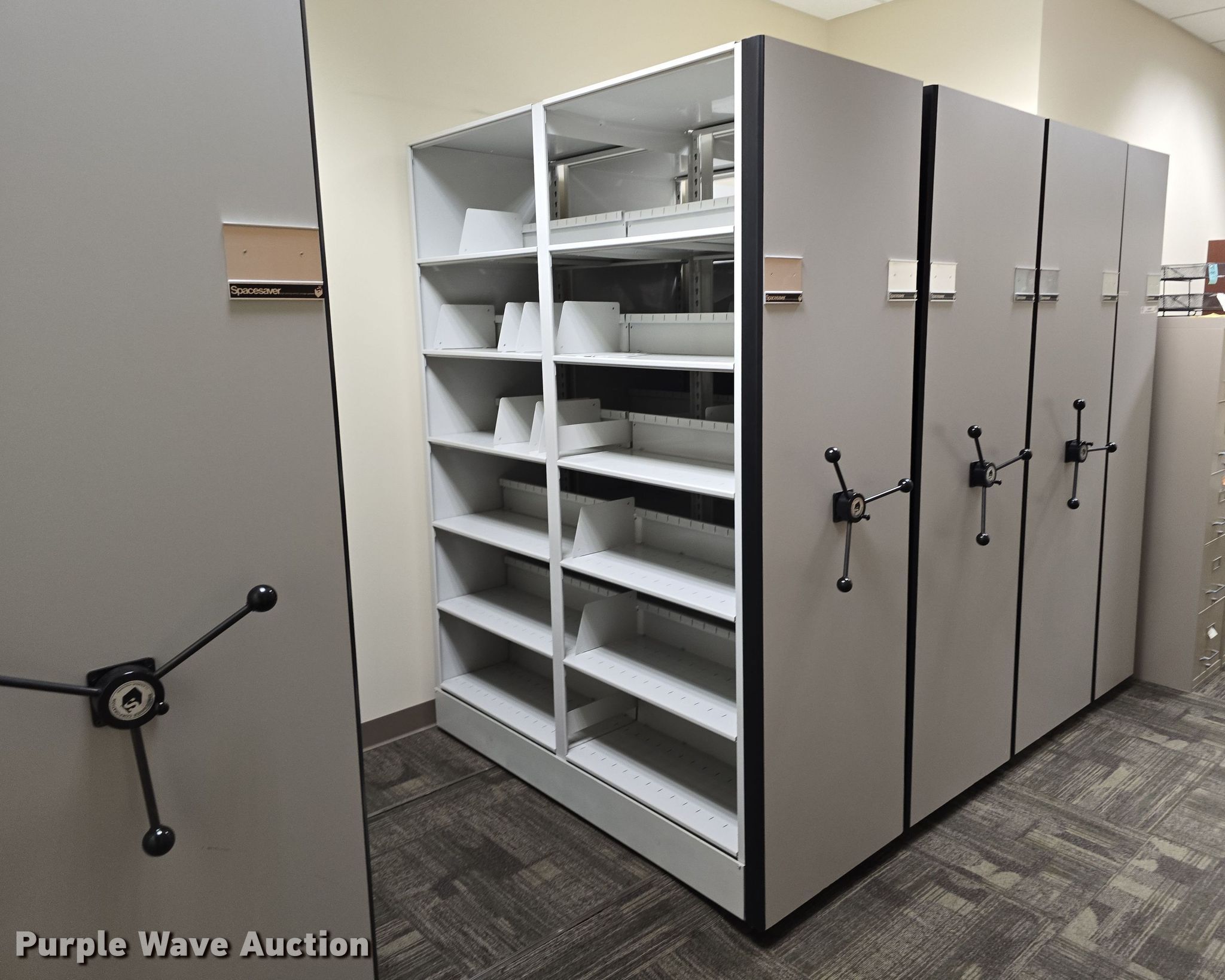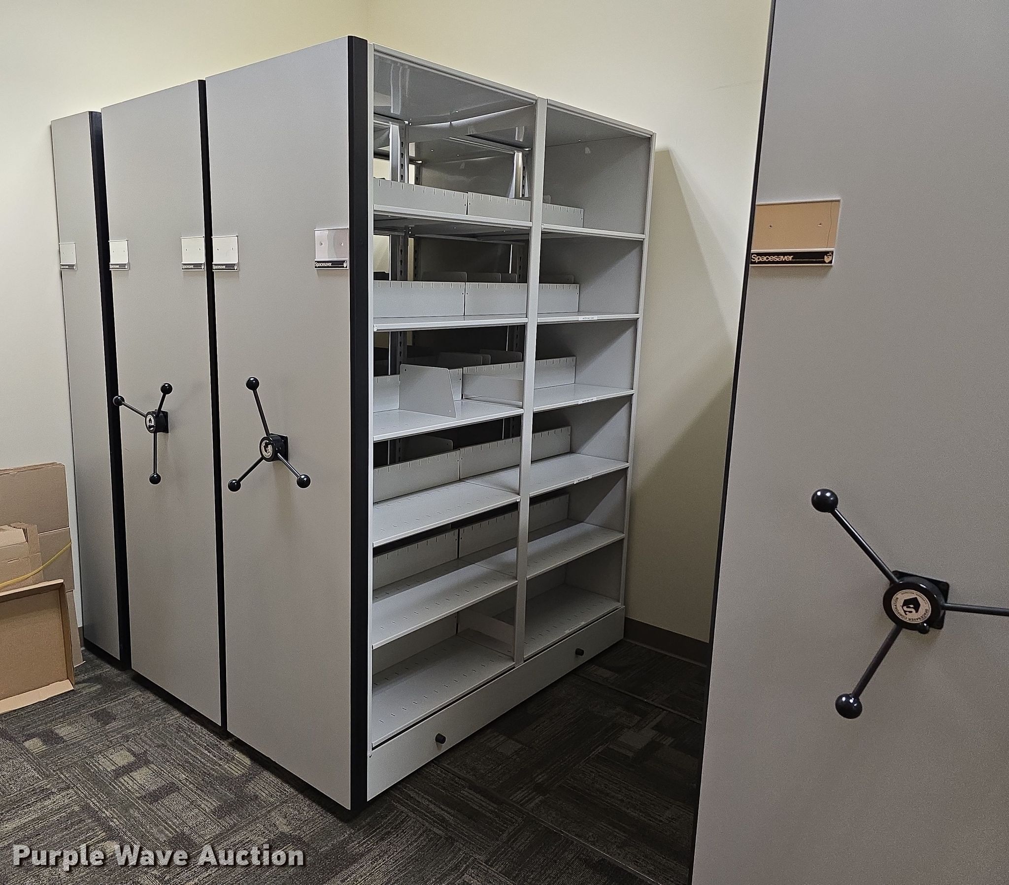 Purple Wave is selling a used Furniture in Nebraska. This item is a Spacesaver storage shelves with the following: (4) 62.5" L x 24" W x 82.5" H, Double-sided storage, 62.5" L x 15" W x 82.5" H, 50.5" L x 12" W x 82 5" H, Track system, Overall: 14' 3" W