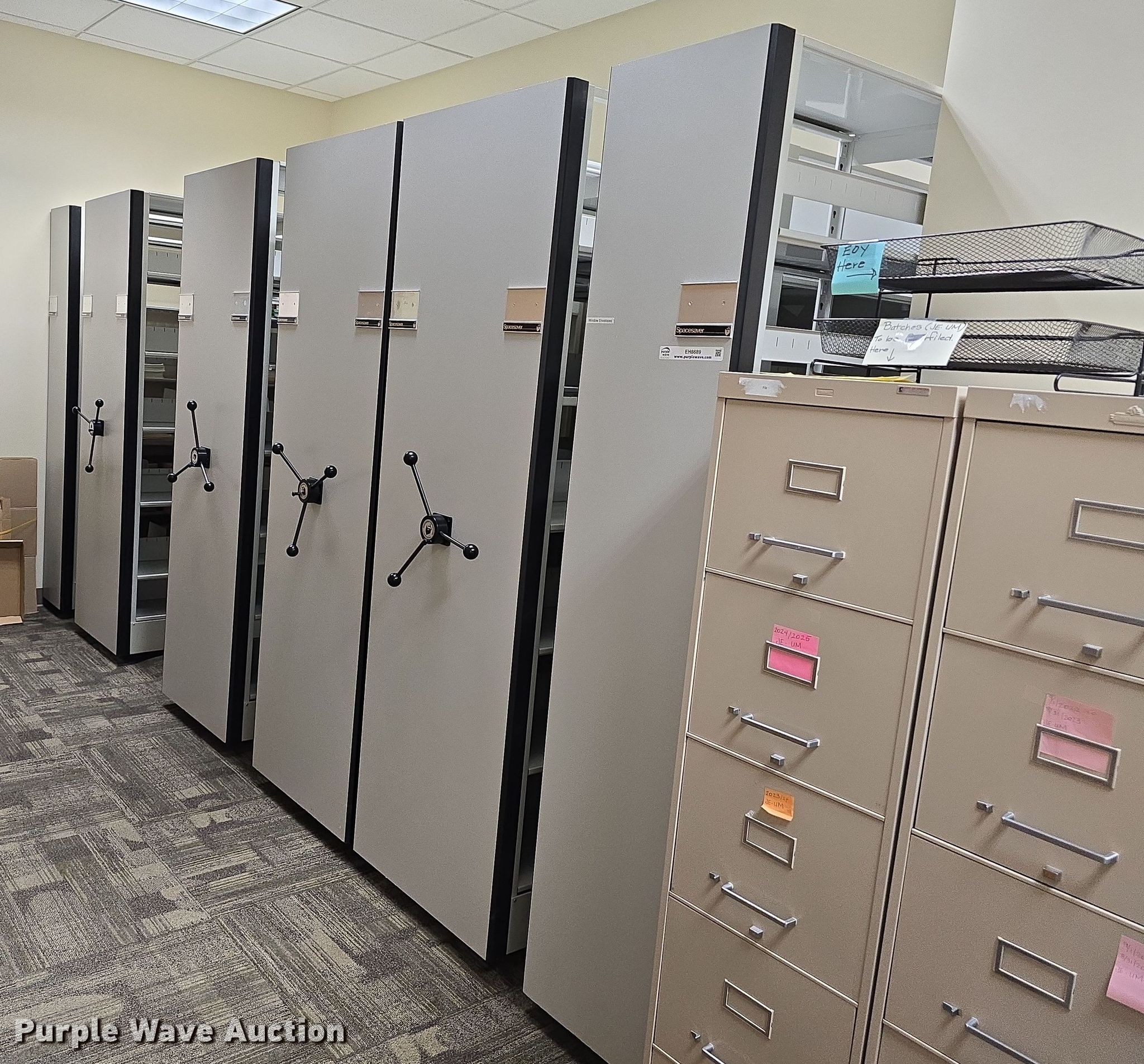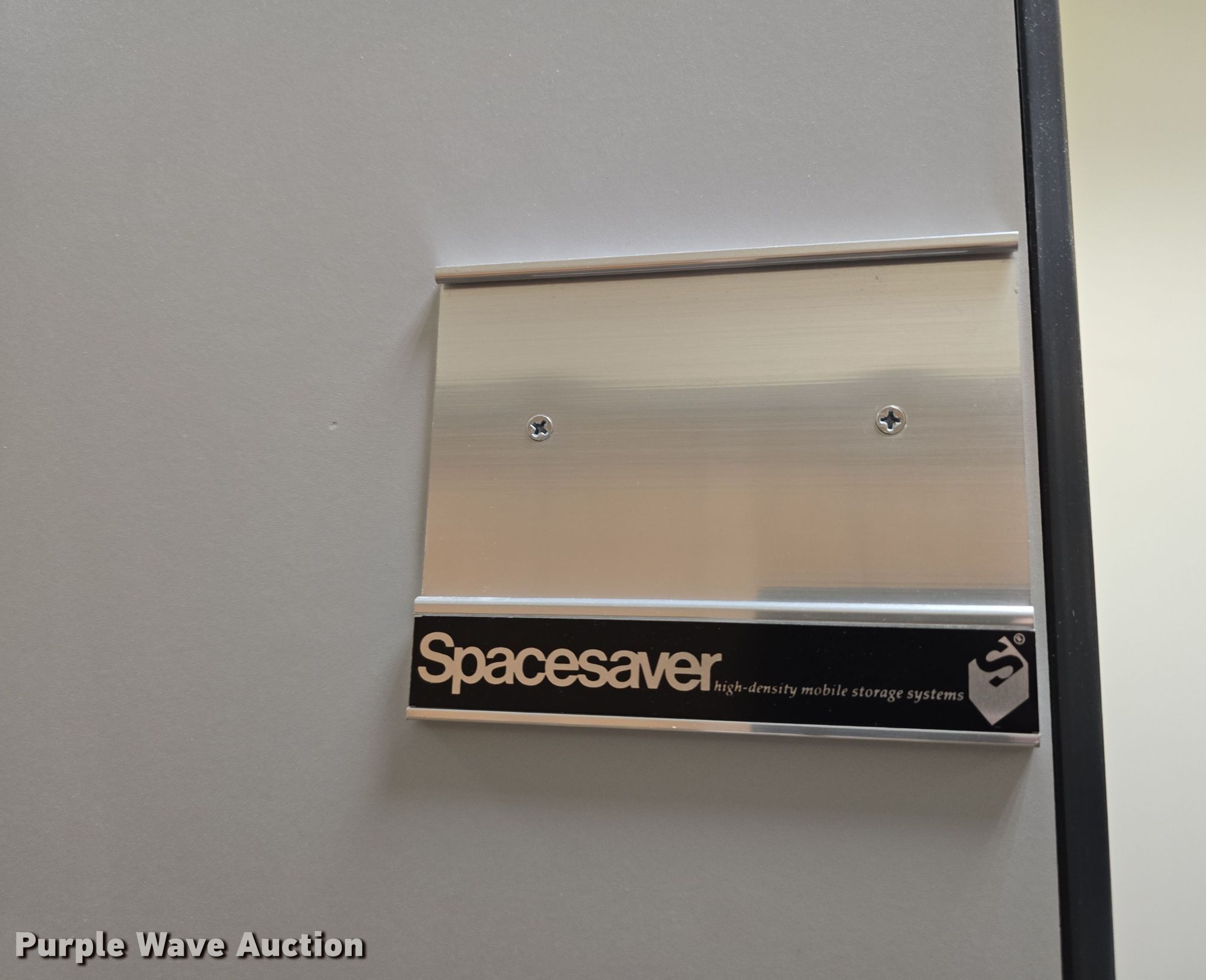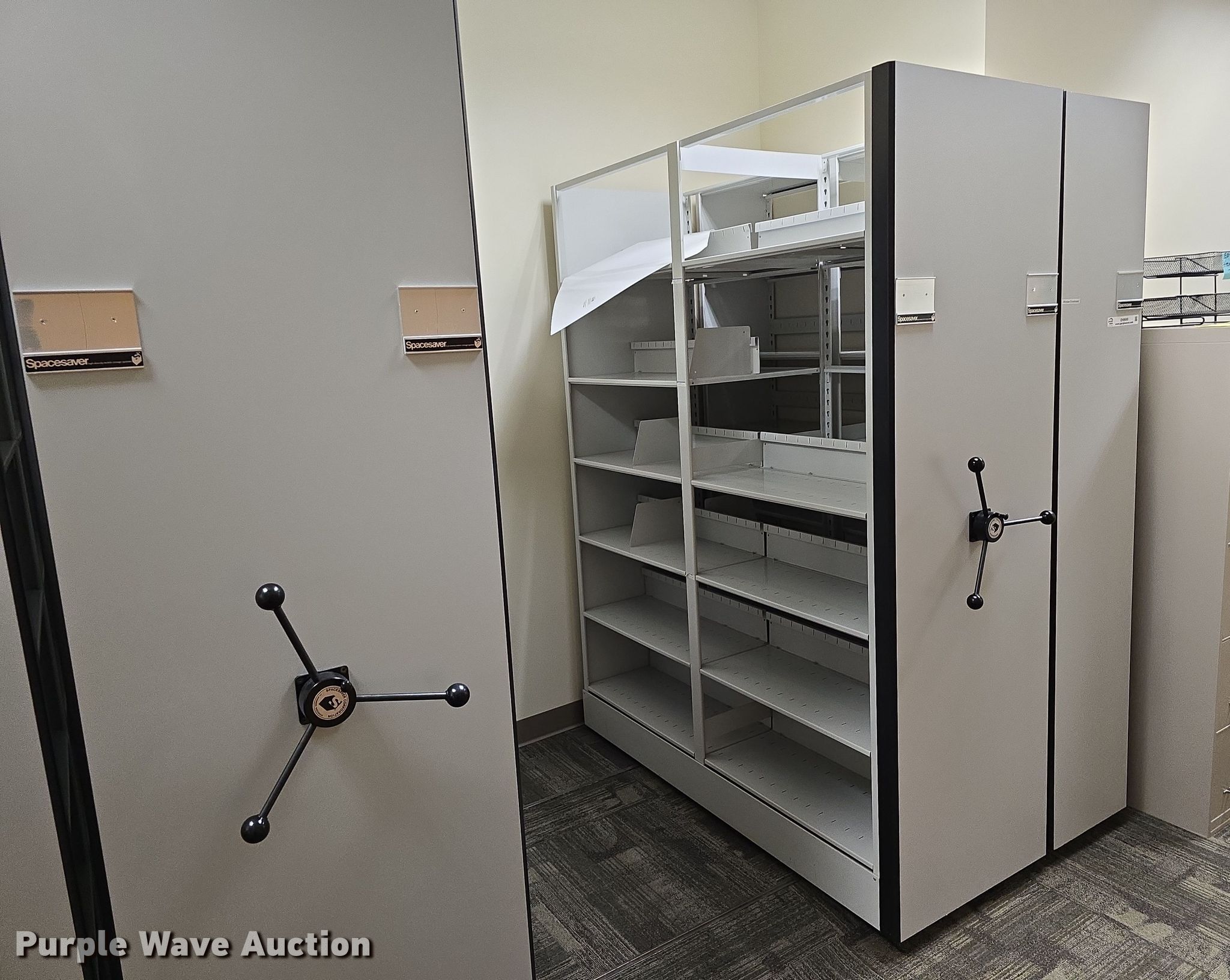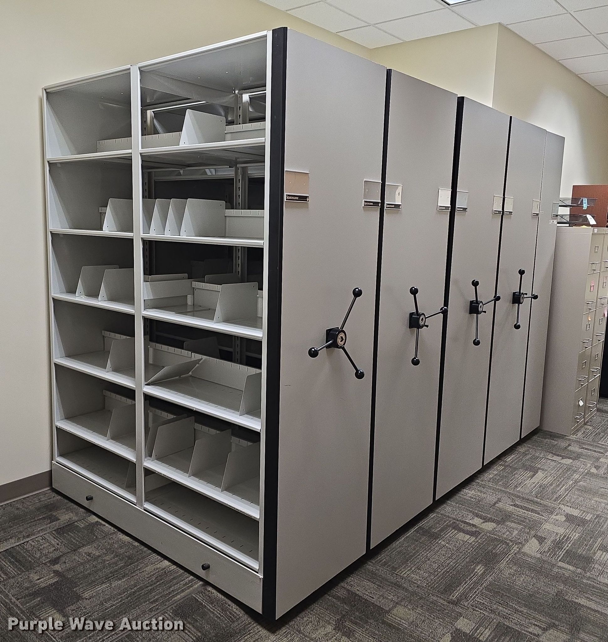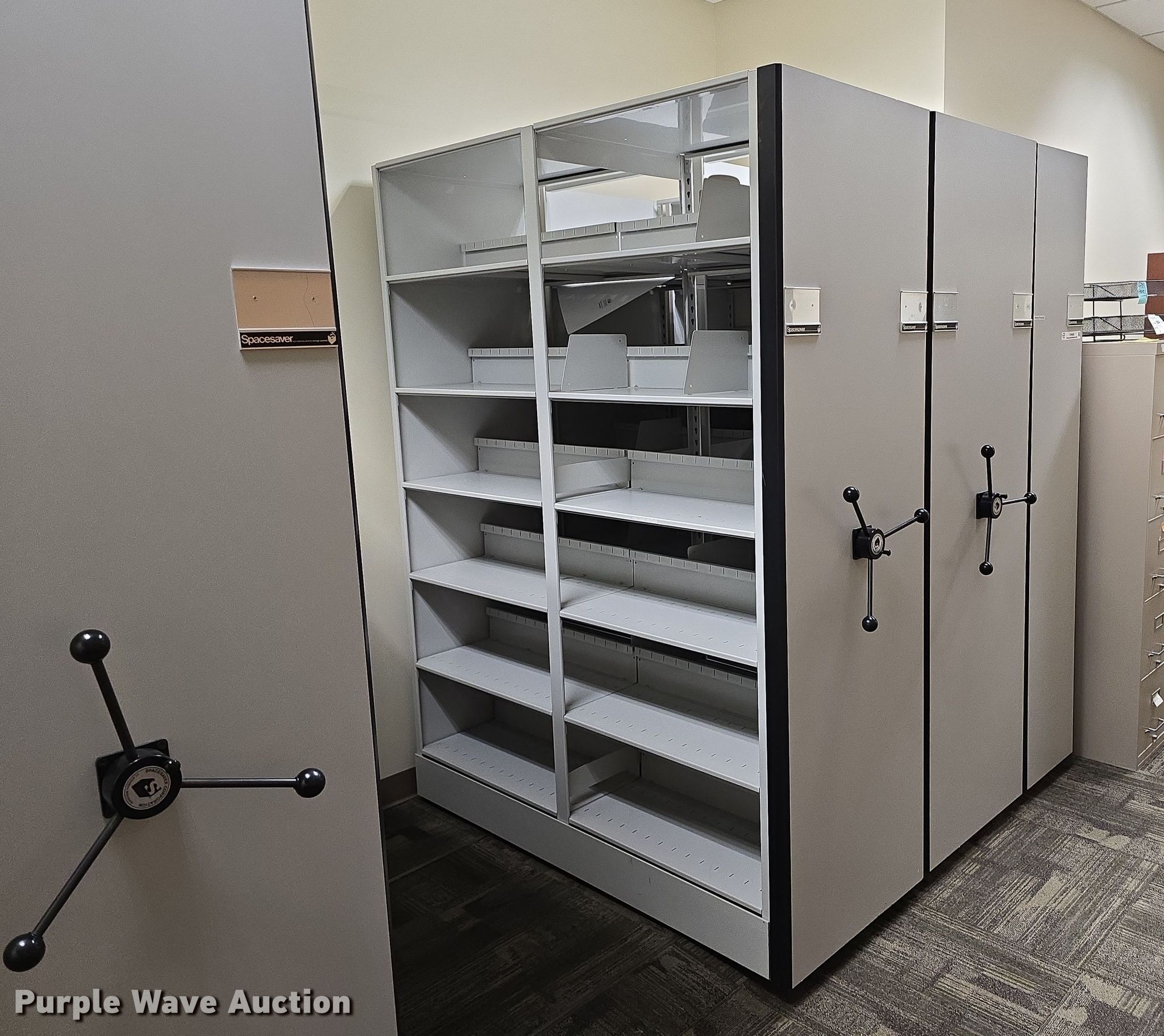 Purple Wave is selling a used Furniture in Nebraska. This item is a Spacesaver storage shelves with the following: (4) 62.5" L x 24" W x 82.5" H, Double-sided storage, 62.5" L x 15" W x 82.5" H, 50.5" L x 12" W x 82 5" H, Track system, Overall: 14' 3" W