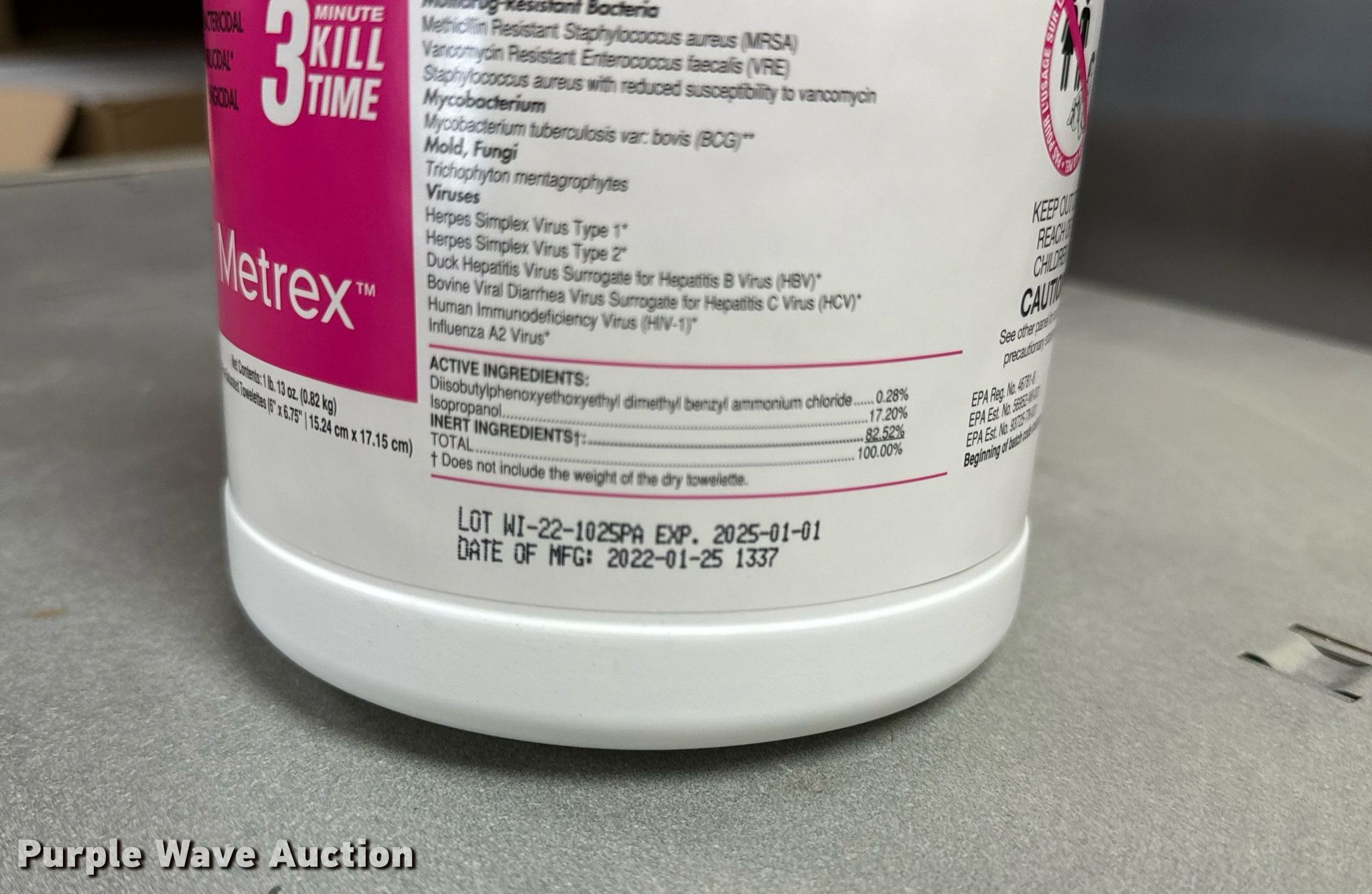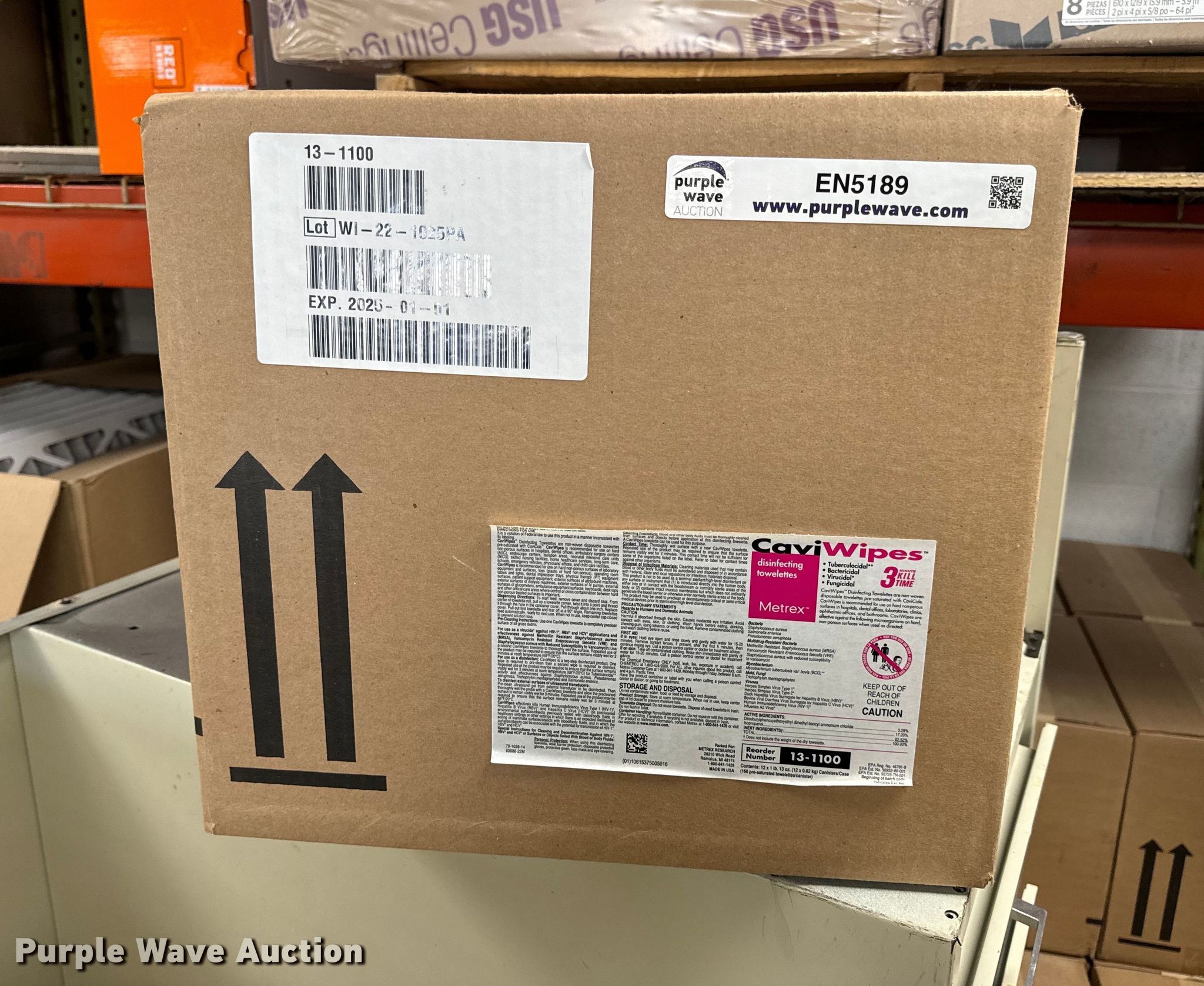 Purple Wave is selling a used All Other Household Items in Missouri. This item is a CaviWipe sanitizing wipes with the following: Approx. 100 boxes, 12 containers per box