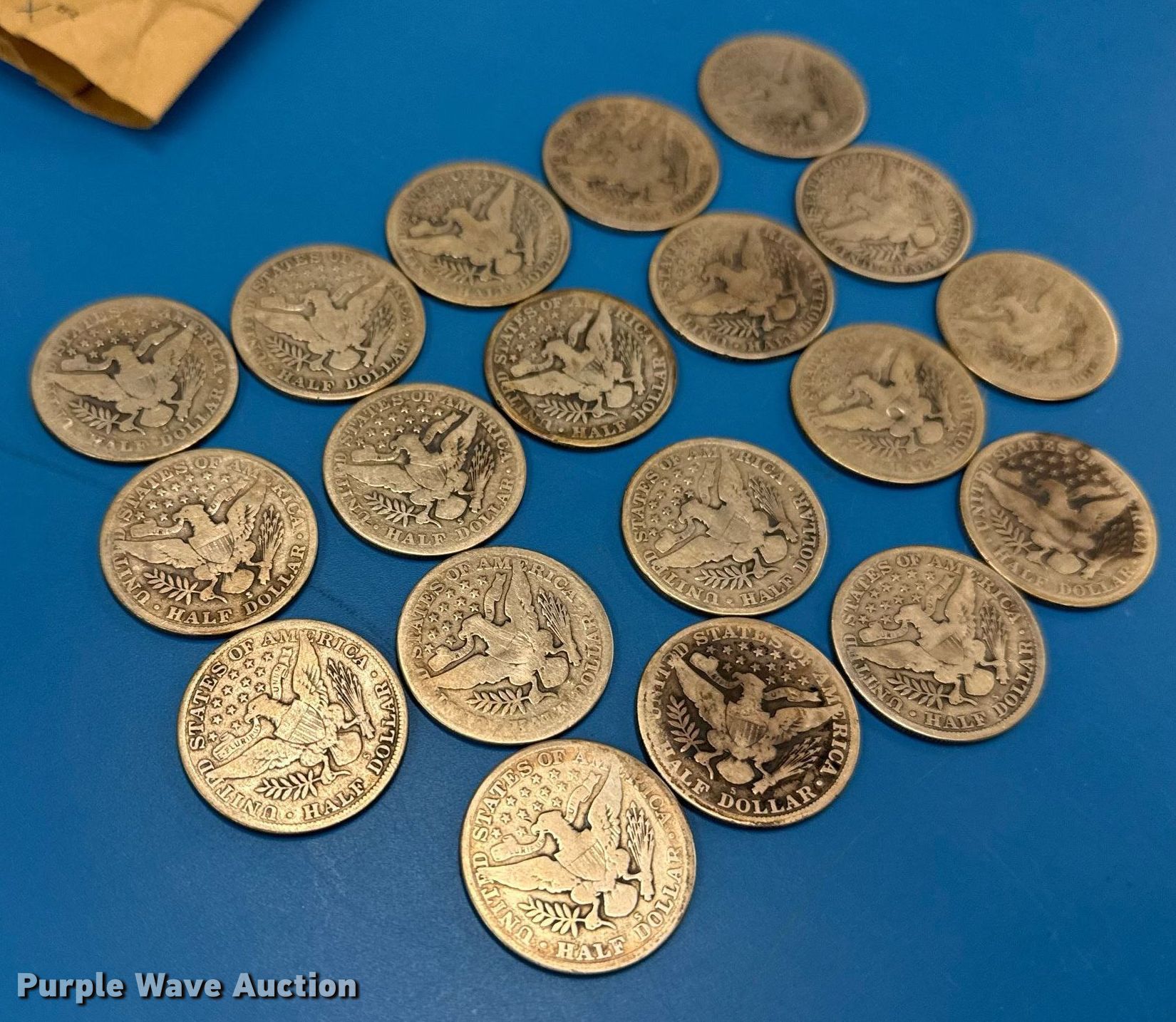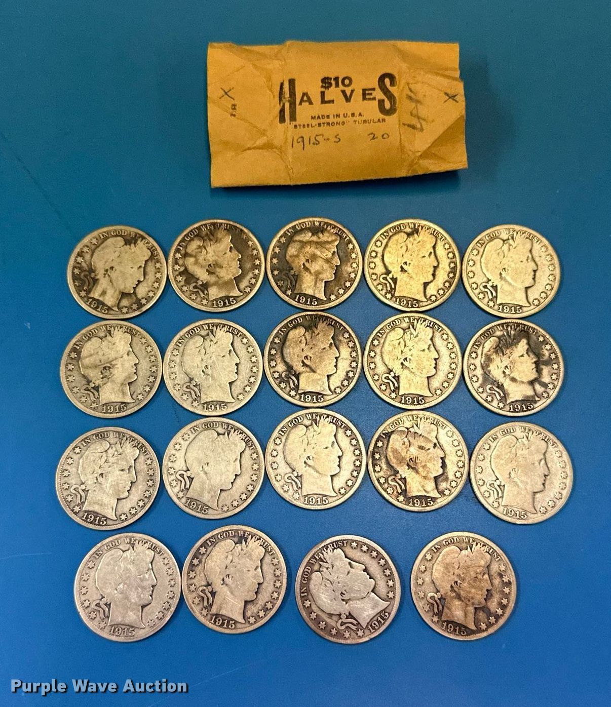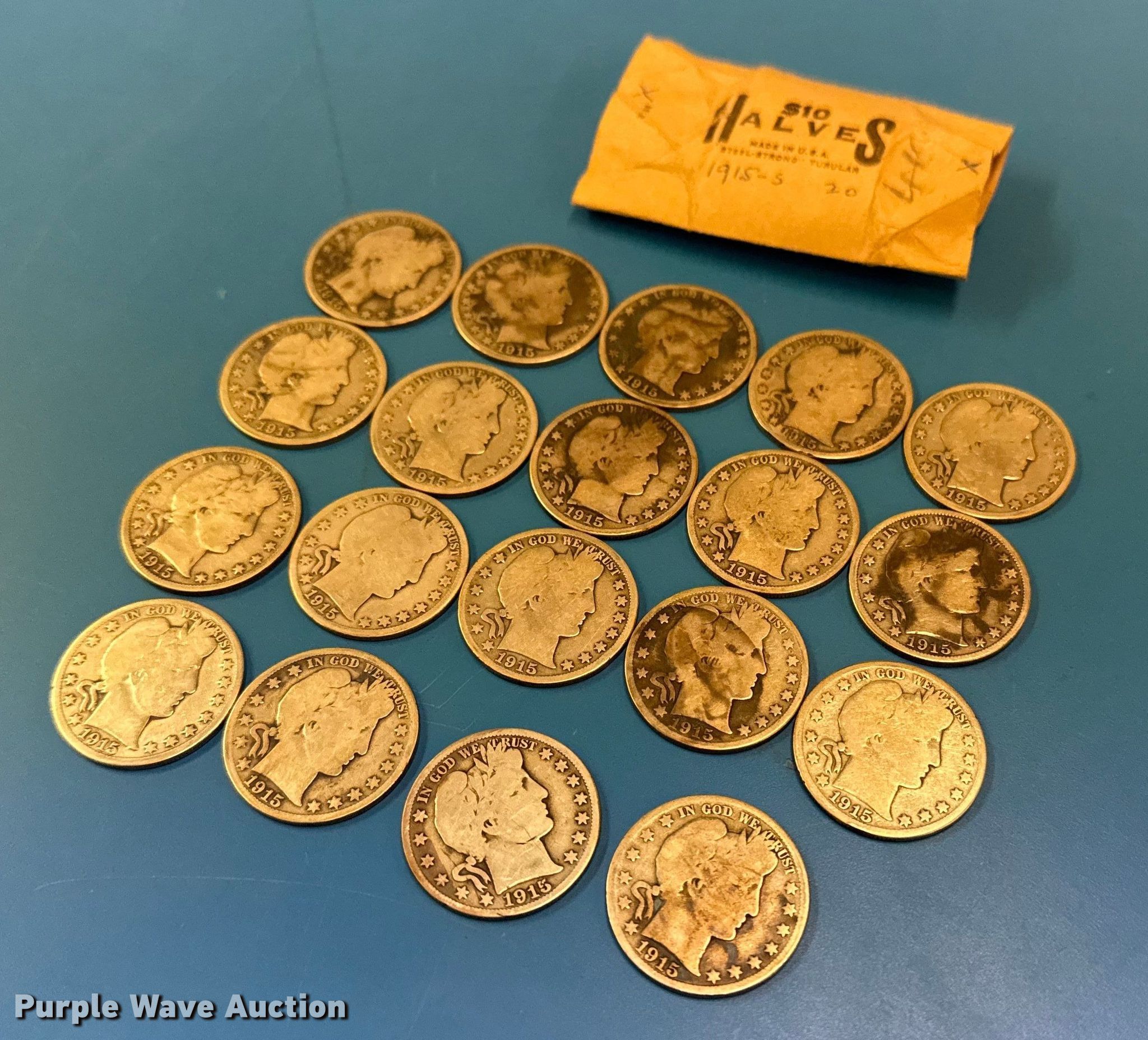 Purple Wave is selling a used All Other Household Items in Oklahoma. This item is a (19) 1915 Barber half dollar silver coins with the following: Unit #: 1001