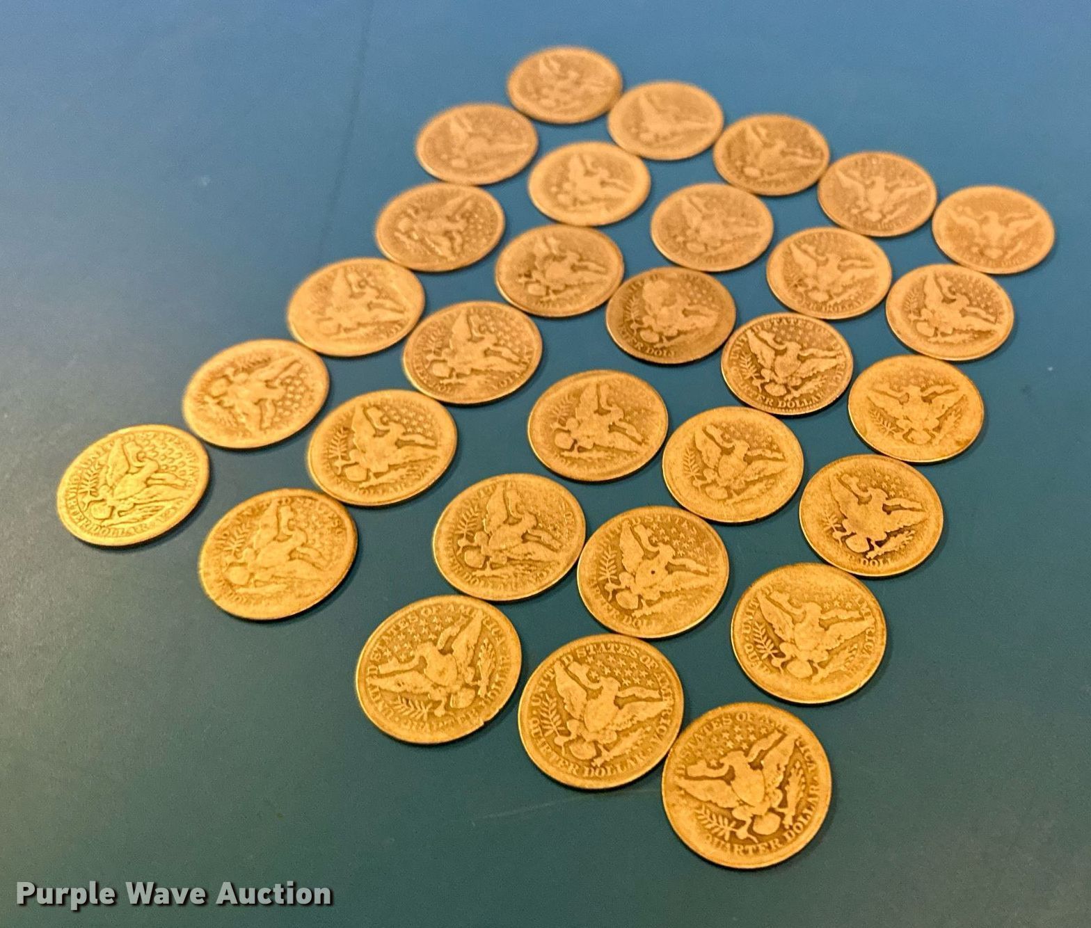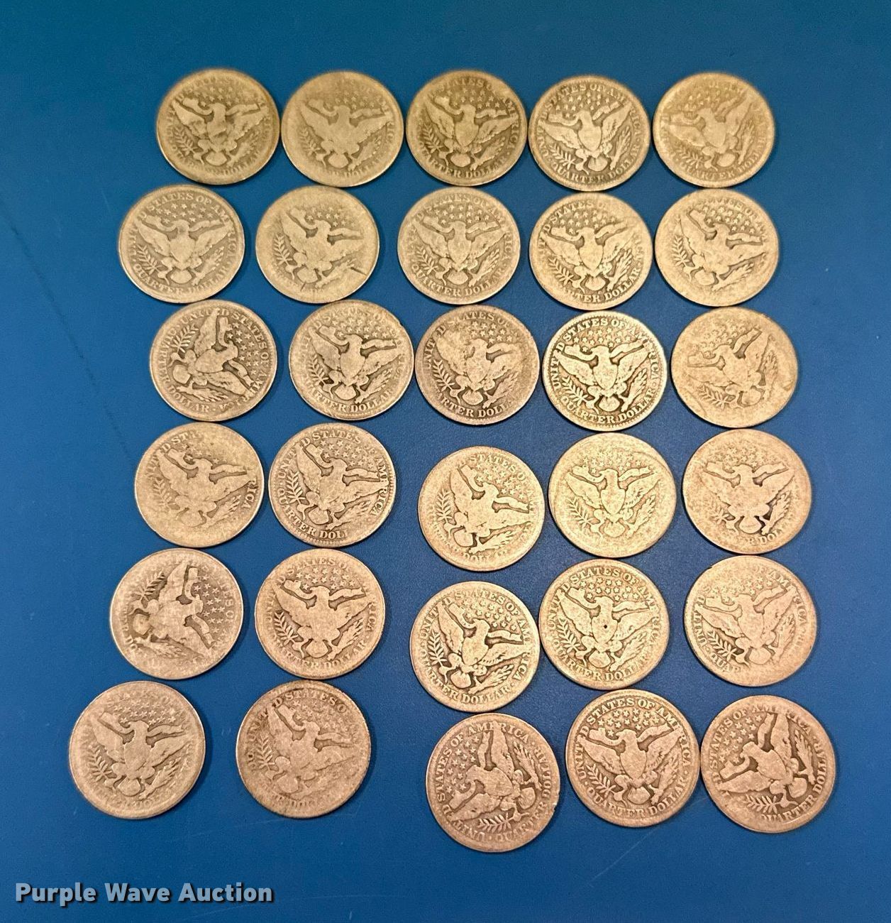 Purple Wave is selling a used All Other Household Items in Oklahoma. This item is a (30) 1909 Barber quarter dollar silver coins with the following: Unit #: 1002