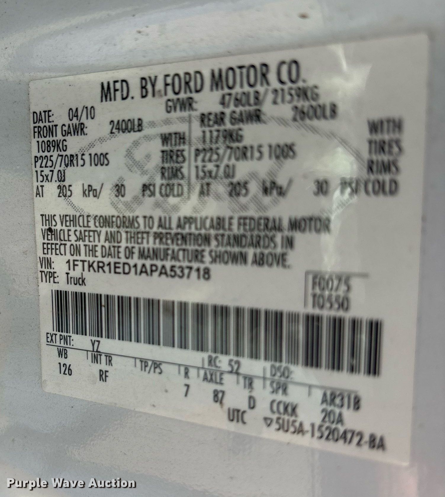 Purple Wave is selling a used Compact Pickup or Van in Oklahoma. This item is a 2010 Ford Ranger SuperCab pickup truck with the following: Miles: 104,467 on odometer, VIN: 1FTKR1ED1APA53718, Unit #: 600