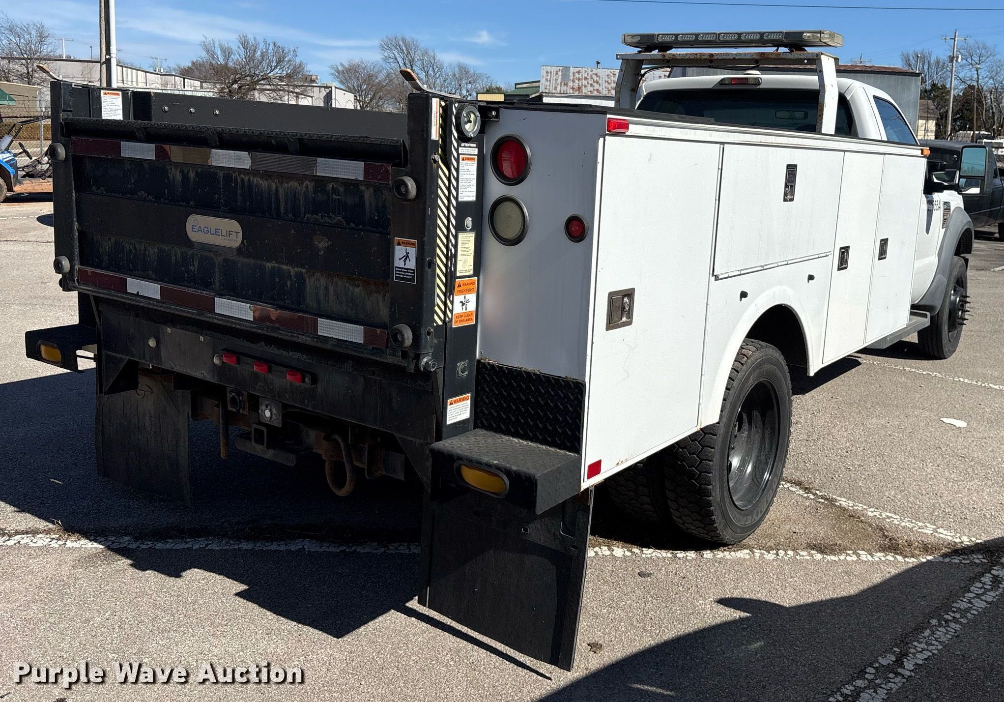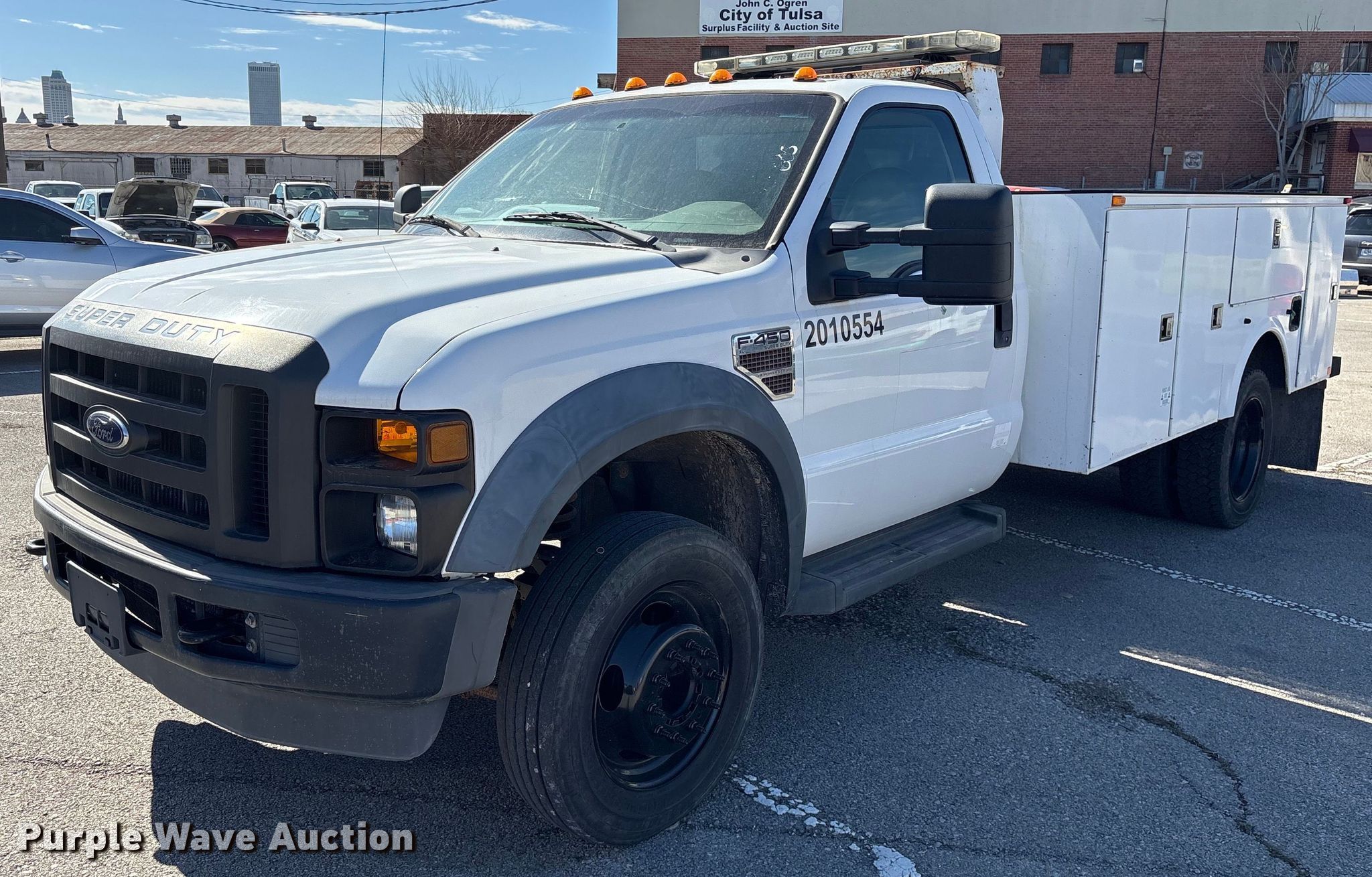 2010 Ford F450 Super Duty utility / service truck. Miles: 93,079 on odometer, VIN: 1FDAF4GR7AEB09392, Unit #: 605. Engine Ford Powerstroke, Displacement: 6.4L, Cylinders: 8, Fuel type: Diesel. Transmission Automatic. Chassis Axles: Single, Suspension: Spring, Brakes: Hydraulic, GVWR: 16,500 lbs, Wheelbase: 165". Interior AC, Heat. Features Bed Omaha, 11' L x 8' W, End gate lift Eagle Lift, Capacity: 1,600 lbs. Tires Size: 225/70R19.5. Oklahoma title. Seller is a government entity who will be assigning and distributing the title. Please contact the seller for distribution questions. Title distribution may be delayed up to 30 days from verification of funds. City of Tulsa. 108 N Trenton Ave. Tulsa, OK 74120