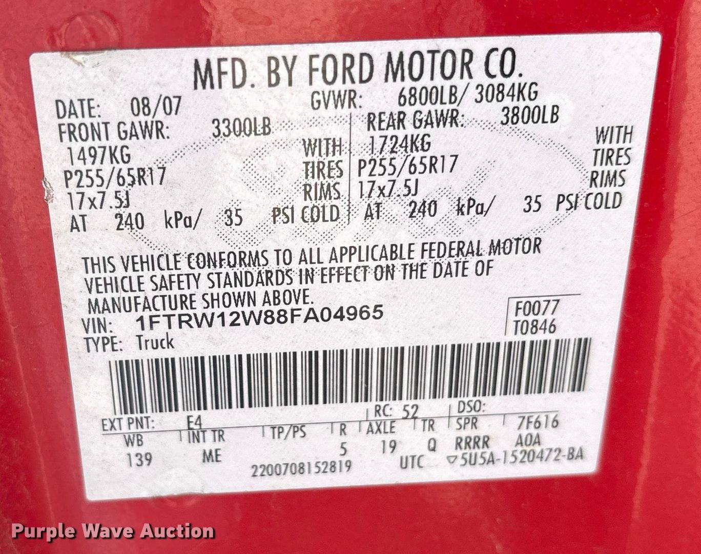 Purple Wave is selling a used 1/2 Ton Pickup or Van in Oklahoma. This item is a 2008 Ford F150 SuperCrew pickup truck with the following: Miles: 150,438 on odometer, VIN: 1FTRW12W88FA04965, Unit #: 617