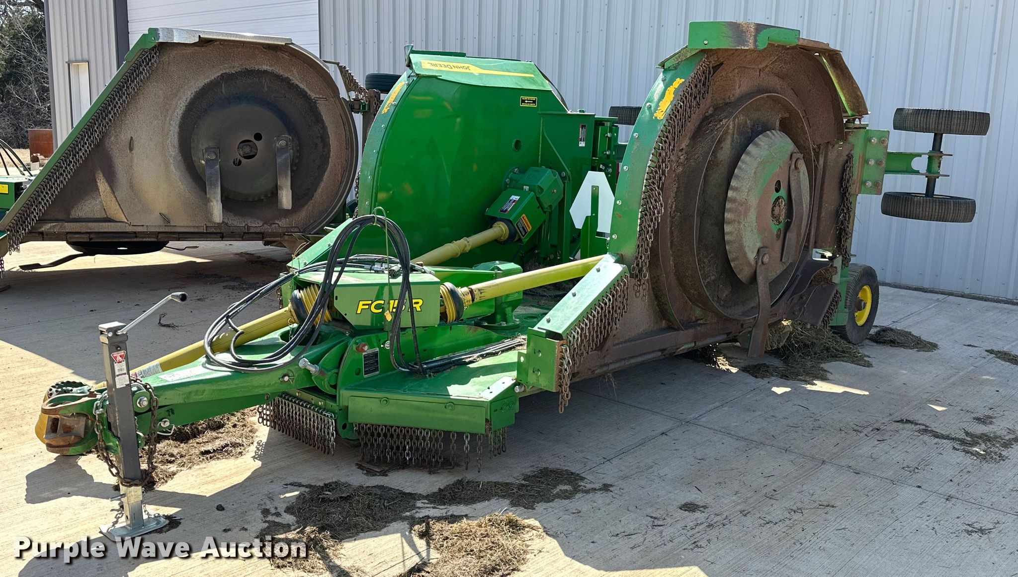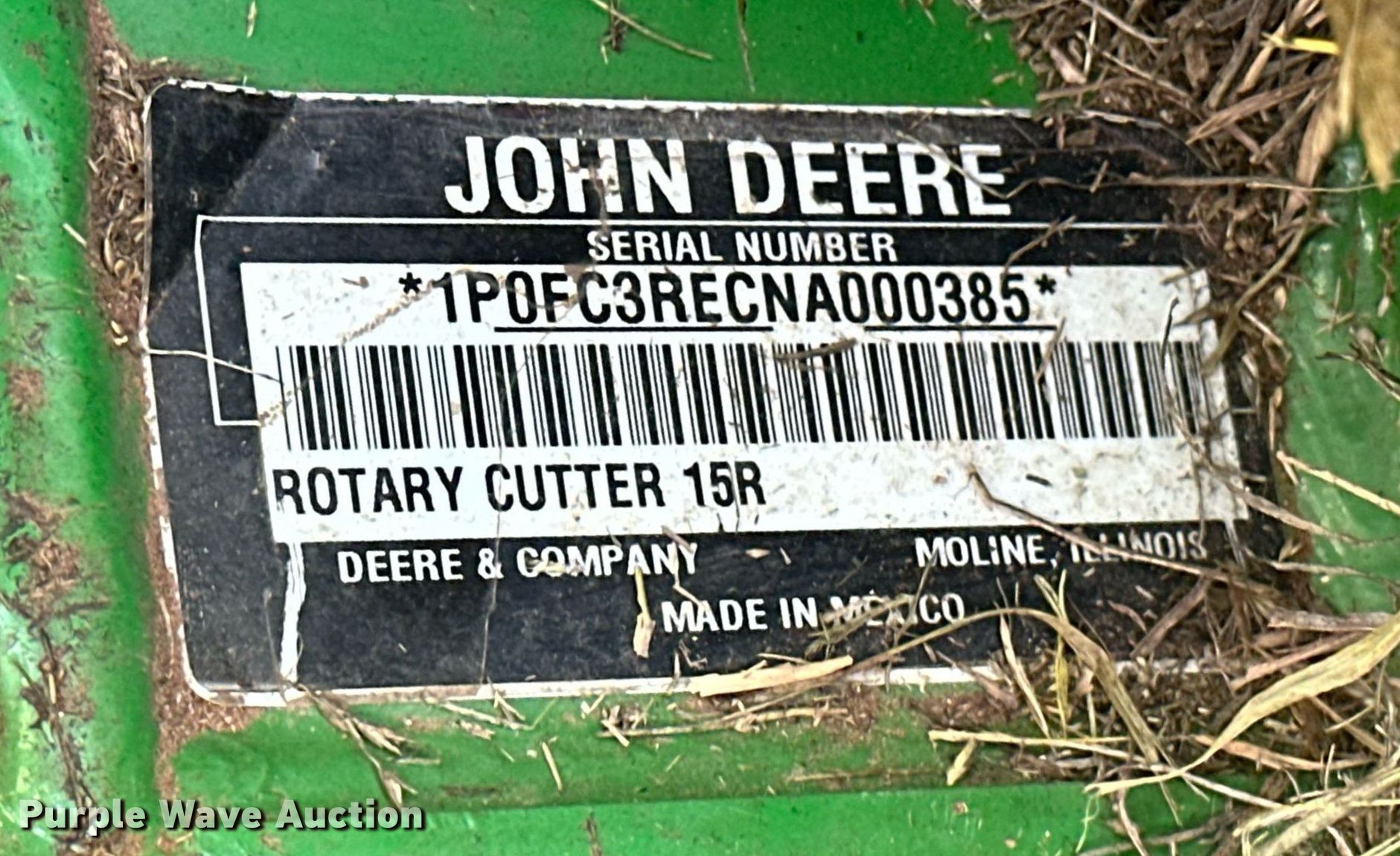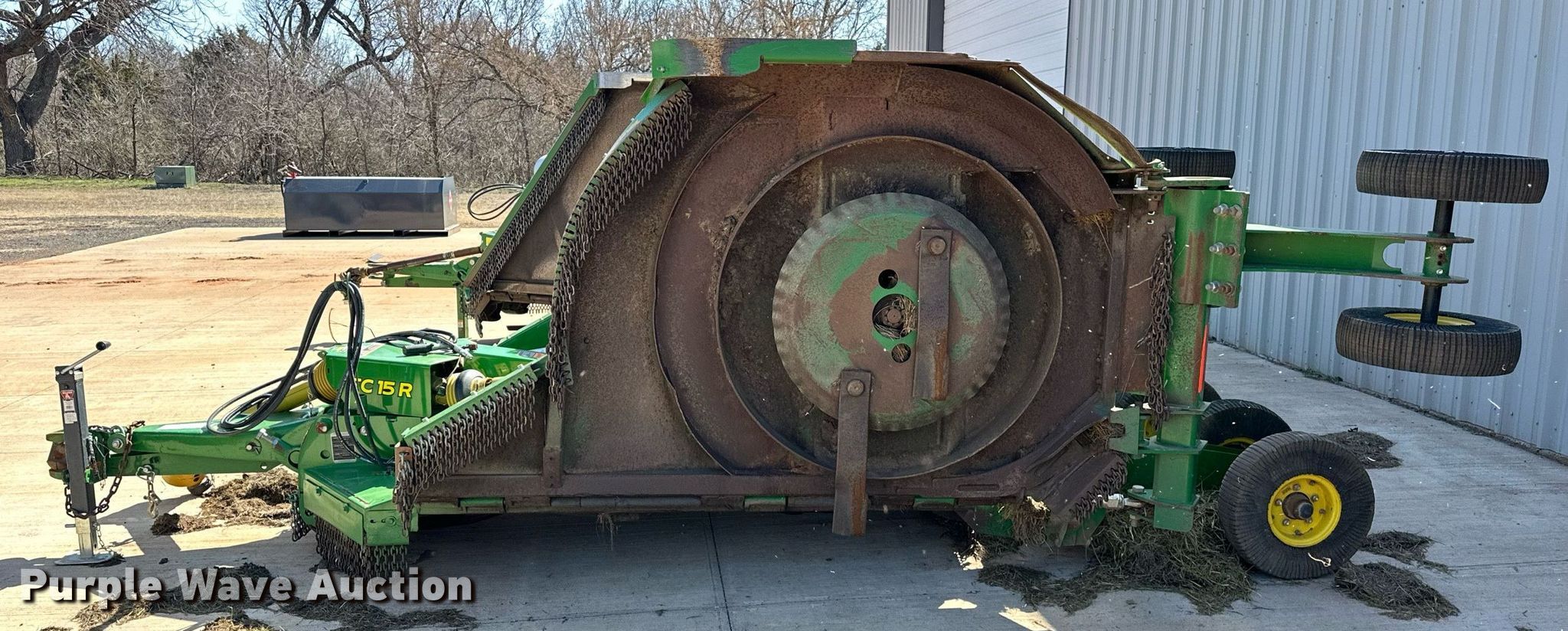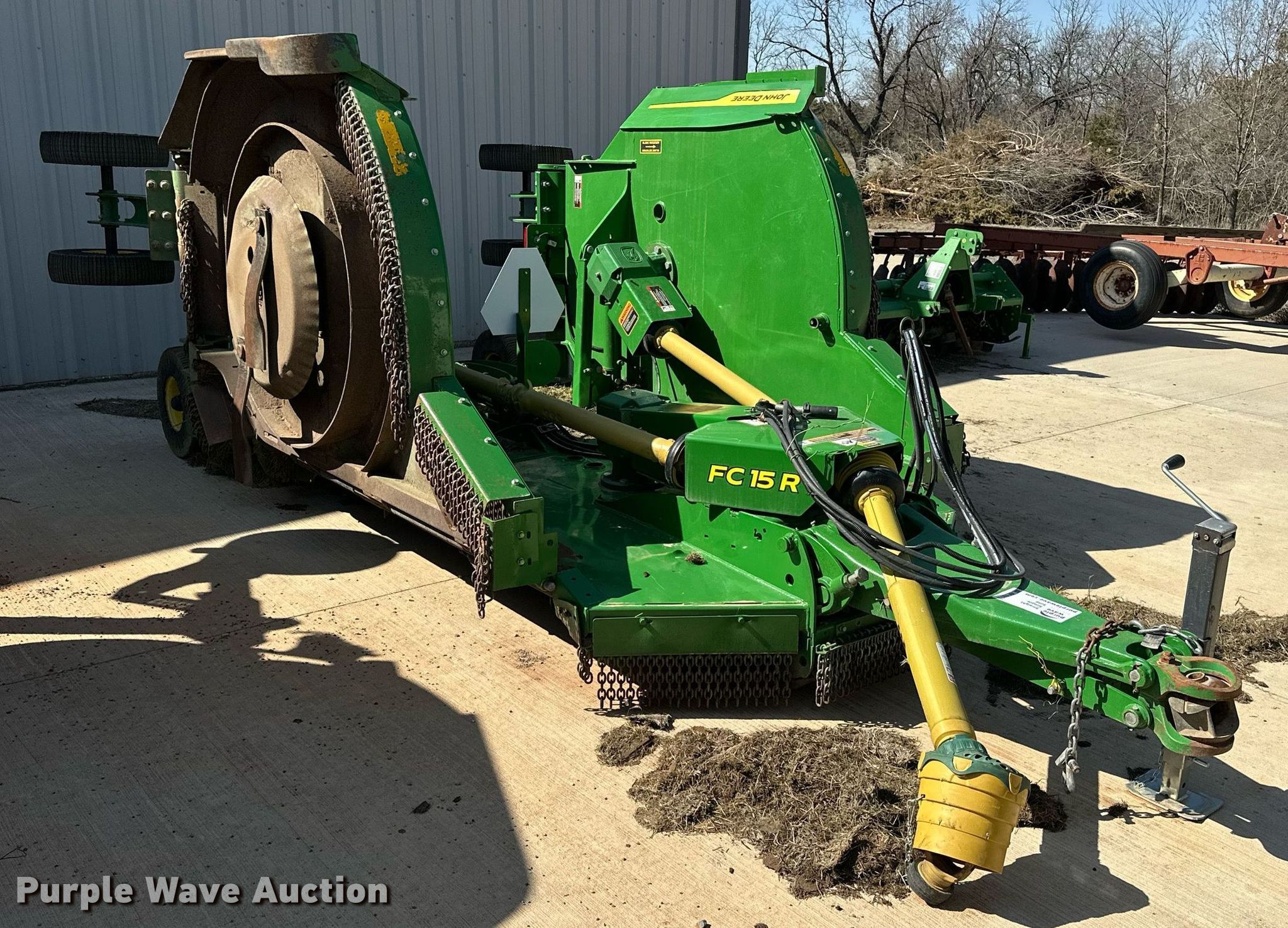 2022 John Deere FC15R batwing rotary mower. Serial: 1P0FC3RECNA000385. Features Width: 15', Hydraulic lift, Hydraulic fold, PTO: 540. Tires Solid. 7820 NW Expressway. Okarche, OK 73762