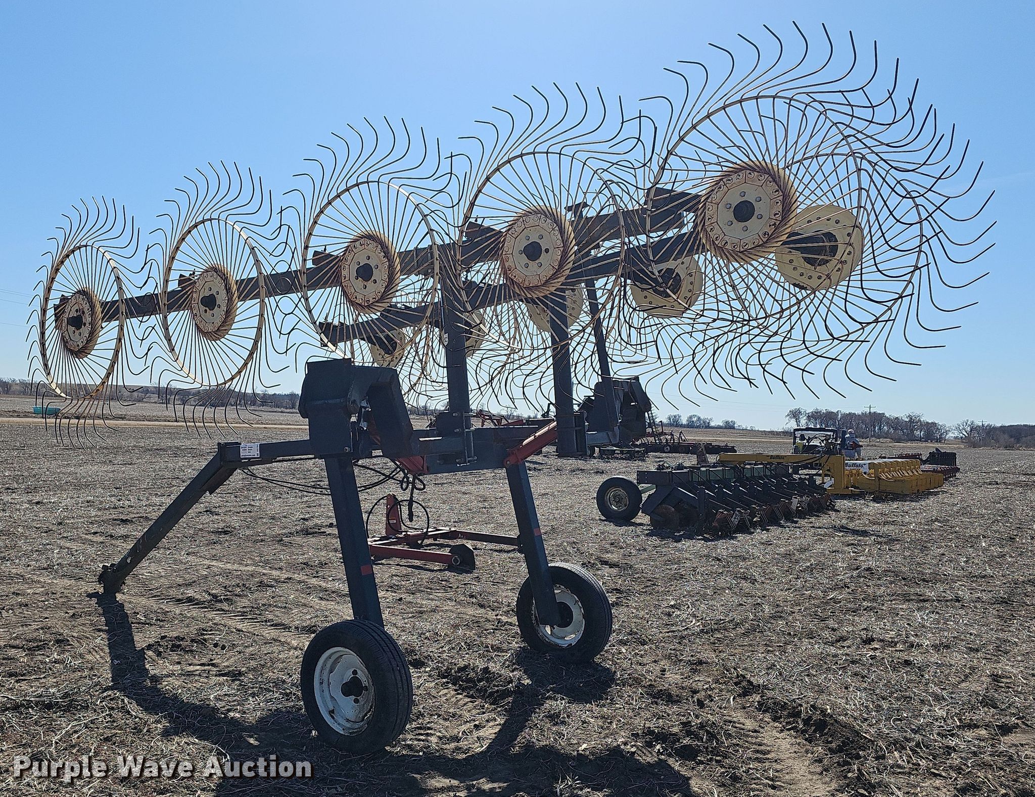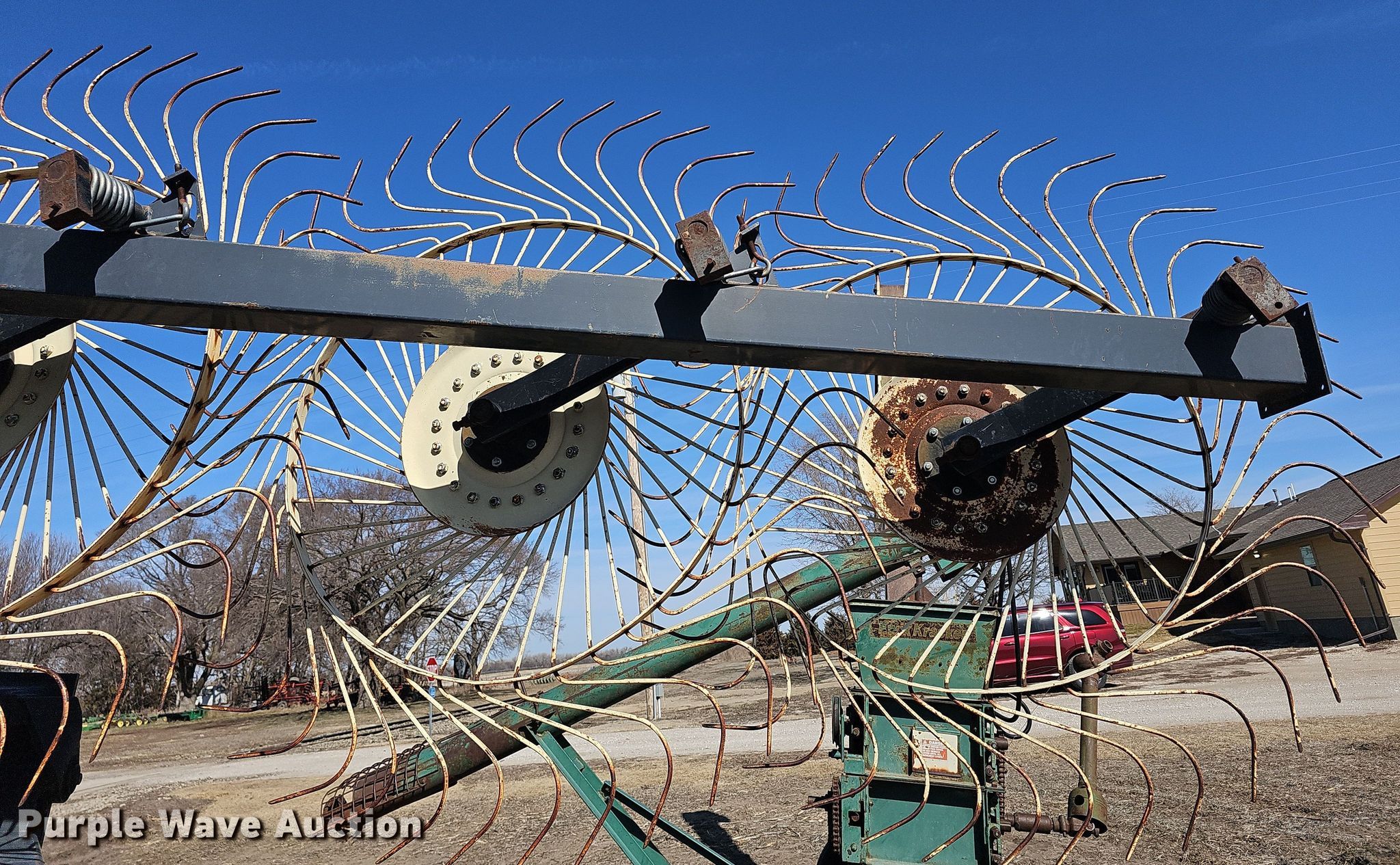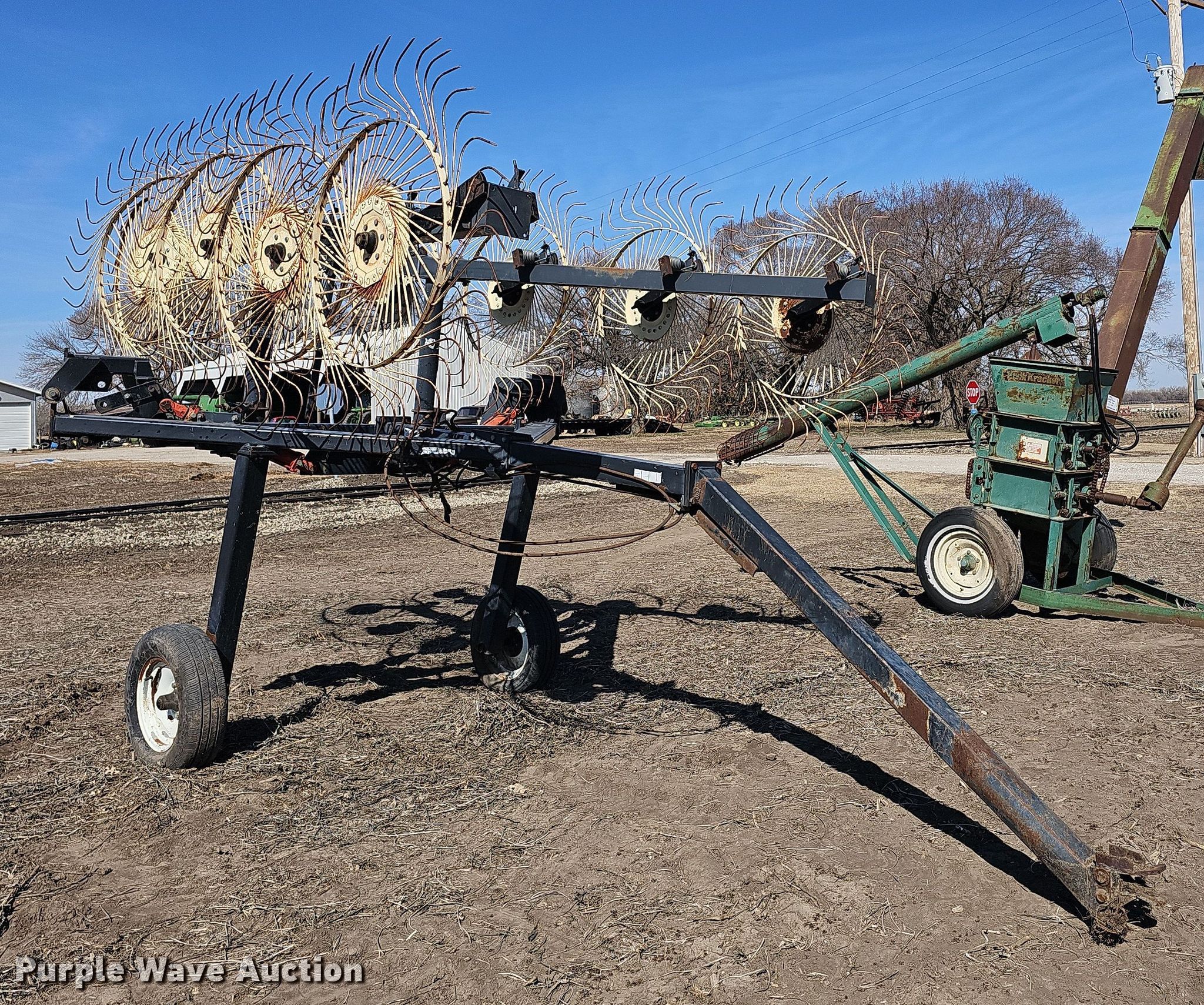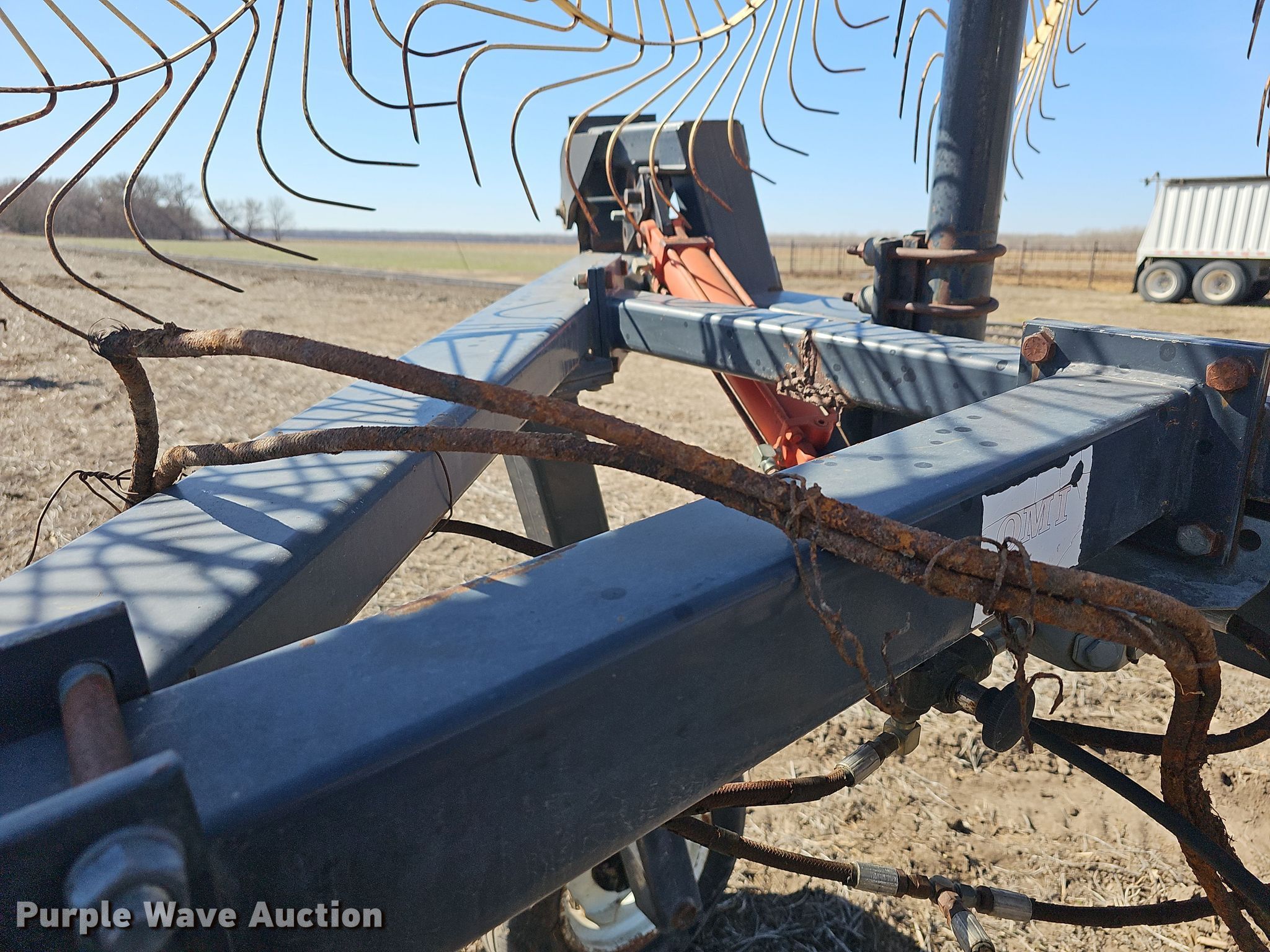 Purple Wave is selling a used Hay Rake in Kansas. This item is a OMI hay rake with the following: Width: 11', Wheels: 10, Diameter: 56", Hydraulic lift, Hydraulic fold, Hitch: Pin
