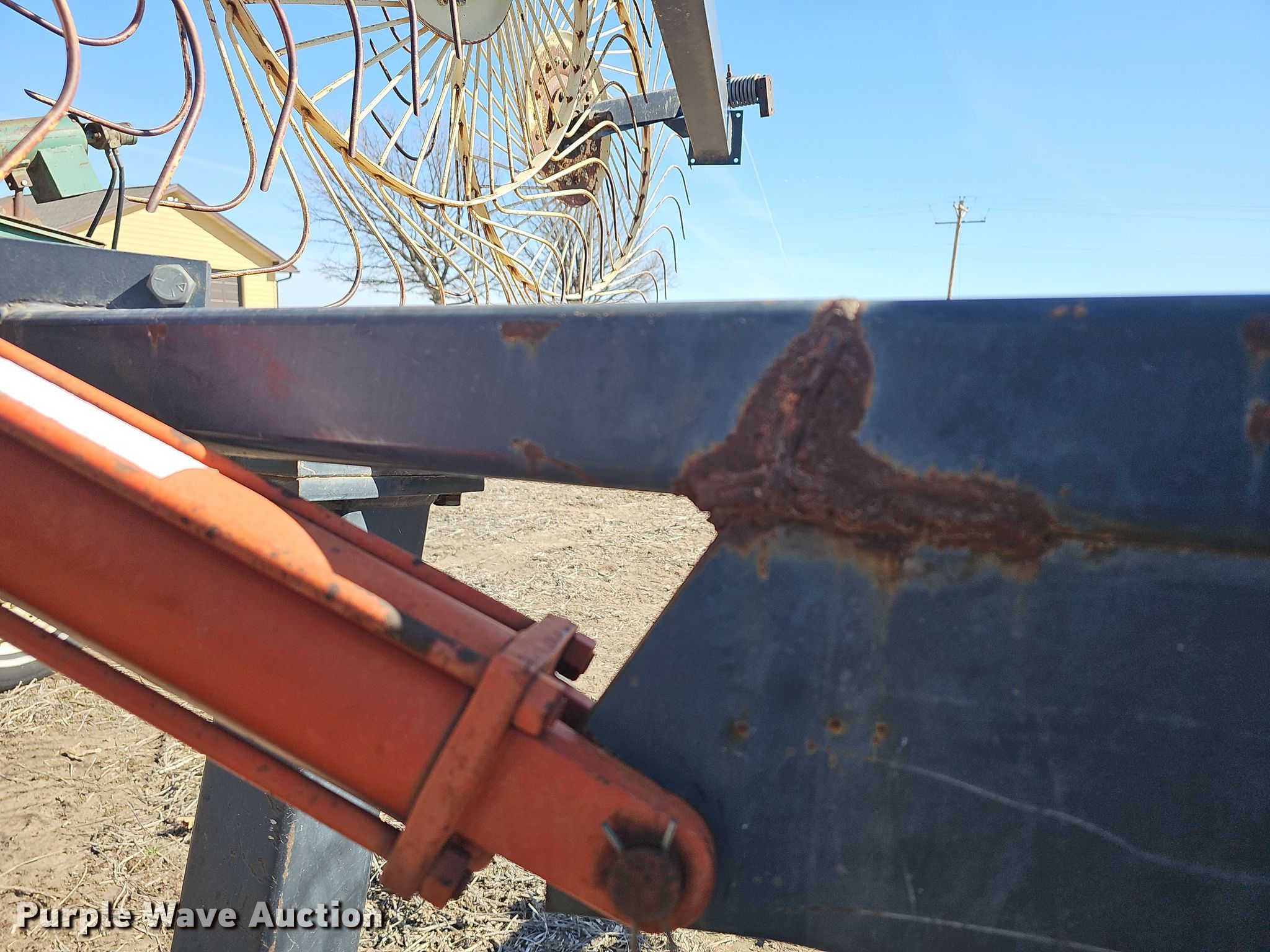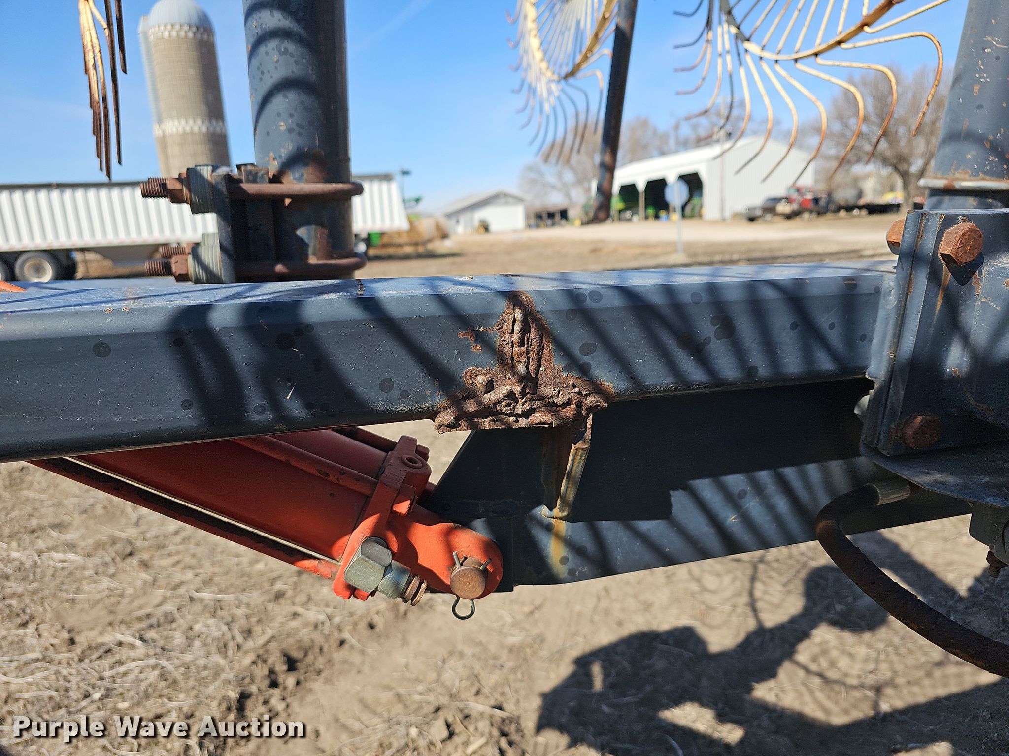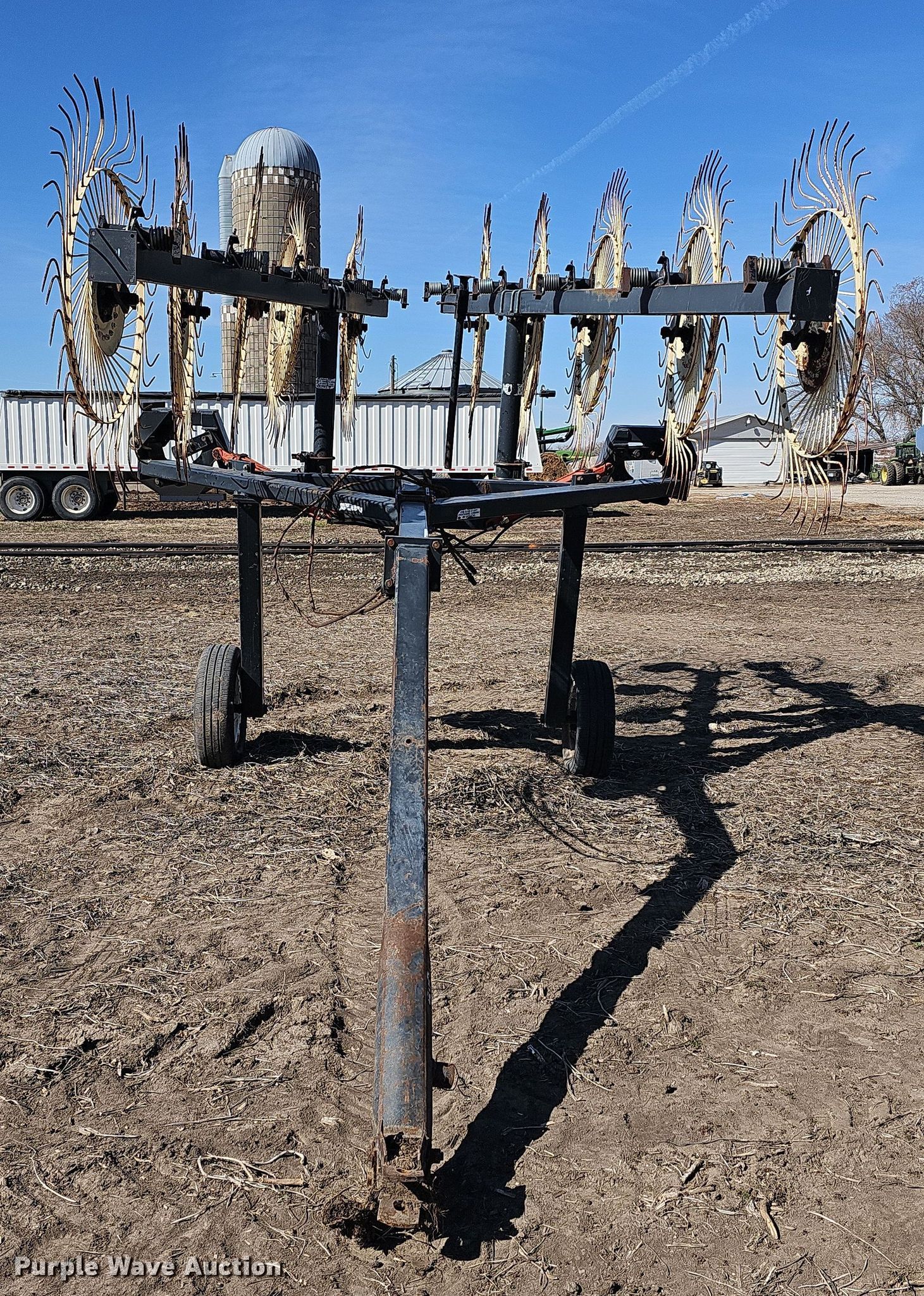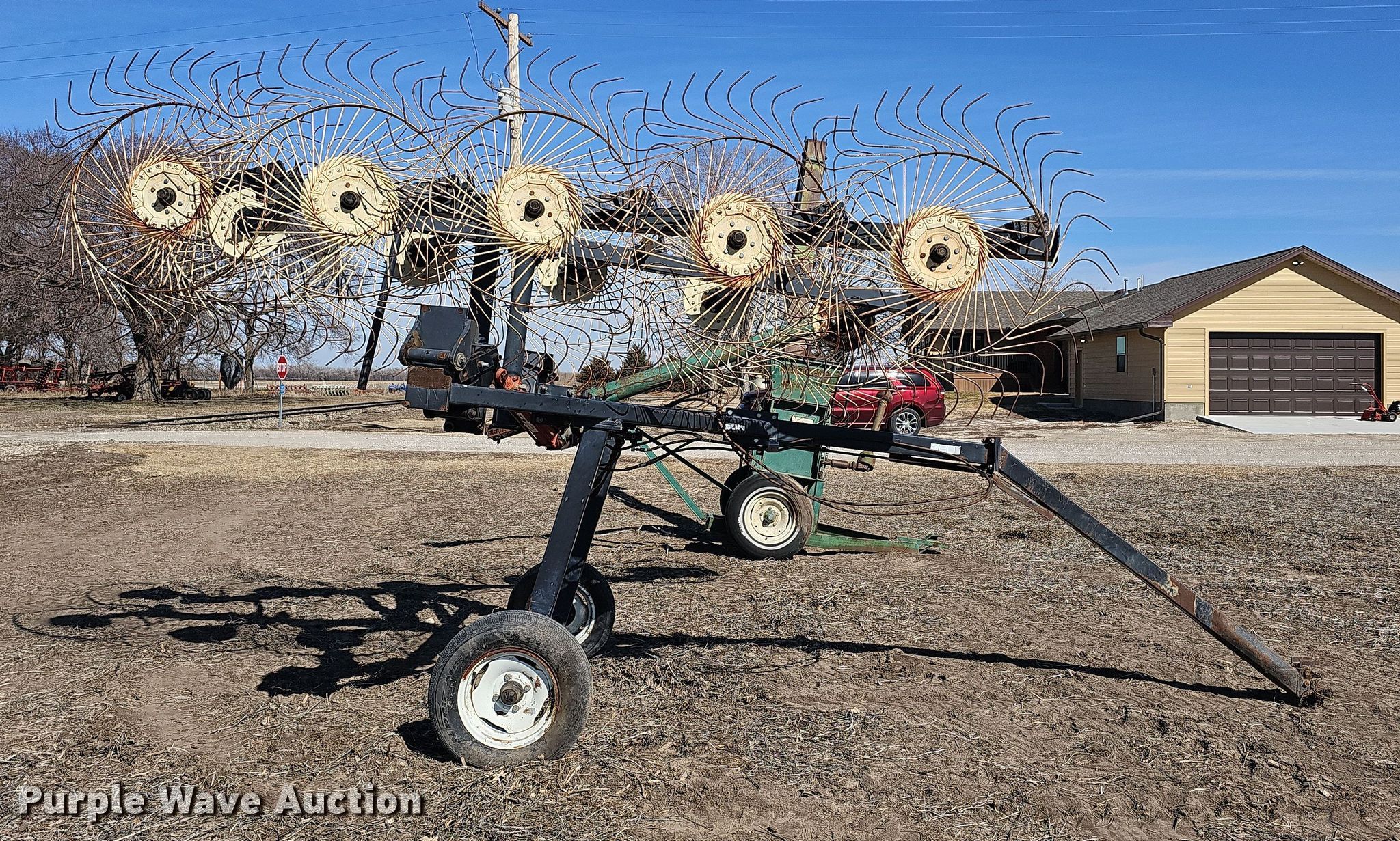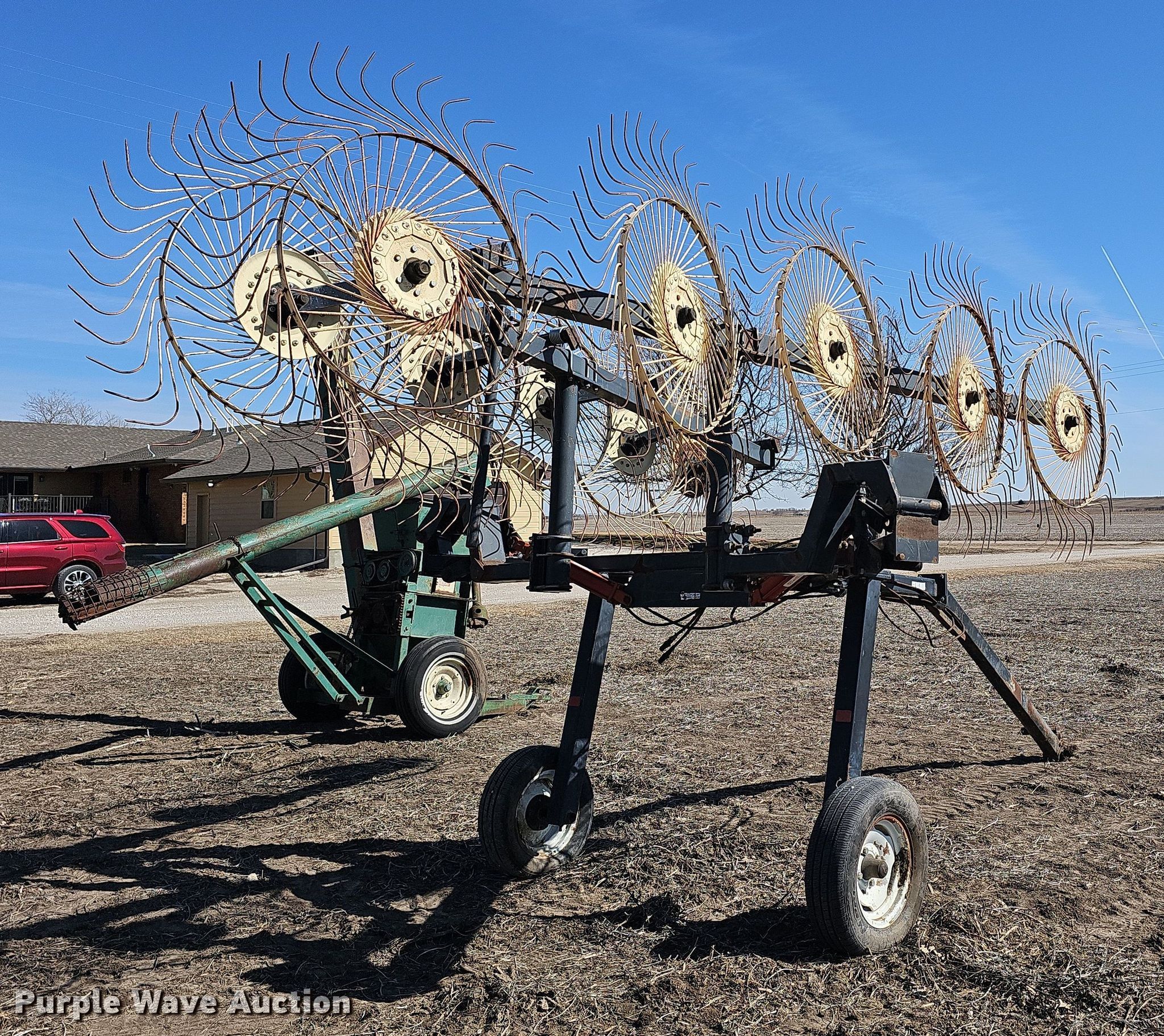 Purple Wave is selling a used Hay Rake in Kansas. This item is a OMI hay rake with the following: Width: 11', Wheels: 10, Diameter: 56", Hydraulic lift, Hydraulic fold, Hitch: Pin
