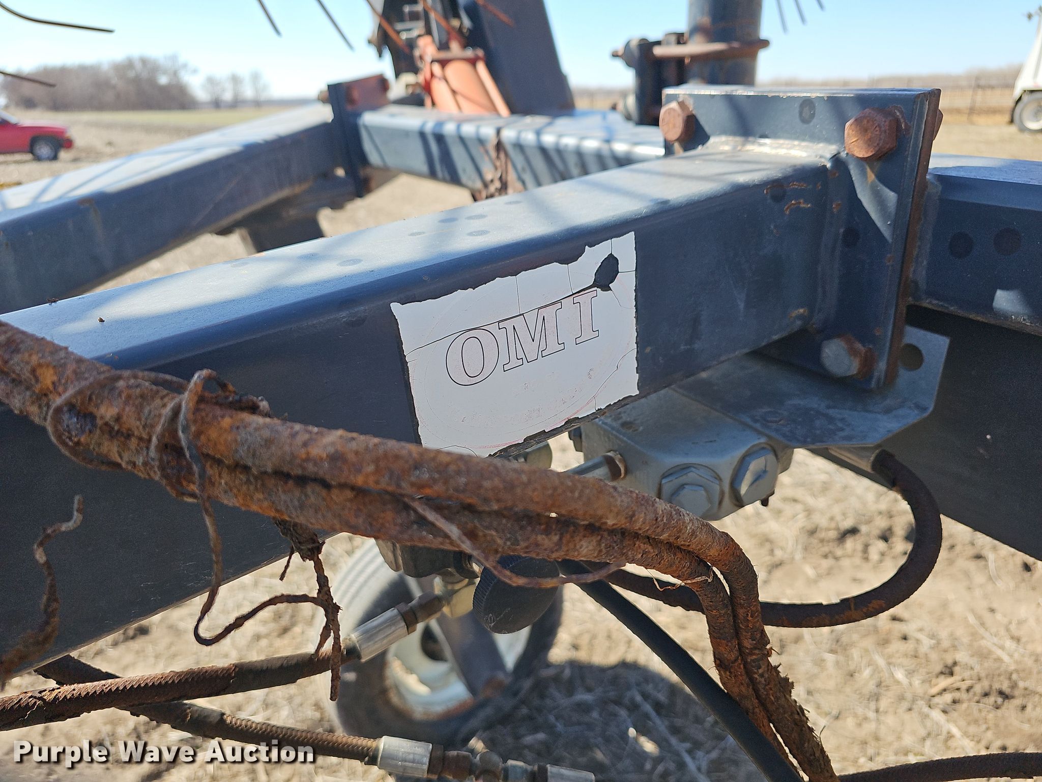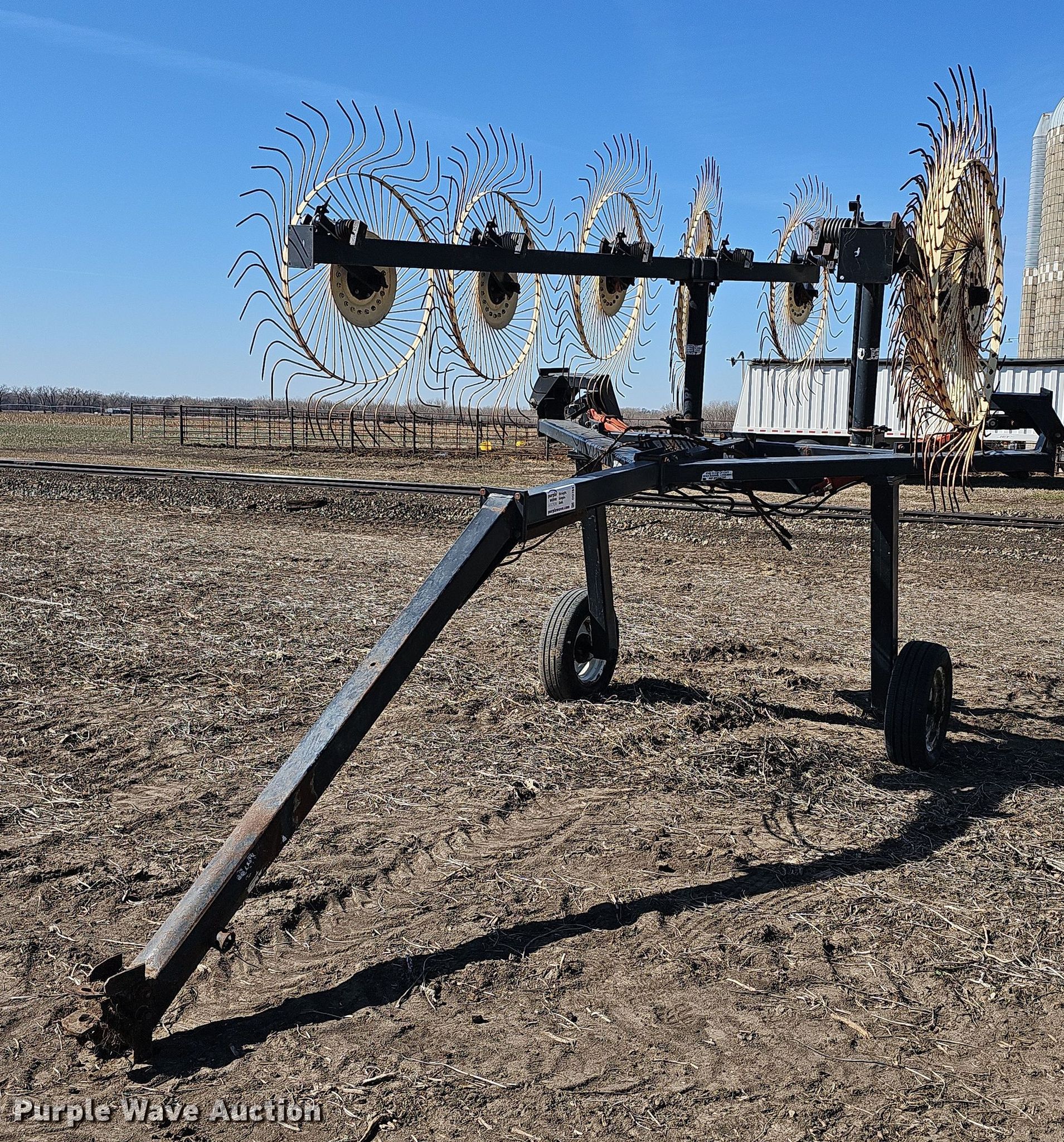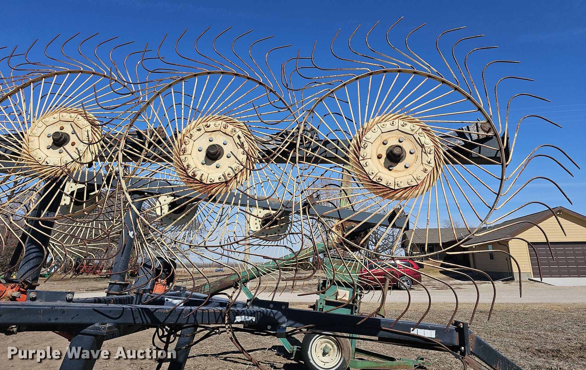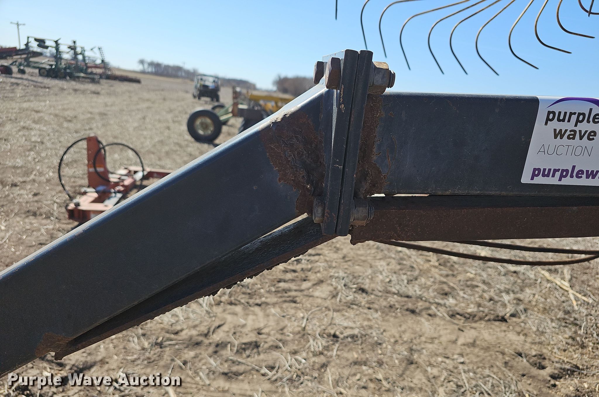 Purple Wave is selling a used Hay Rake in Kansas. This item is a OMI hay rake with the following: Width: 11', Wheels: 10, Diameter: 56", Hydraulic lift, Hydraulic fold, Hitch: Pin