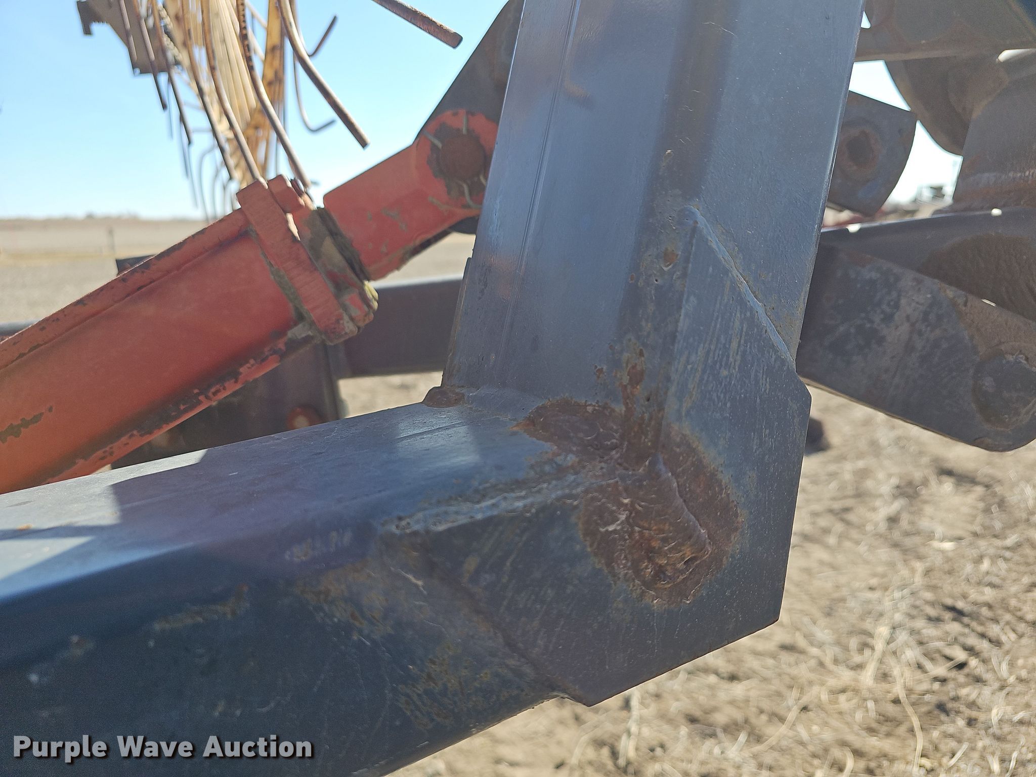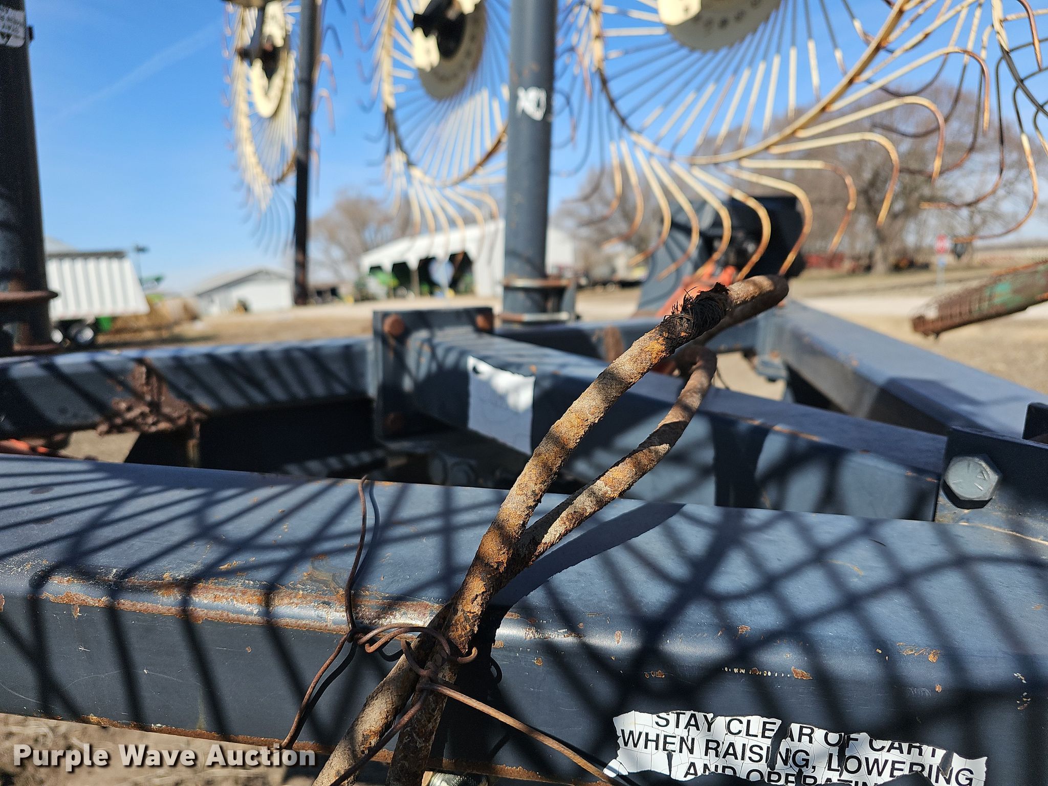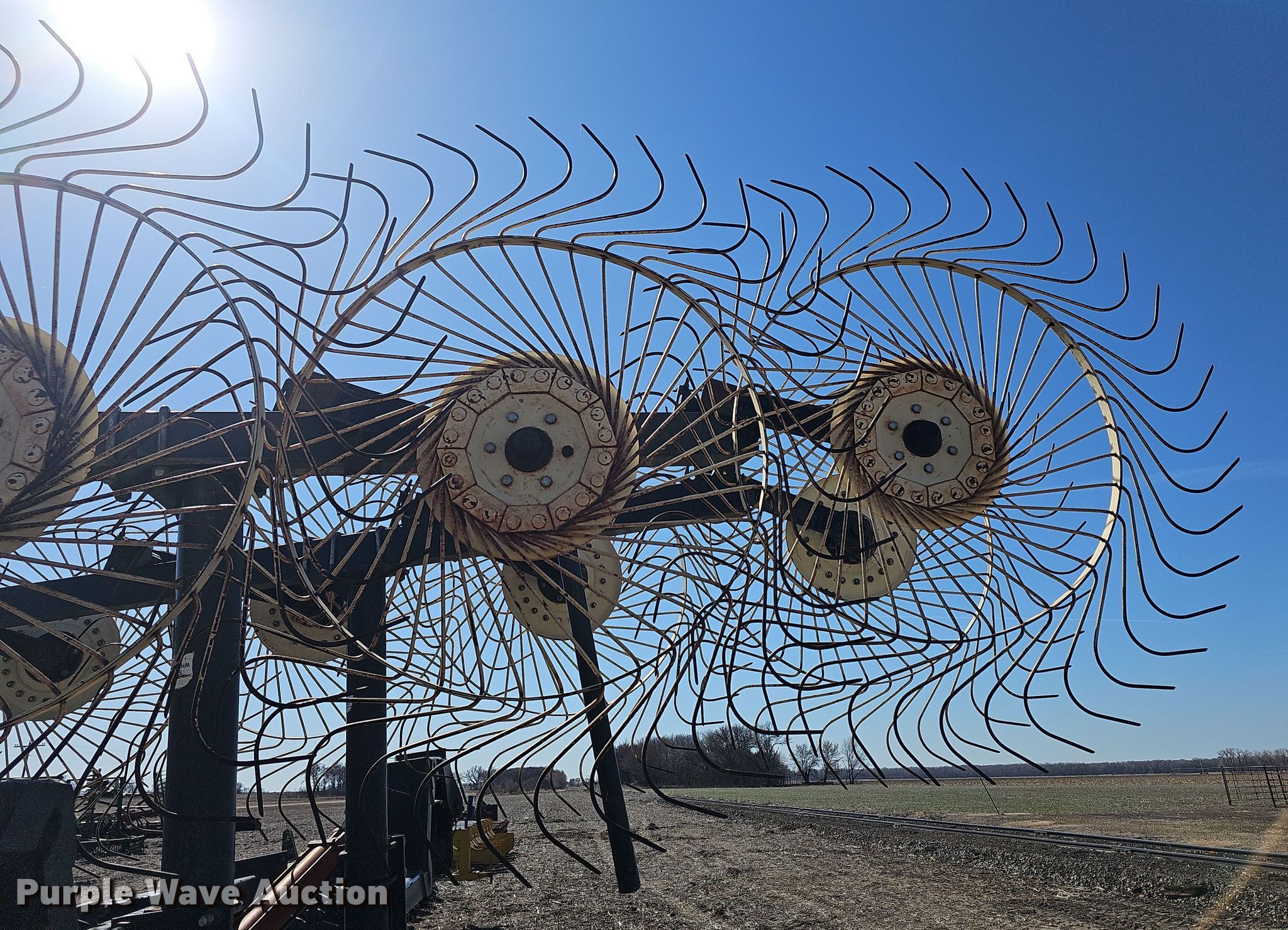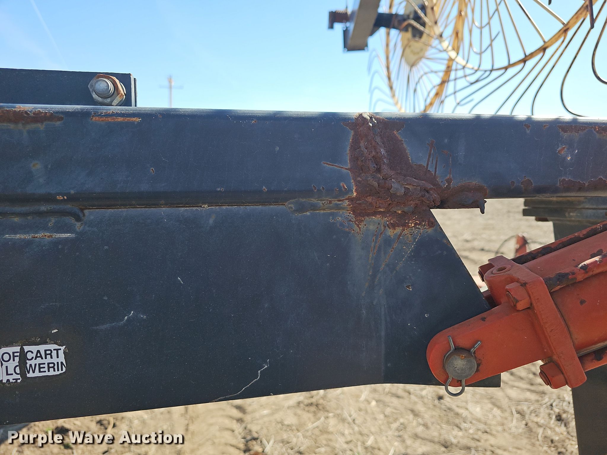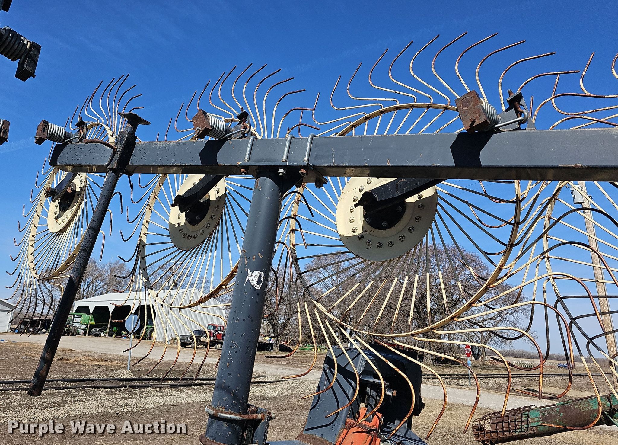 Purple Wave is selling a used Hay Rake in Kansas. This item is a OMI hay rake with the following: Width: 11', Wheels: 10, Diameter: 56", Hydraulic lift, Hydraulic fold, Hitch: Pin