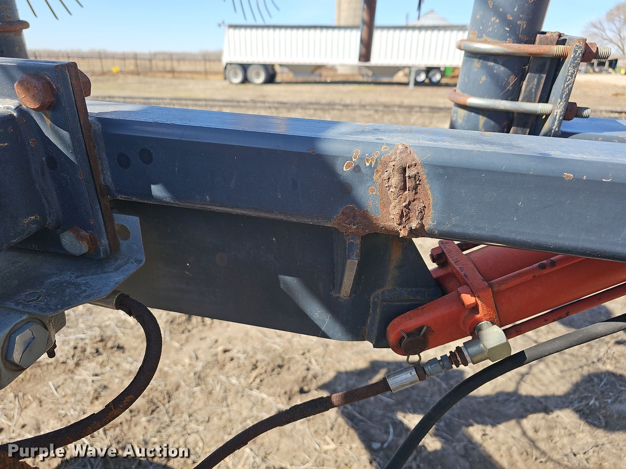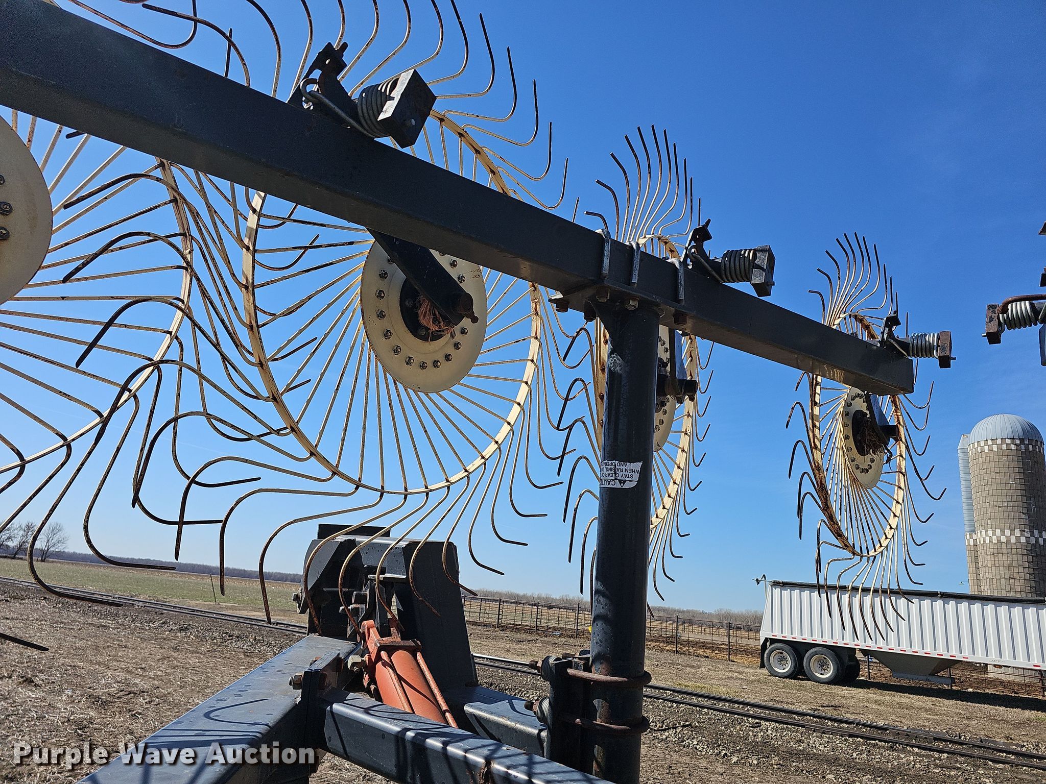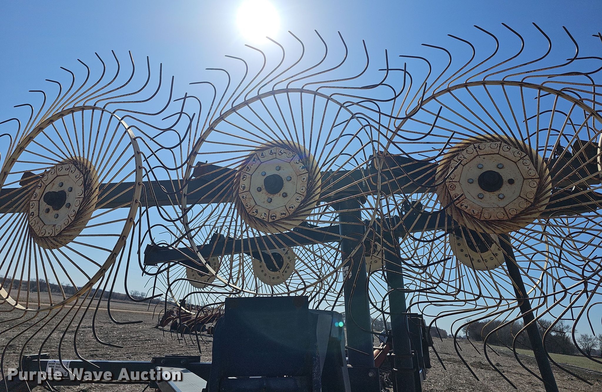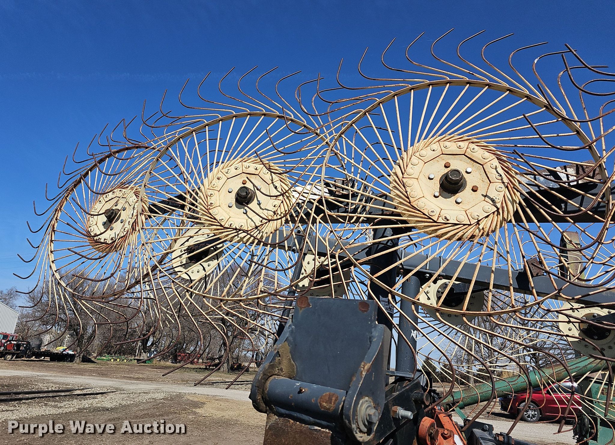 Purple Wave is selling a used Hay Rake in Kansas. This item is a OMI hay rake with the following: Width: 11', Wheels: 10, Diameter: 56", Hydraulic lift, Hydraulic fold, Hitch: Pin