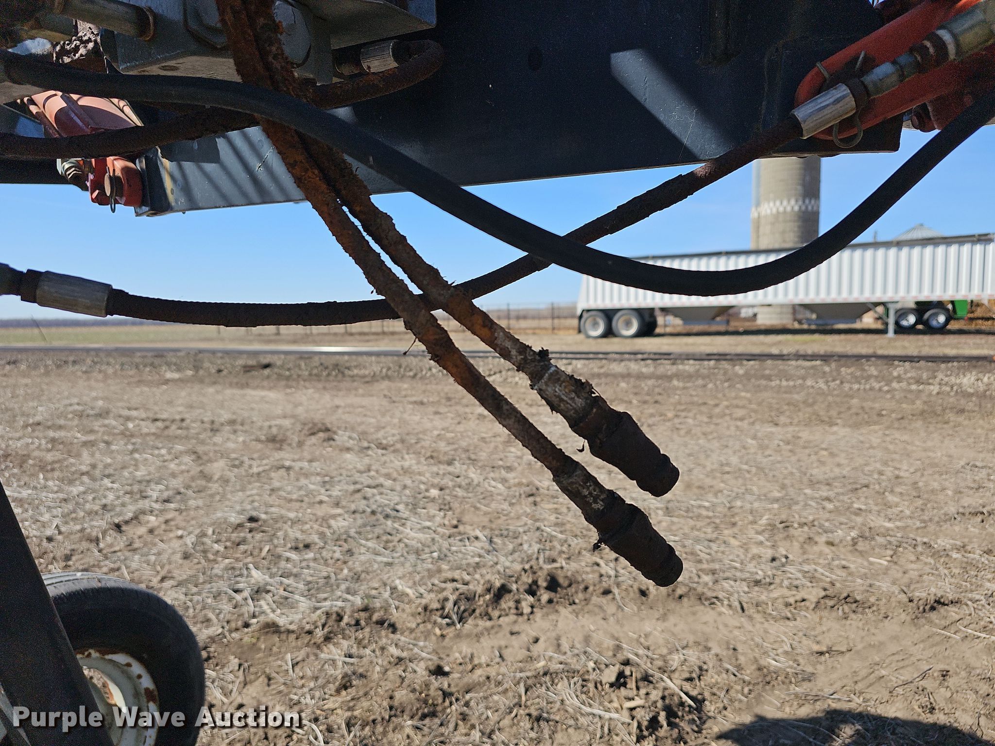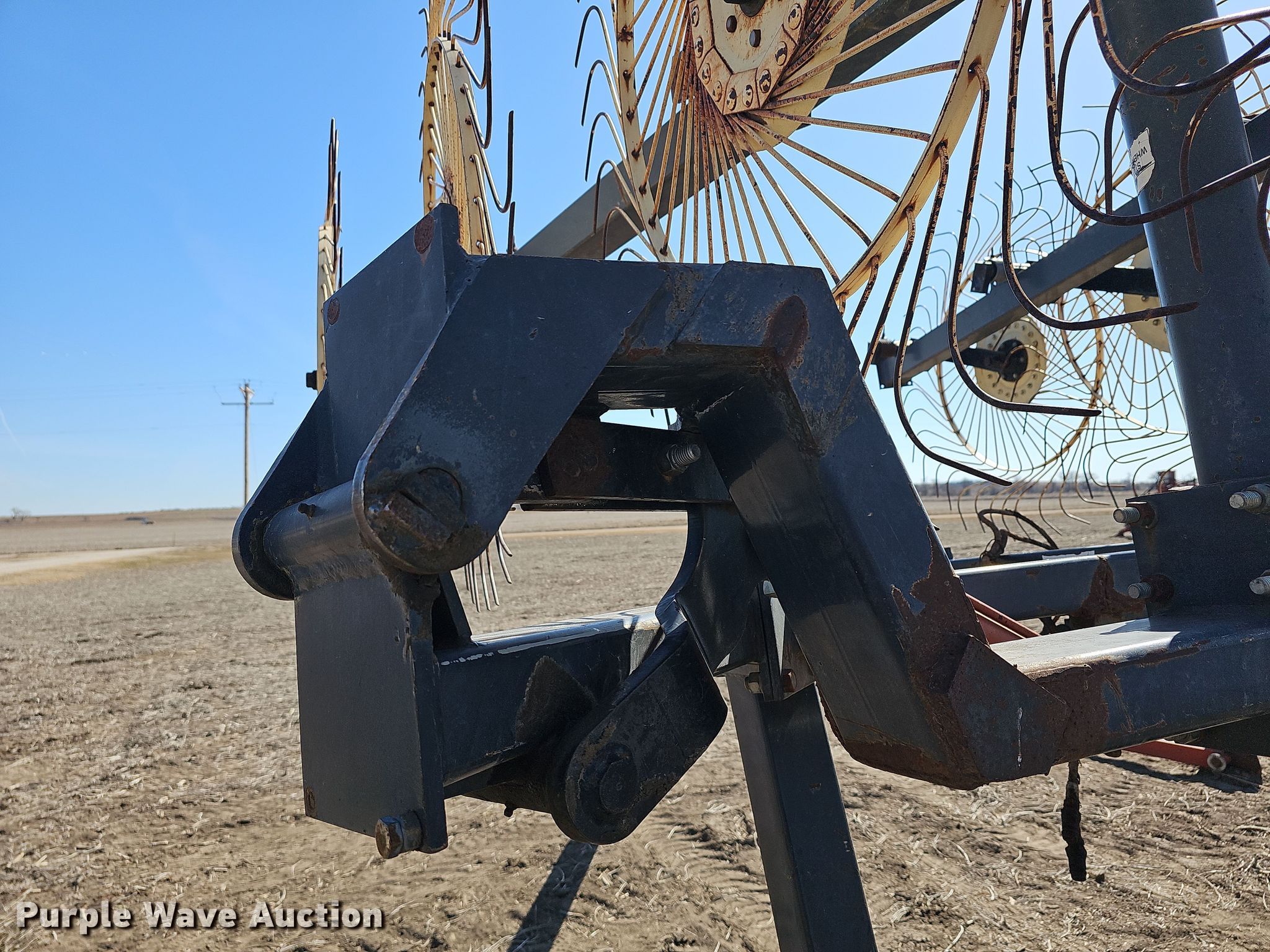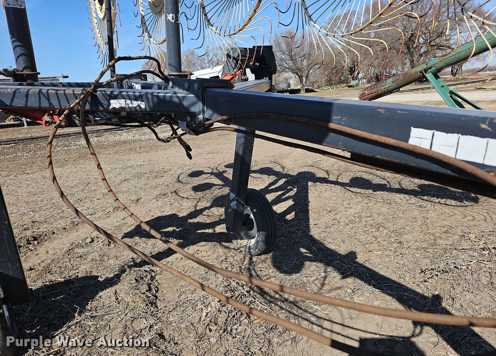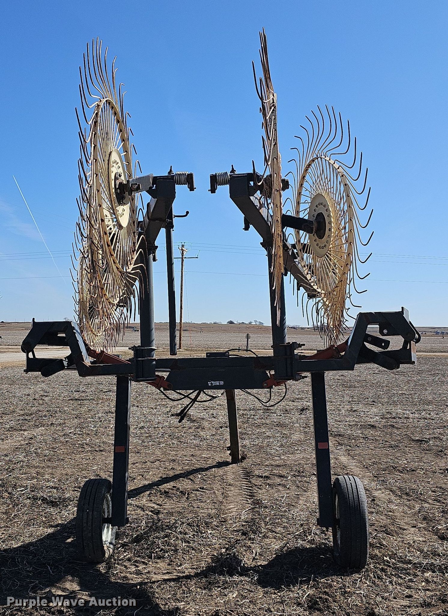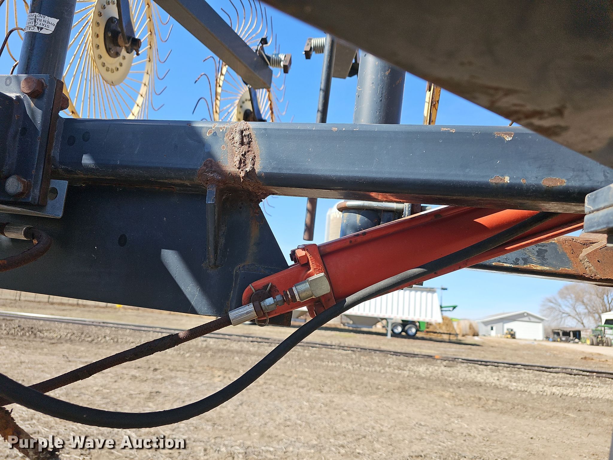 Purple Wave is selling a used Hay Rake in Kansas. This item is a OMI hay rake with the following: Width: 11', Wheels: 10, Diameter: 56", Hydraulic lift, Hydraulic fold, Hitch: Pin