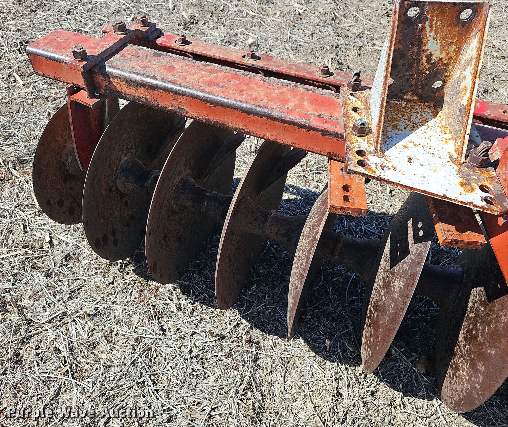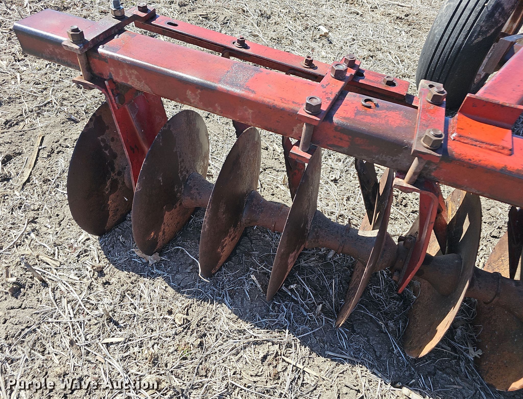 International 490 tandem disk. Overall width: 22', Serial: 10151. Features Front blades, Rear blades, Disk scrapers, Hitch: Pin, Operation Hydraulic lift, Hydraulic fold, Leveler: Manual. Tires Tire size: 9.5L-14. Notes Additional parts. L K M FARMS. Scandia, KS 66966