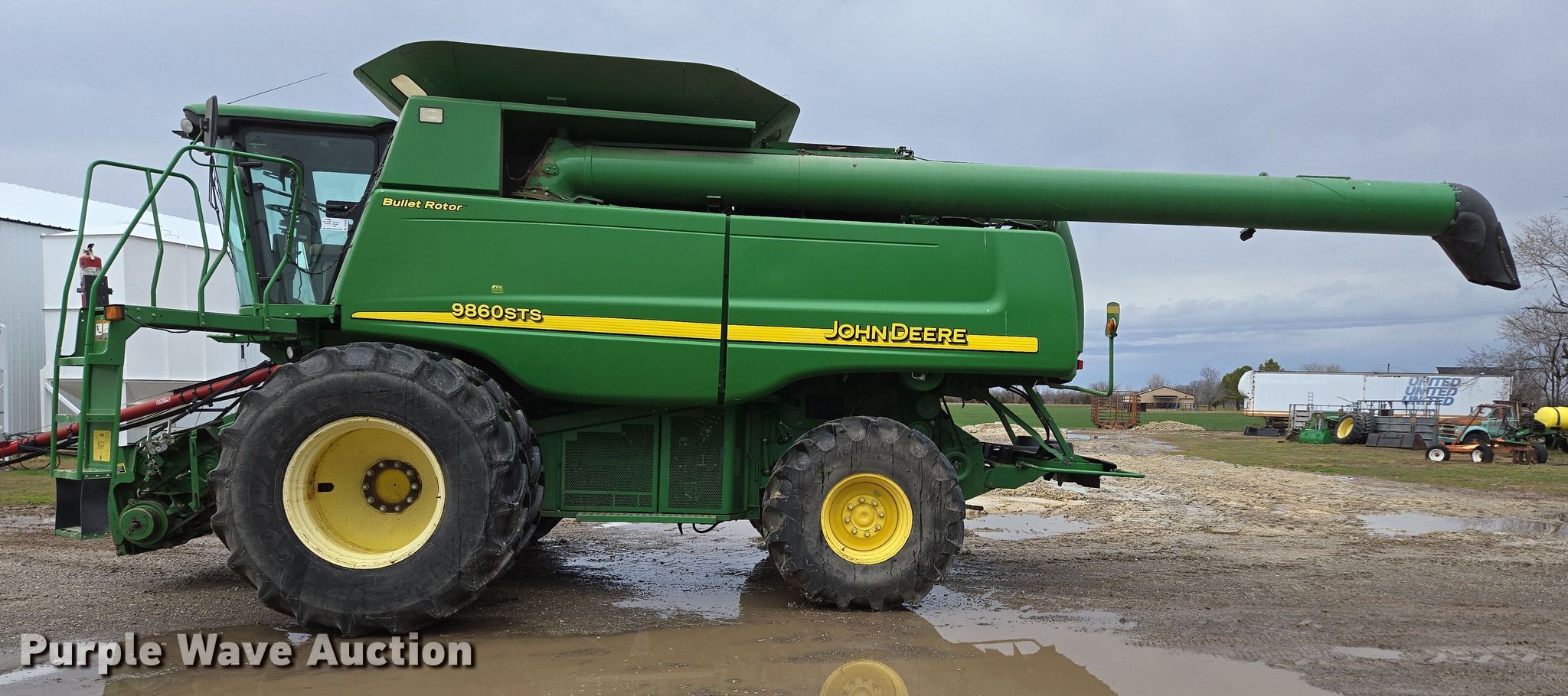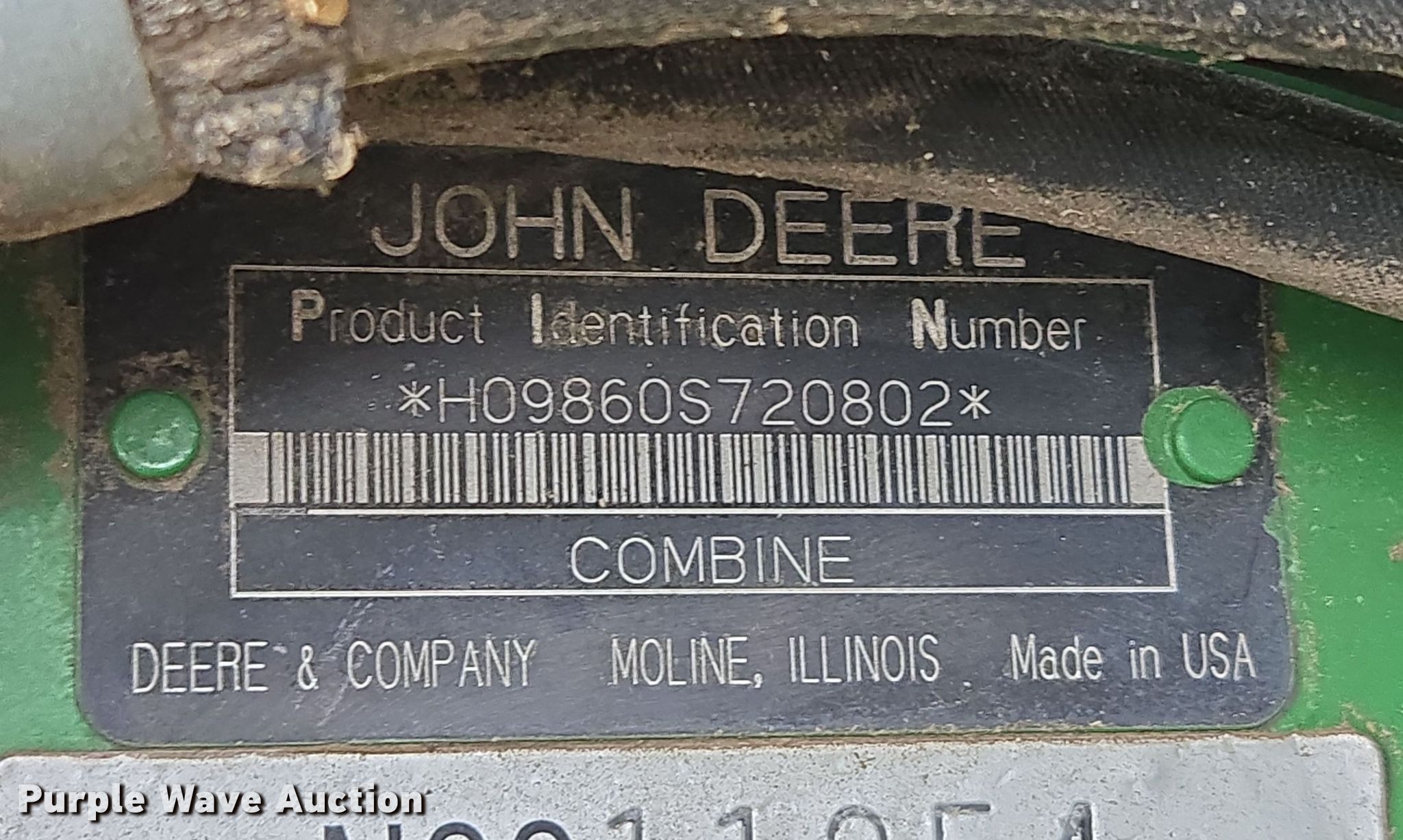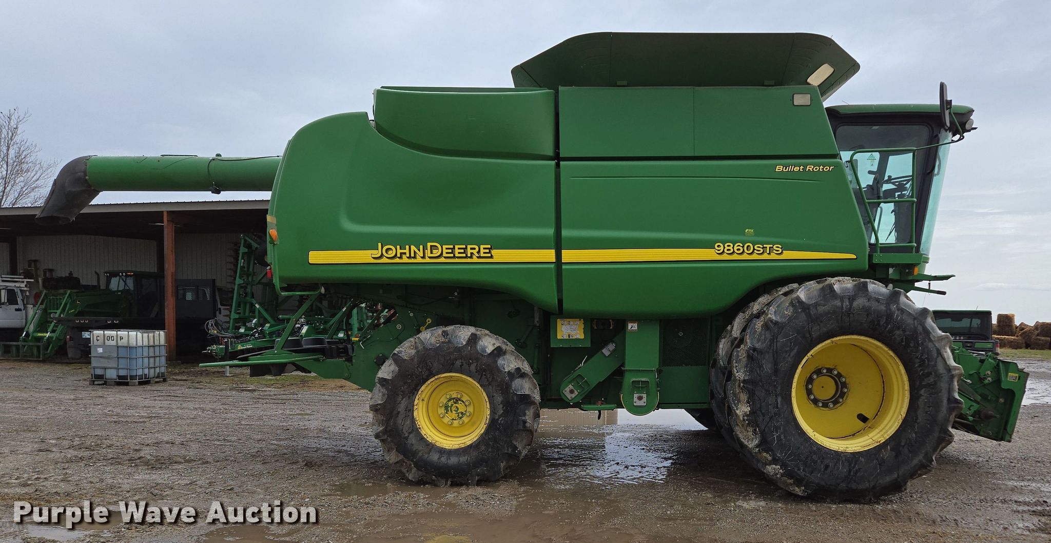 Purple Wave is selling a used Combine in Oklahoma. This item is a 2007 John Deere 9860 STS RWA combine with the following: Engine hours: 4,147 on meter, Separator hours: 2,783 on meter, Serial: H09860S720802