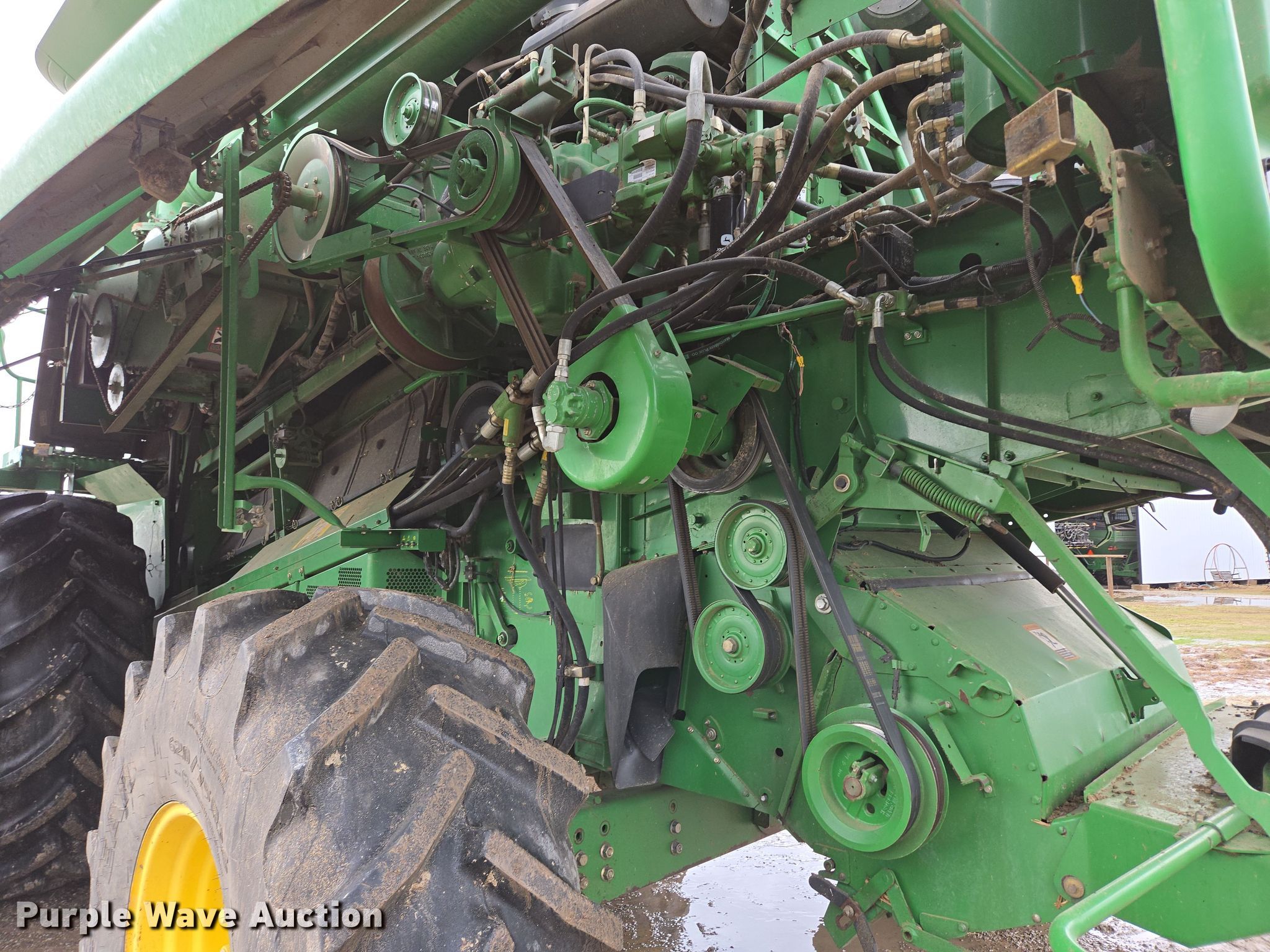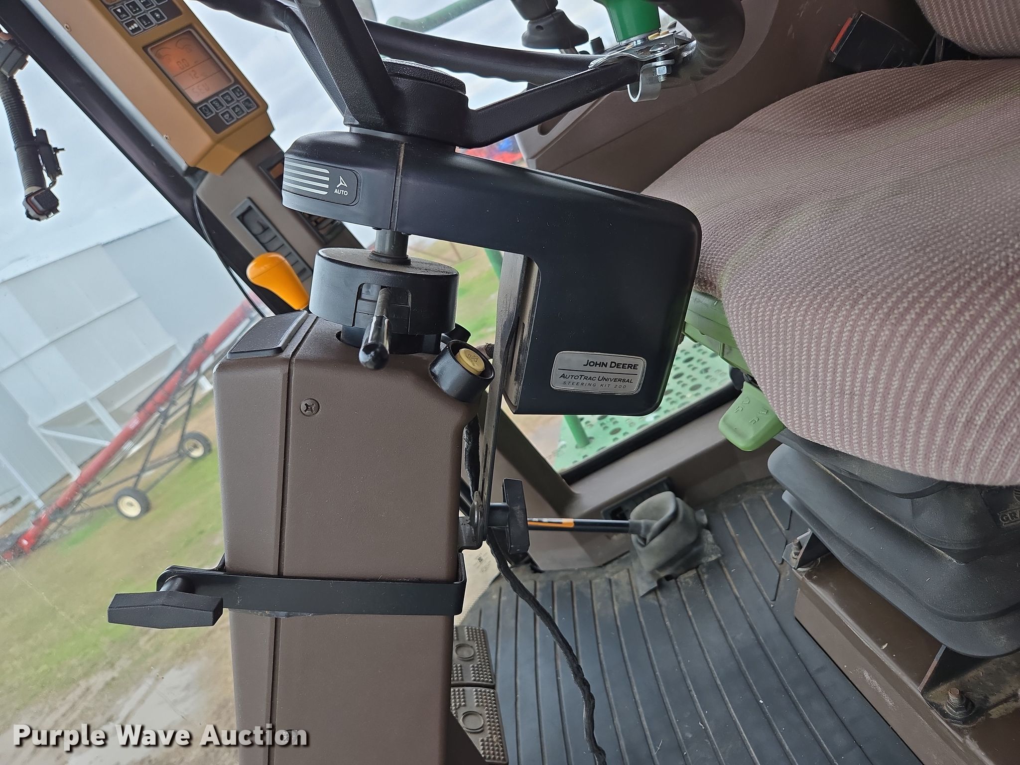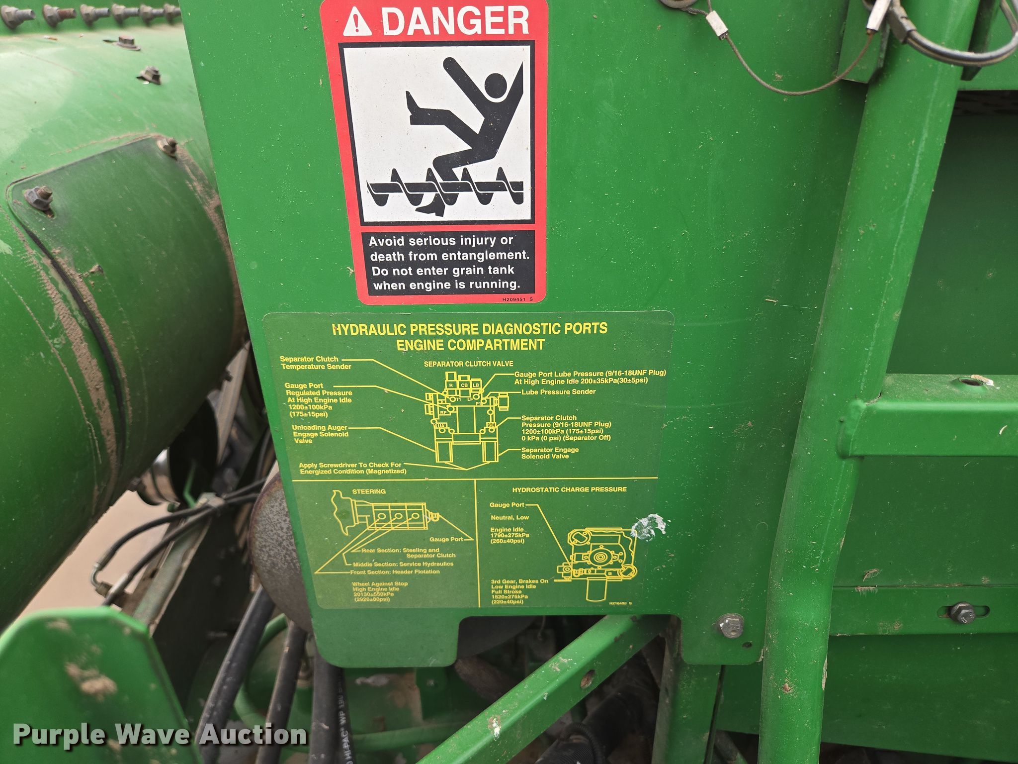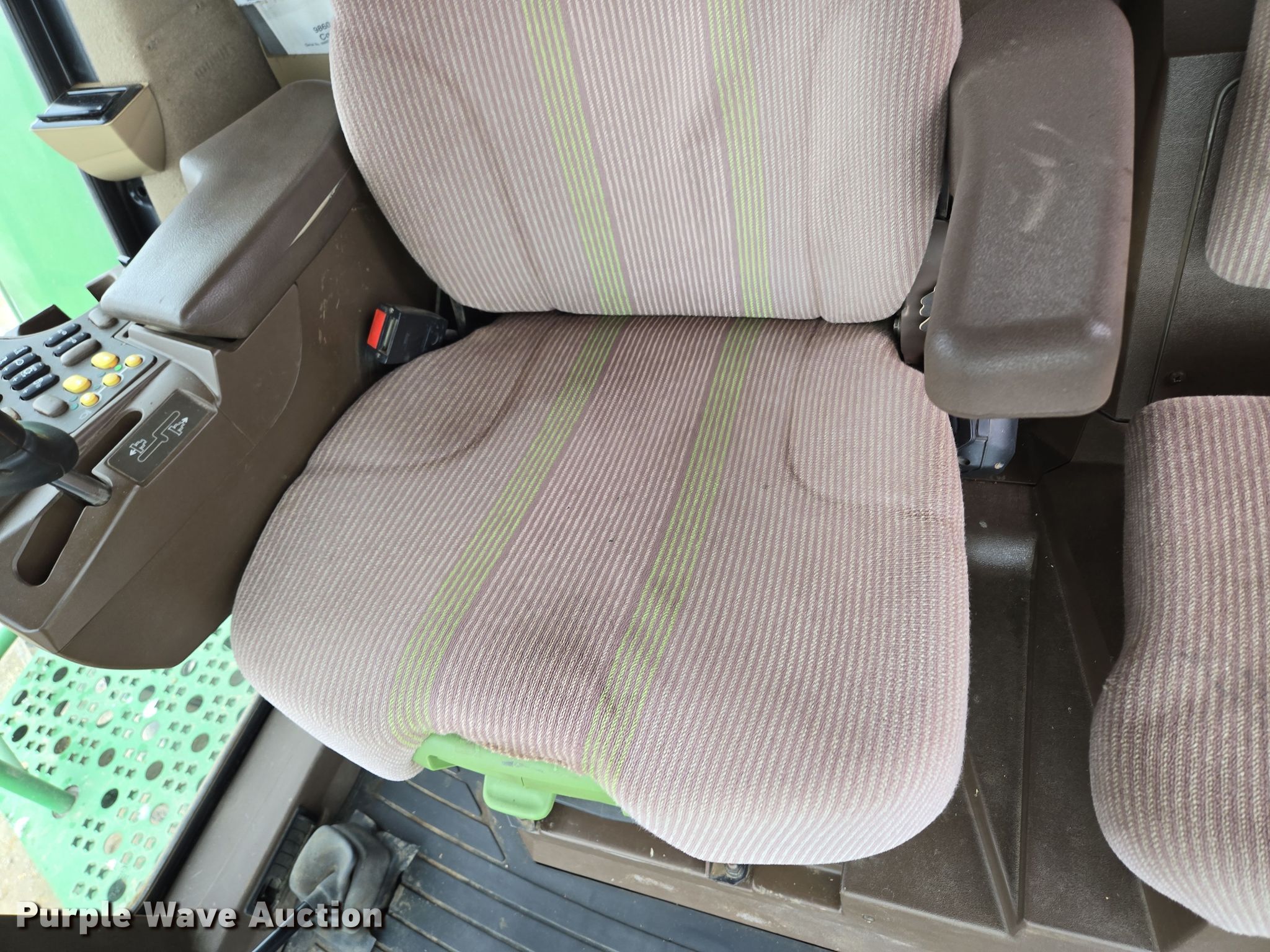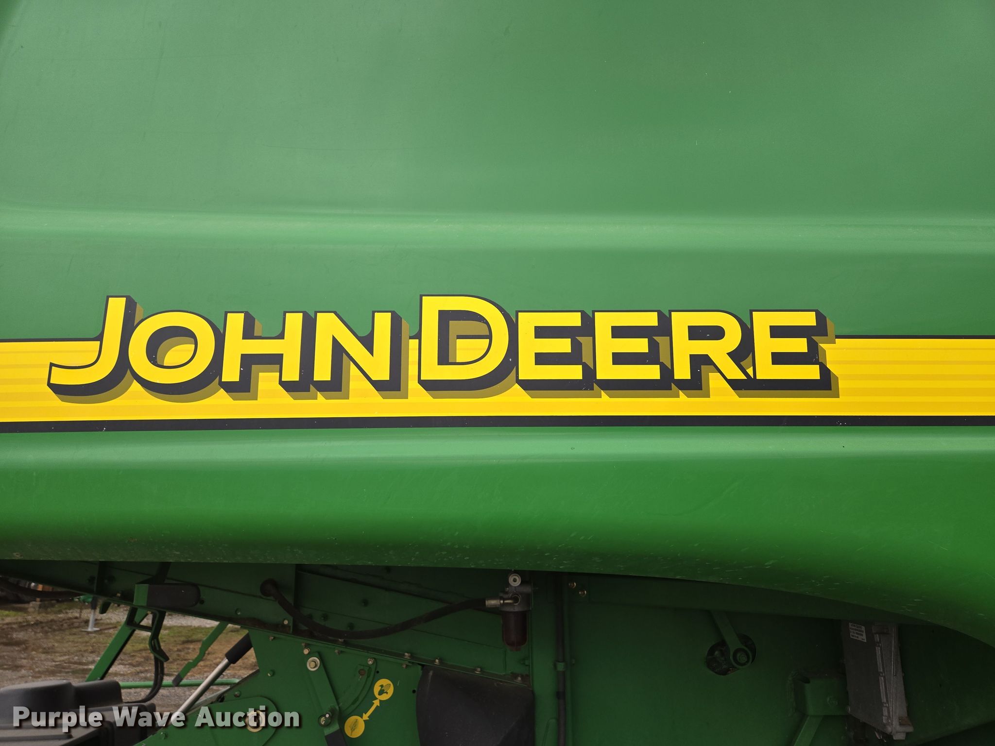 2007 John Deere 9860 STS RWA combine. Engine hours: 4,147 on meter, Separator hours: 2,783 on meter, Serial: H09860S720802. Engine John Deere 6125HH006B C, Serial: R525368, Displacement: 12.5L, Cylinders: 6, Fuel type: Diesel, HP: 375. Transmission Hydrostatic. Operators station AC, Heat, Auto steer John Deere AutoTrac Universal Steering Kit 200. Features Single point header coupler, Feederhouse: Lateral tilt, Variable speed, Reverser, Concaves: Round, Chaff spreader, Straw chopper, Power tailboard, Bin: Extensions, Unloading auger length: 24'. Tires Front: 650/85R38, Rear: 620/75R26, Duals. Notes GPS receiver missing, Grain elevator housing damaged. Jennings Farms. Quapaw, OK 74363