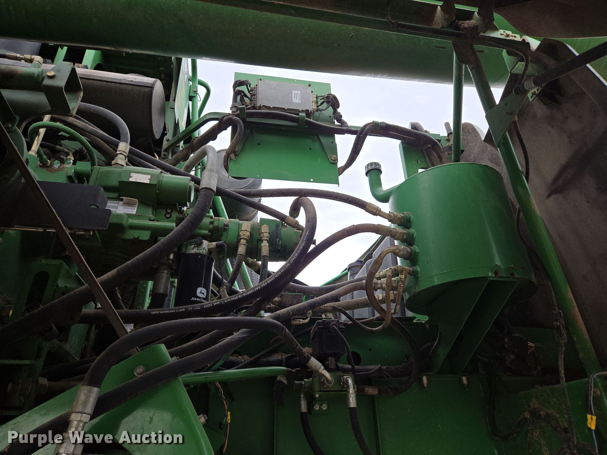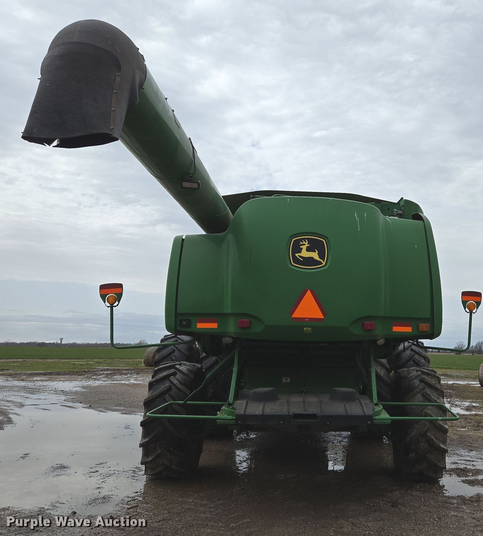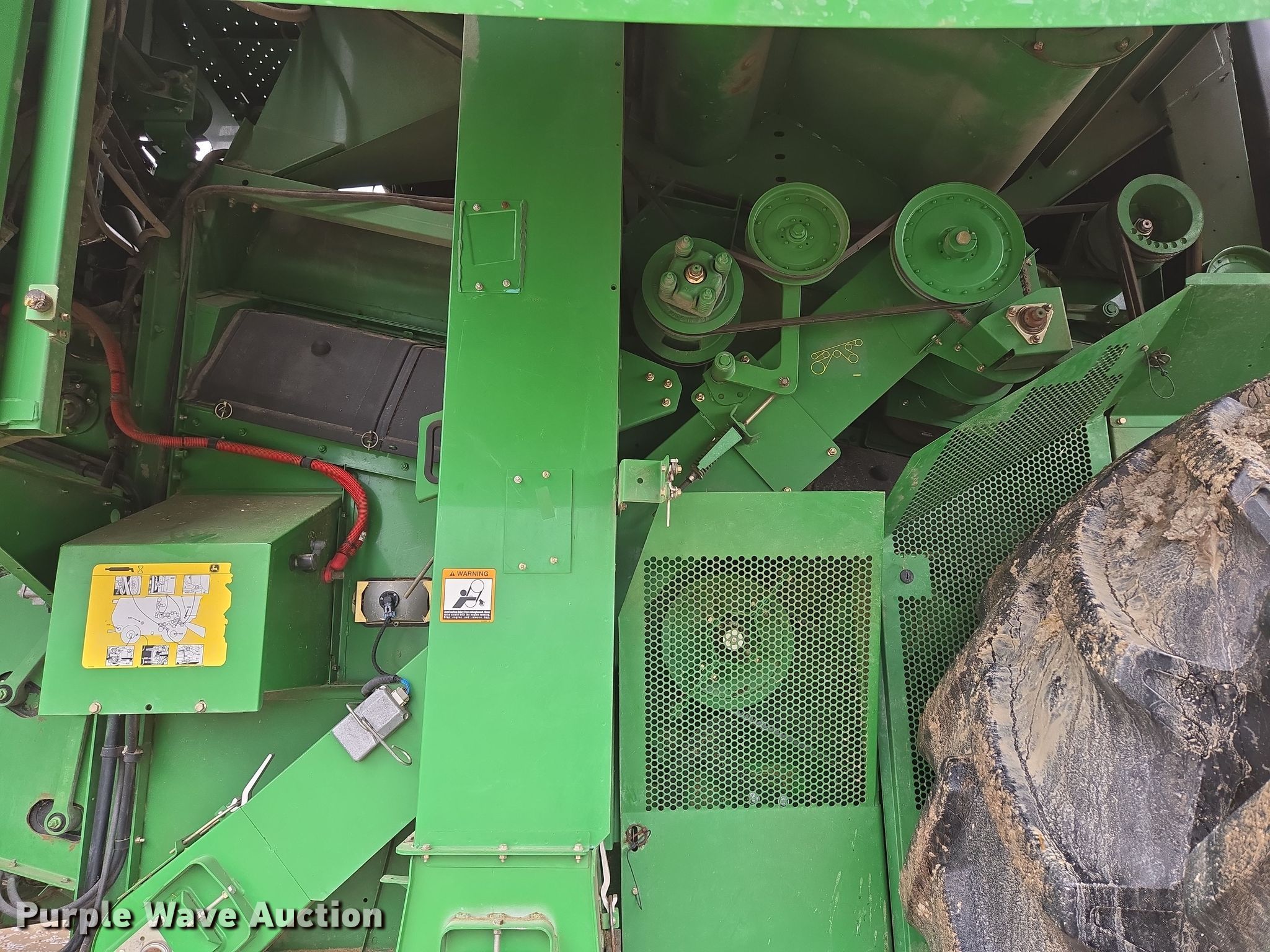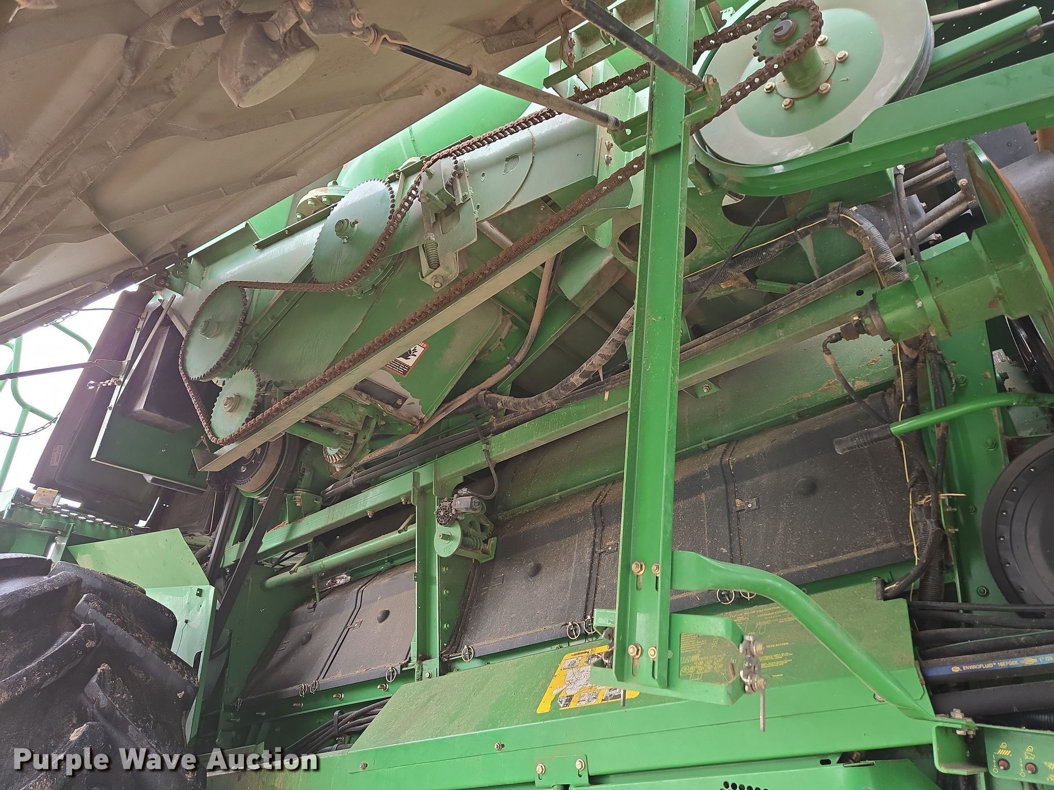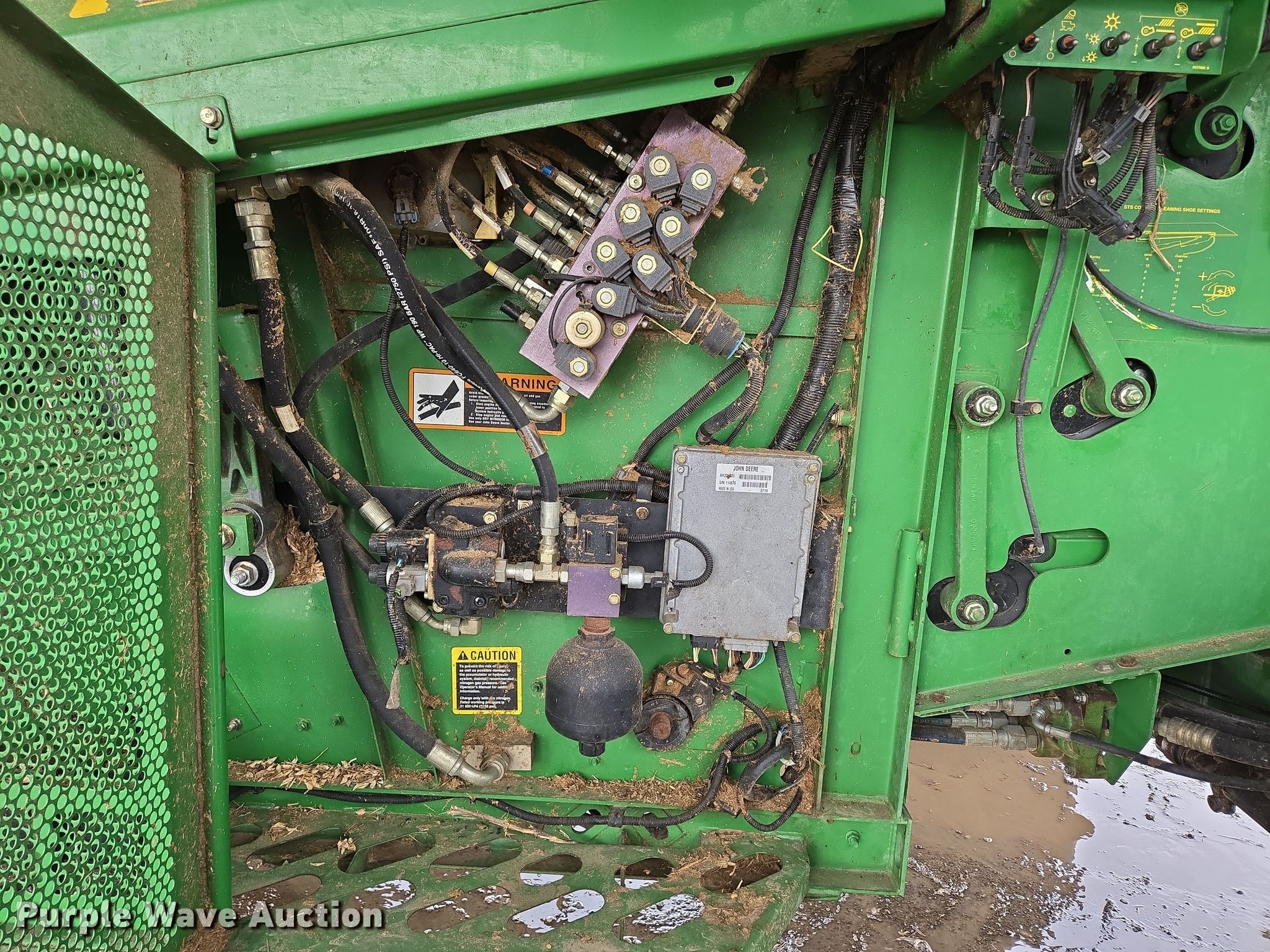 2007 John Deere 9860 STS RWA combine. Engine hours: 4,147 on meter, Separator hours: 2,783 on meter, Serial: H09860S720802. Engine John Deere 6125HH006B C, Serial: R525368, Displacement: 12.5L, Cylinders: 6, Fuel type: Diesel, HP: 375. Transmission Hydrostatic. Operators station AC, Heat, Auto steer John Deere AutoTrac Universal Steering Kit 200. Features Single point header coupler, Feederhouse: Lateral tilt, Variable speed, Reverser, Concaves: Round, Chaff spreader, Straw chopper, Power tailboard, Bin: Extensions, Unloading auger length: 24'. Tires Front: 650/85R38, Rear: 620/75R26, Duals. Notes GPS receiver missing, Grain elevator housing damaged. Jennings Farms. Quapaw, OK 74363