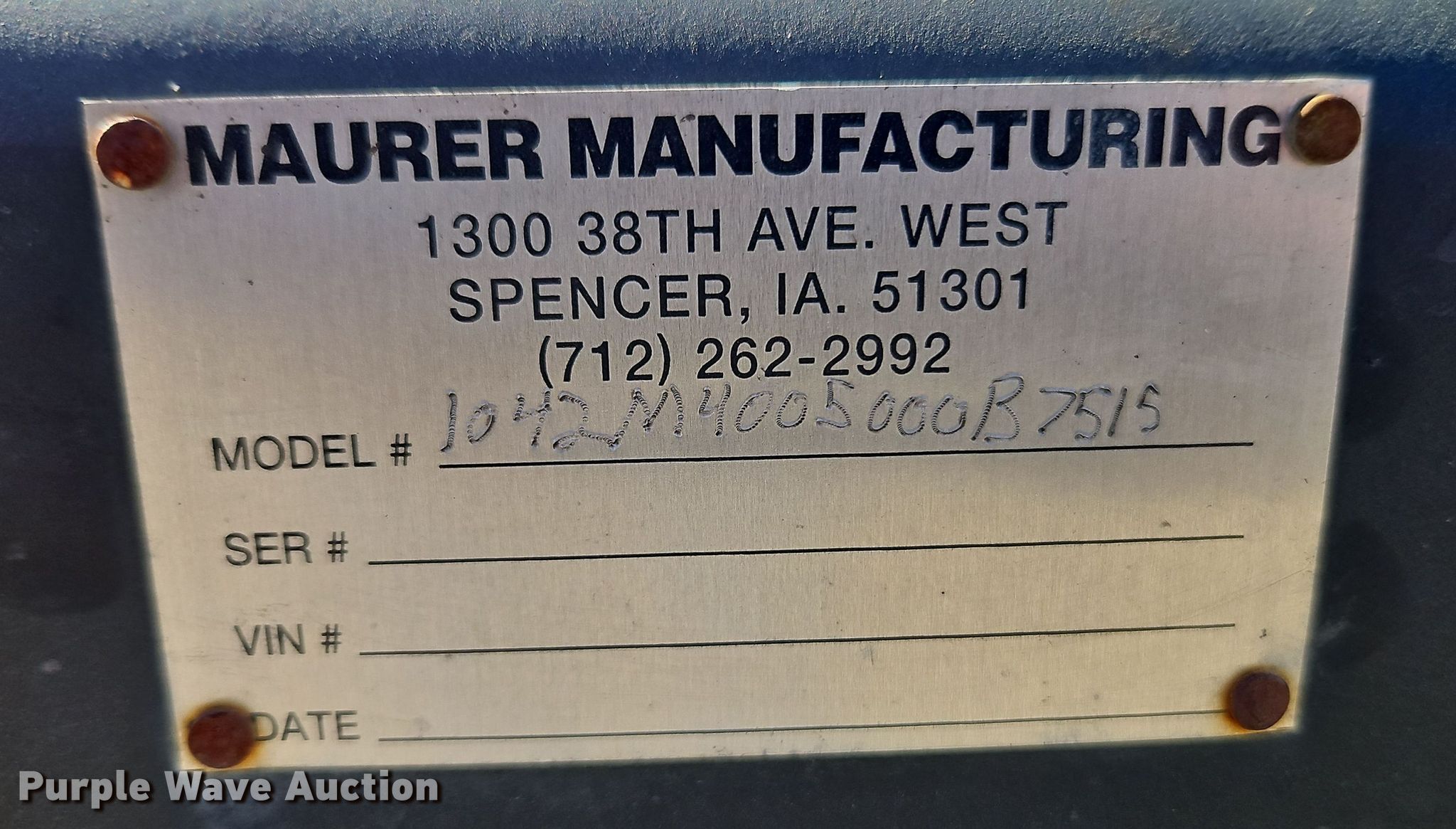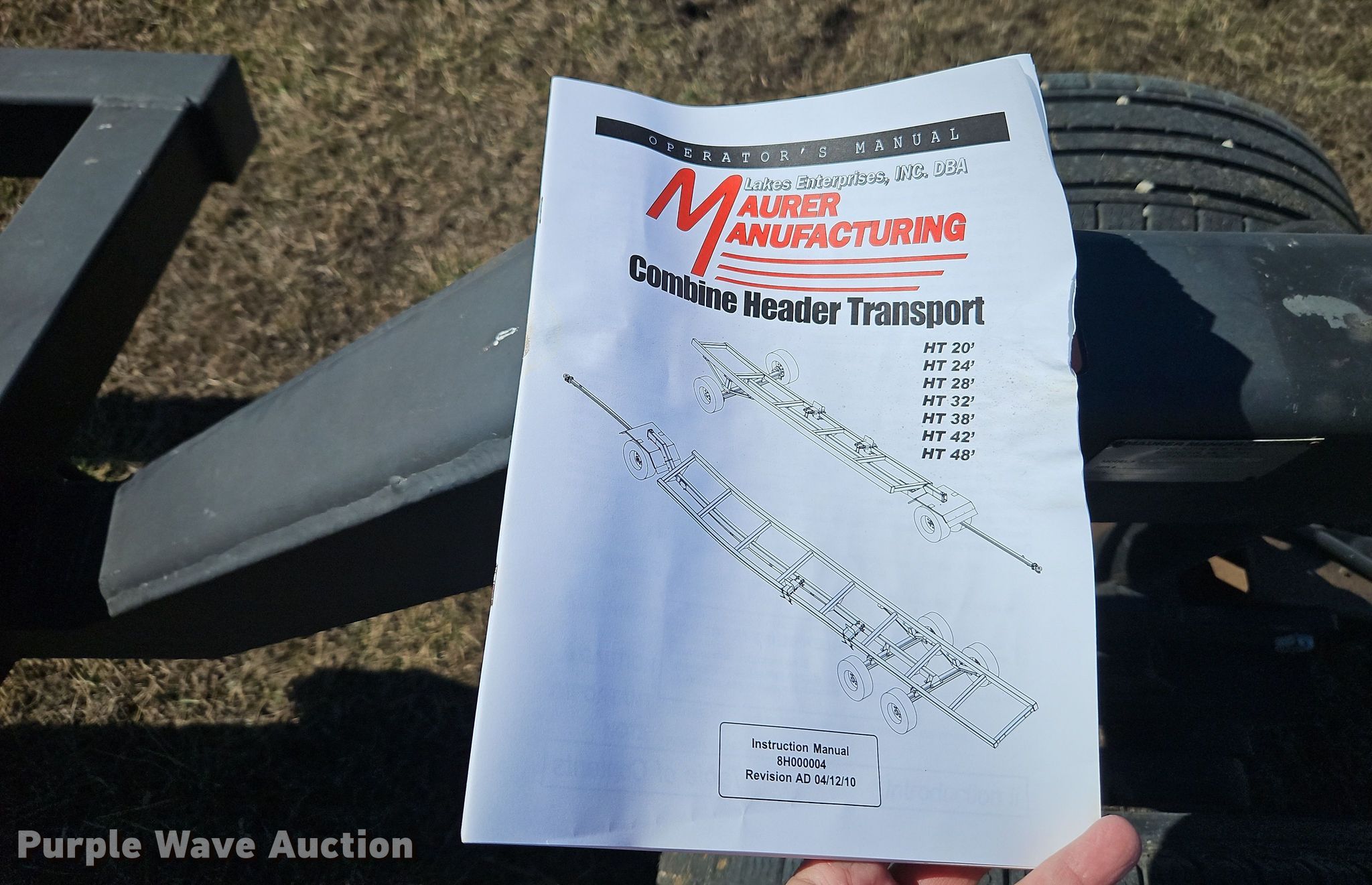 Maurer Manufacturing HT 42 header trailer. Dimensions. Overall: 50' L x 101" W, Deck: 42'. Chassis Suspension: Spring, Brakes: Electric, Axles: Tandem. Tires Steel wheels, Size: 225/75R15. Transfer of ownership documentation will be a bill of sale. Fulton, KS 66738
