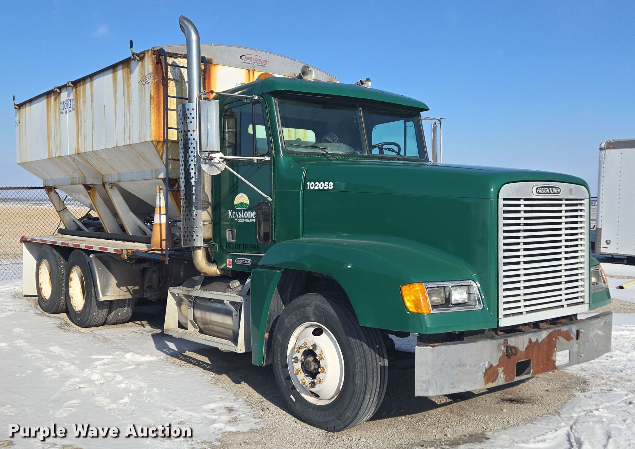 2000 Freightliner FLD120 fertilizer delivery truck. Miles: 699,592 on odometer, VIN: 1FUYDMDB9YLA83105. Engine Cummins ISM, Displacement: 10.8L, Cylinders: 6, Fuel type: Diesel, HP: 330. Transmission Meritor Rockwell, Manual, Speed: 10. Chassis Axles: Tandem, Suspension: Air, Brakes: Air, PTO, GVWR: 52,000 lbs. Interior AC, Heat. Features Delivery bed Doyle, 16' L, Discharge auger Diameter: 8", Length: 19', Rear, Tarp, Ground controls. Tires Front: 295/75R22.5. Notes Unknown operating condition , Rust damage , Dead battery. Indiana title. Keystone Cooperative. Francesville, IN 47946