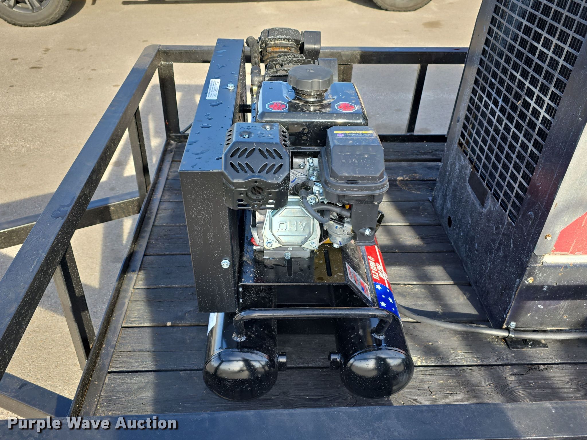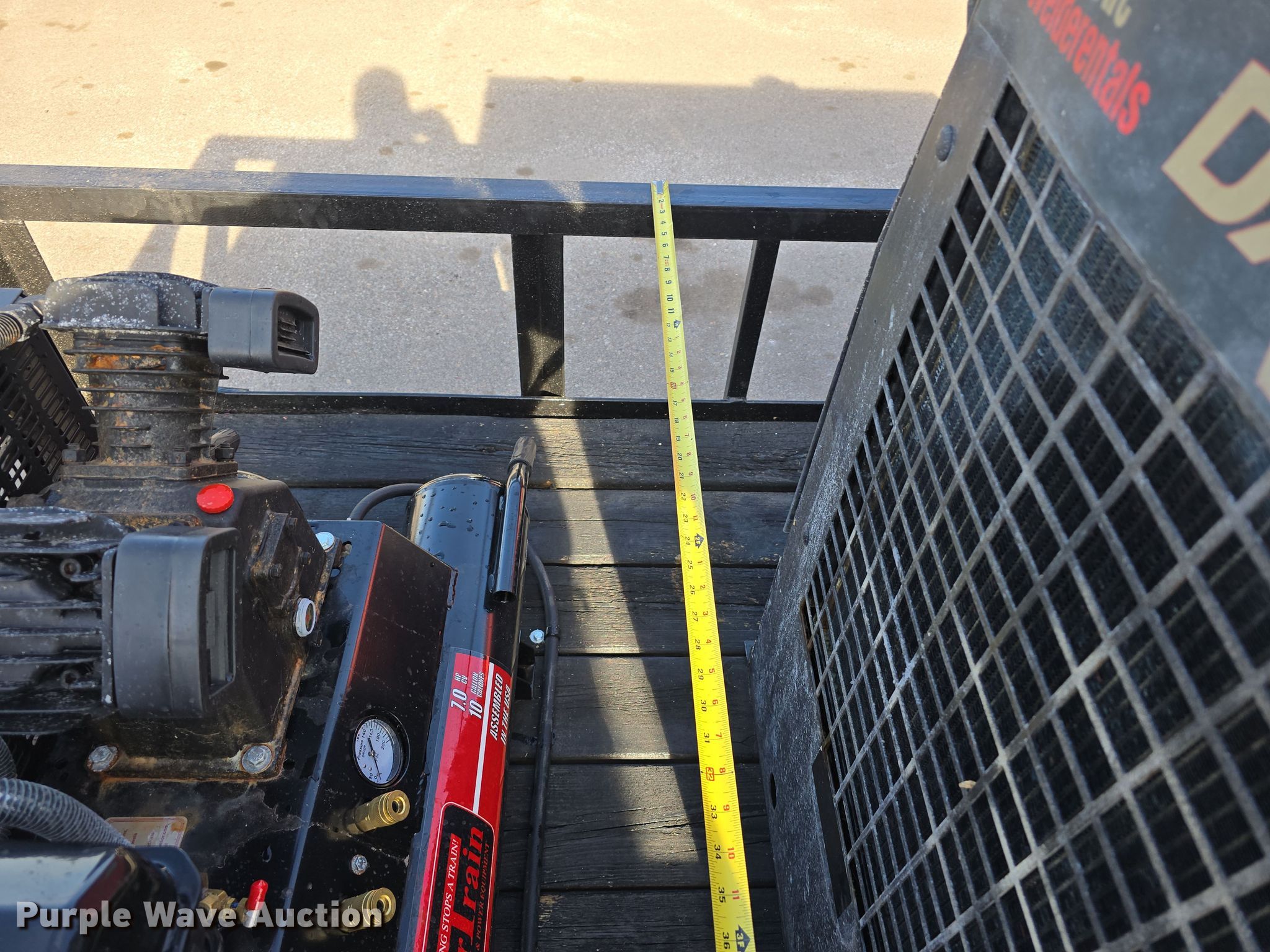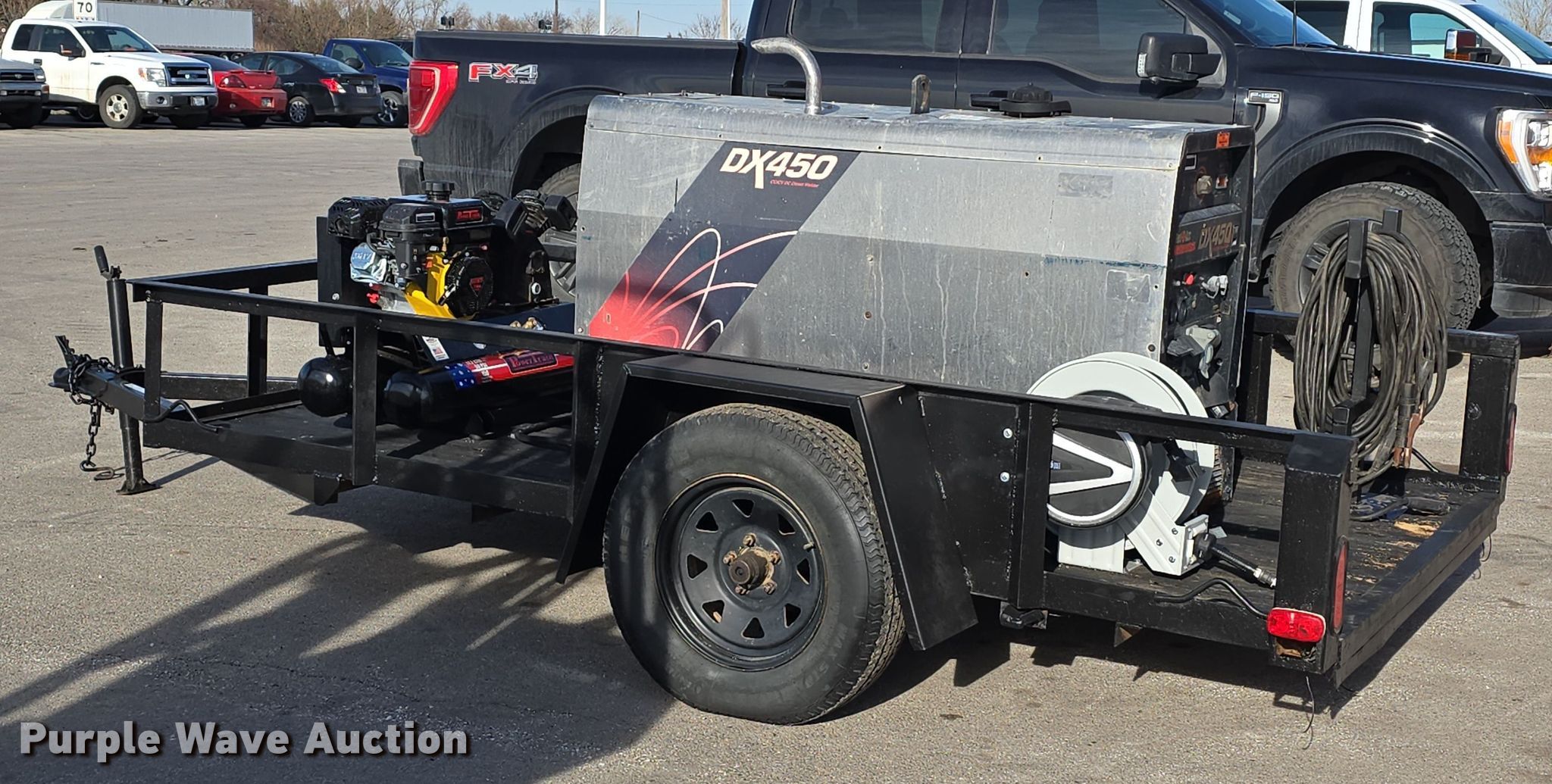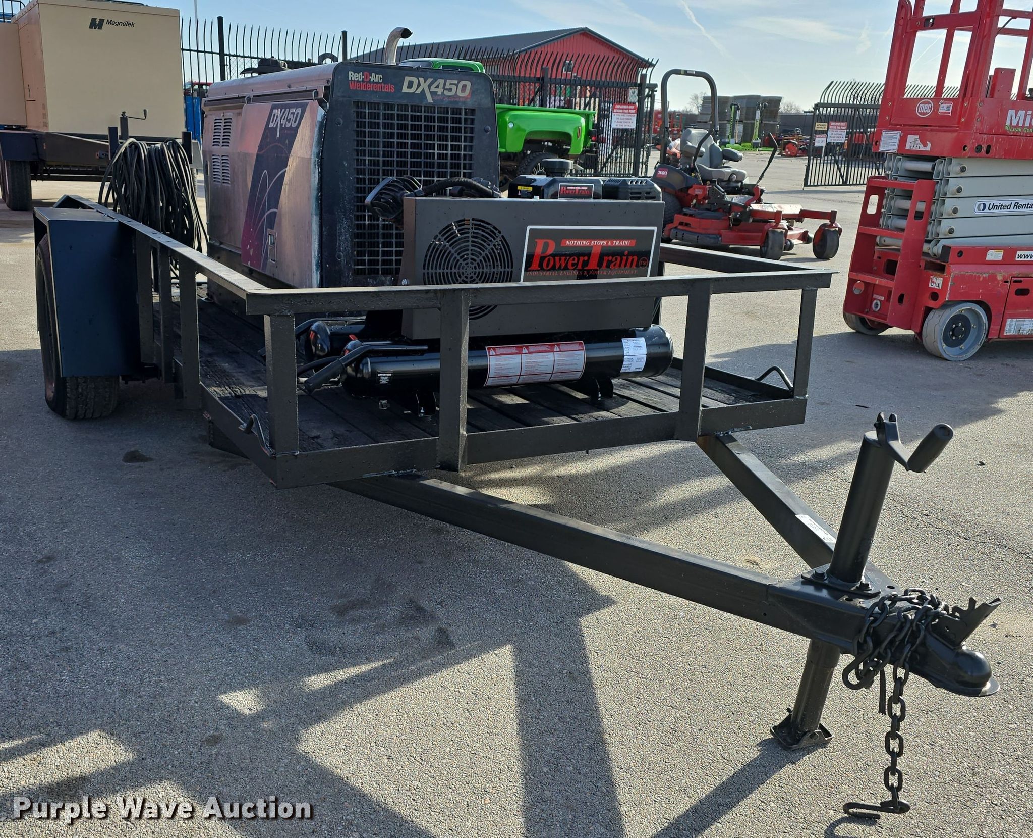 Red-D-Arc Welderentals DX450 welder/generator. Hours: 5,763 on meter. Engine Kubota V2403-M-ET08, Displacement: 2.4L, Cylinders: 4, Fuel type: Diesel. Features Welder Capabilities: CC, CV, DC, TIG, Stick, Leads, Trailer mounted, Generator Watts: 17,000, Phase: Three, 240V outlets: 1, 120V outlets: 4, Air compressor PowerTrain, Single cylinder 7HP gasoline engine, Capacity: 10 gallons, Maximum PSI: 150, Hose reel Air hose. Trailer 14' L x 80" W, Ball hitch size: 2", Suspension: Spring, Axles: Single, Tire size: ST205/75R15. Transfer of ownership documentation will be a bill of sale. Jordan Machinery/ S & N Auto Sales. Waterloo, NE 68069