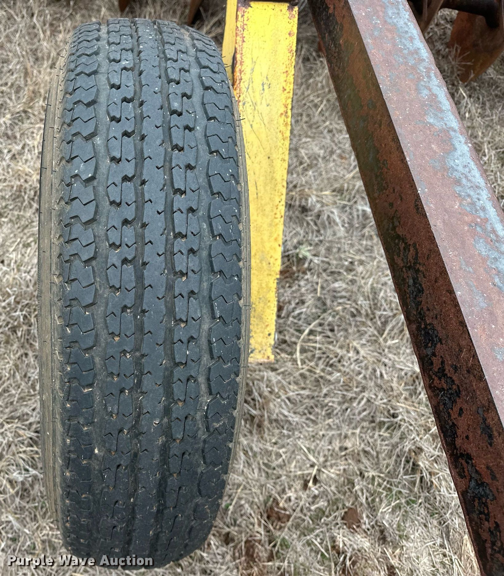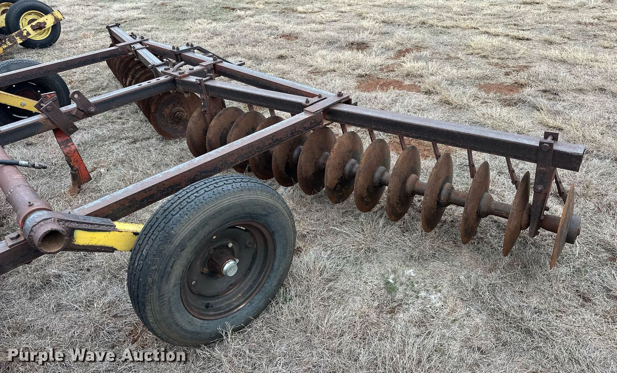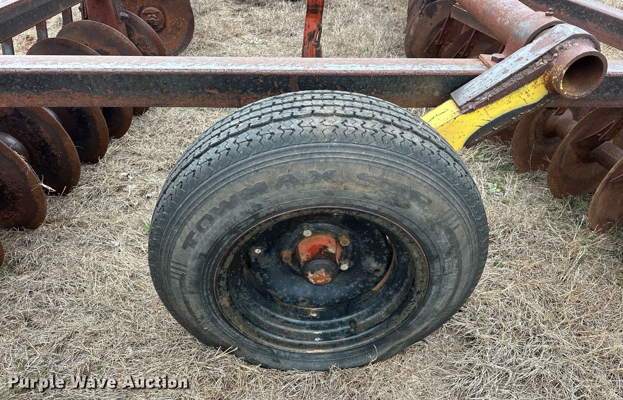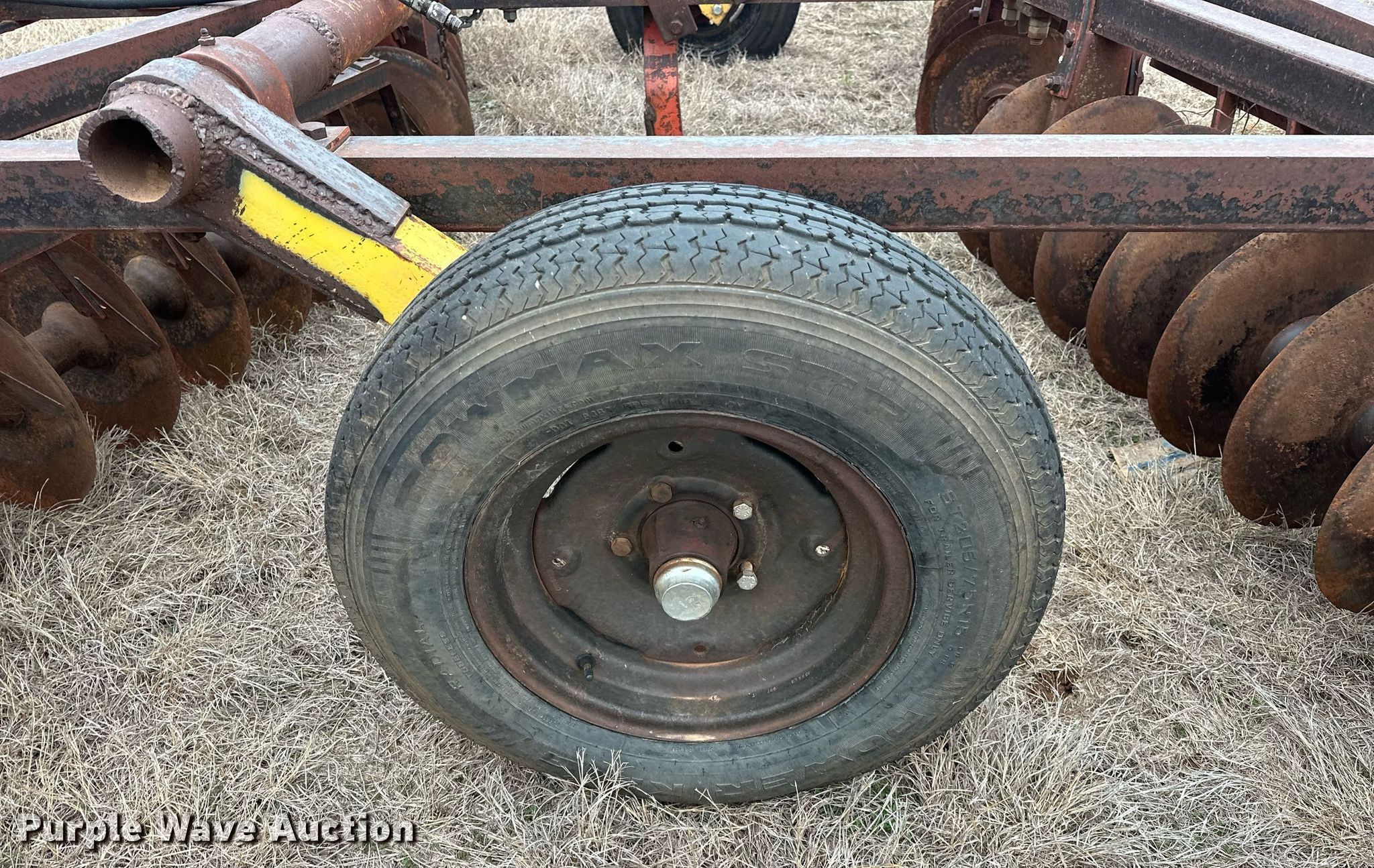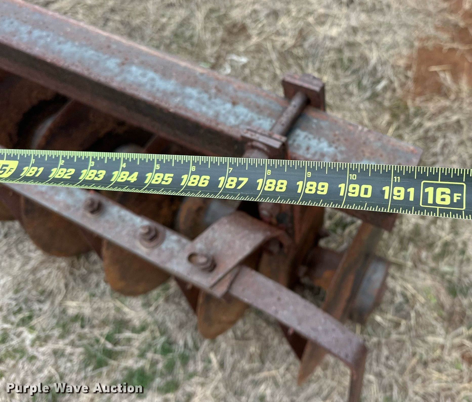 Tandem disk. Overall width: 16'. Features Front blades Diameter: 16", Spacing: 7", Rear blades Diameter: 16", Spacing: 7", Disk scrapers, Operation Hydraulic lift, Leveler: Manual. Tires Tire size: ST205/75R15. Notes Flat tires. Mutual, OK 73853