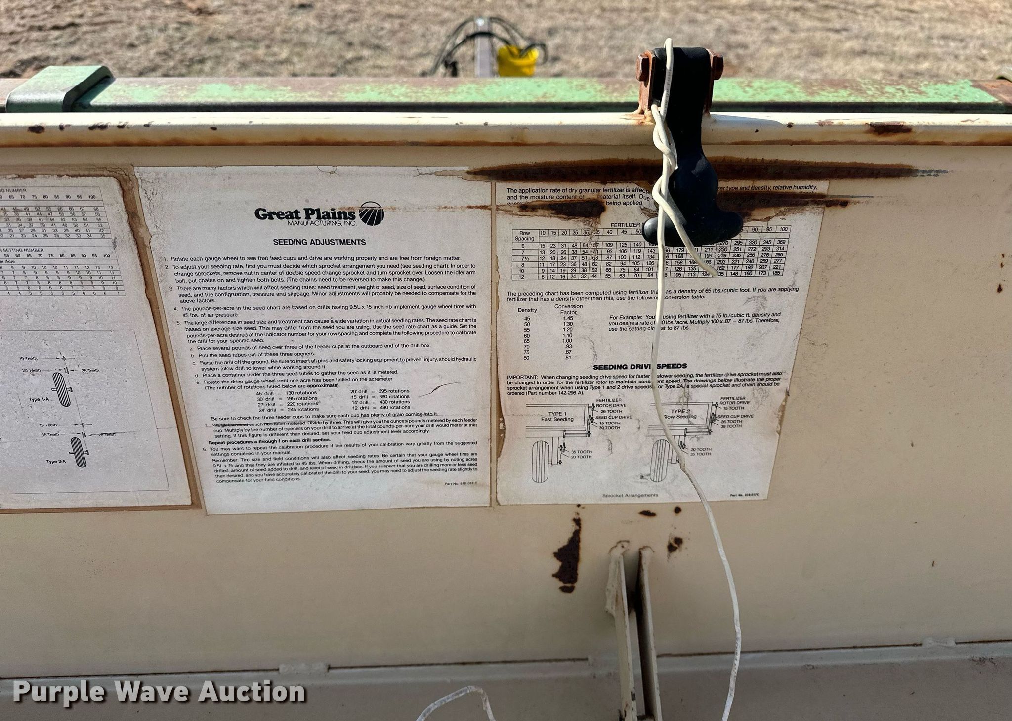 Purple Wave is selling a used Grain Drill or Seeder in Oklahoma. This item is a Great Plains Full Press 30 grain drill with the following: Width: 30', Row units: 45, Row spacing: 8", Serial: GP-3054