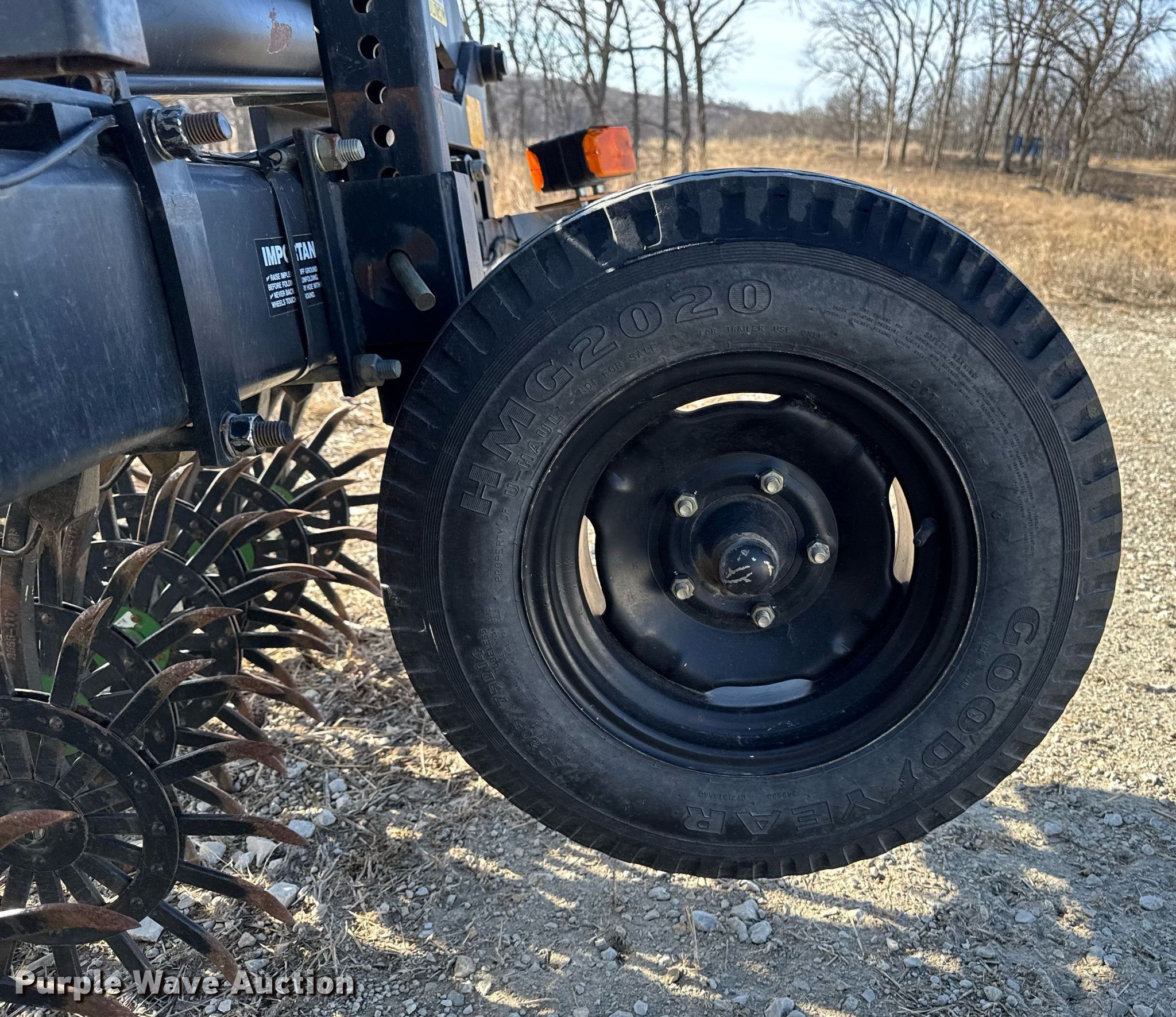 Yetter 3541 rotary hoe. Overall width: 41', Serial: 02151. Features Diameter: 20", Spacing: 3", Hydraulic fold, Transport lights, Hitch: Three point. Tires Tire size: 205/75D14, Gauge wheels. Allendan Seed Co. Winterset, IA 50273