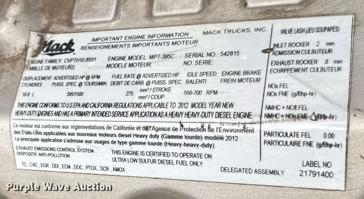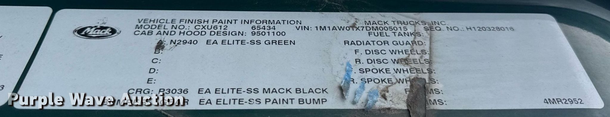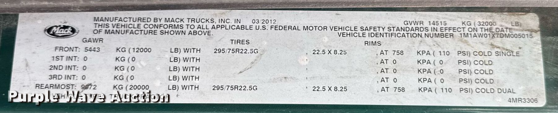 2013 Mack CXU612 semi truck. Miles: 924,664 on odometer, VIN: 1M1AW01X7DM005015. Engine Mack MP7 395C, Displacement: 10.8L, Cylinders: 6, Fuel type: Diesel. Transmission Eaton Fuller, Manual, Speed: 10. Chassis Axles: Single, Suspension: Air, Brakes: Air, GVWR: 32,000 lbs FAWR: 12,000 lbs, RAWR: 20,000 lbs. Interior AC, Heat, Heated mirrors, Cruise control, Air ride cab. Features Fifth wheel type: Fixed, Fuel tank: Dual. Tires Size: 295/75R22.5. Notes Dash warning indicator: Fault Code, Dead battery, Drivers door handle issues, does not always latch. Indiana title. Title distribution may be delayed up to 14 days from verification of funds. Interfreight Inc. Gary, IN 46406